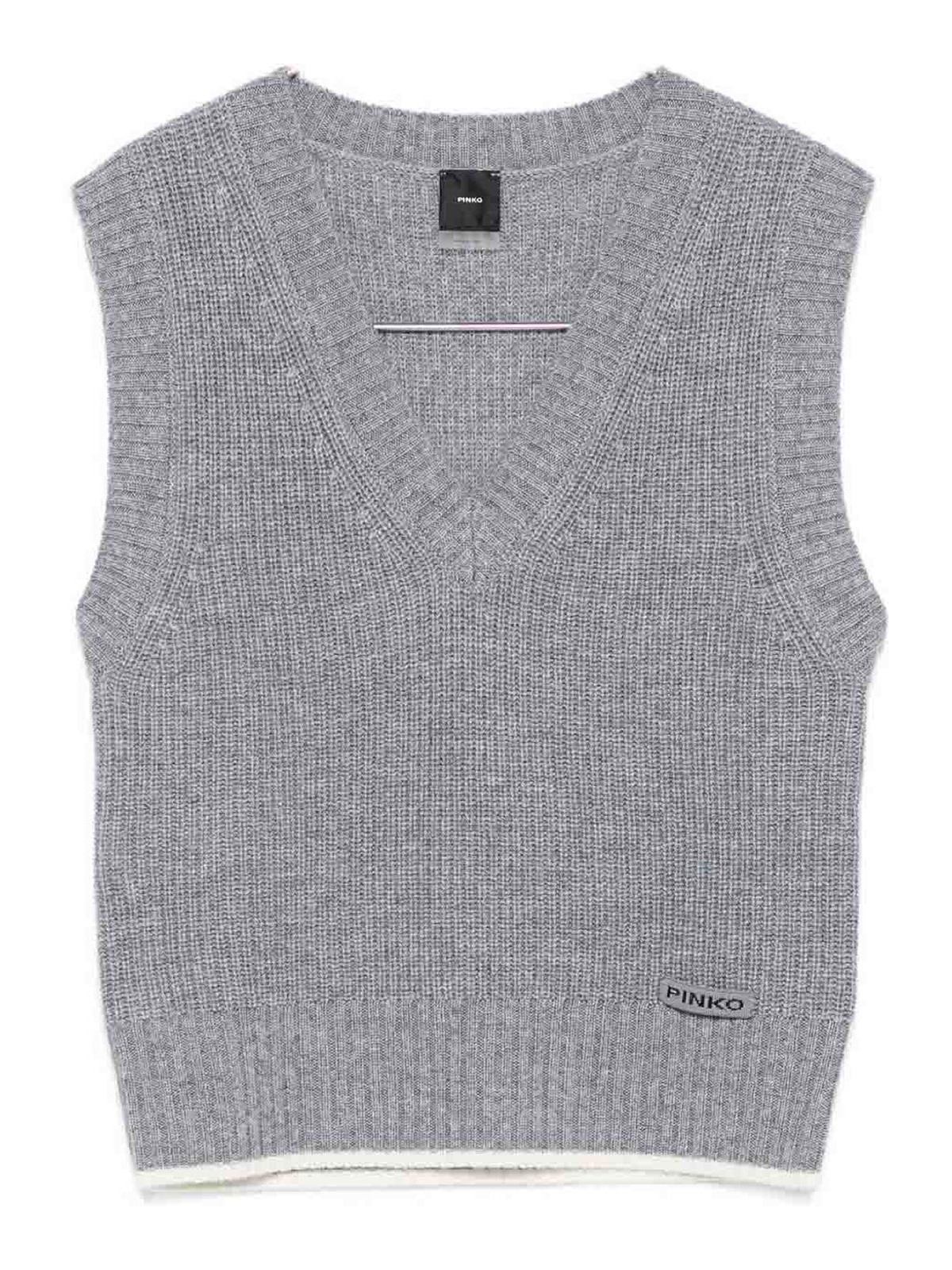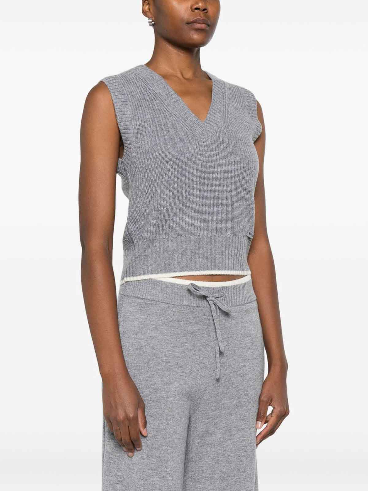 グレー Vネックリブニットノースリーブクロップドホワイトトリム