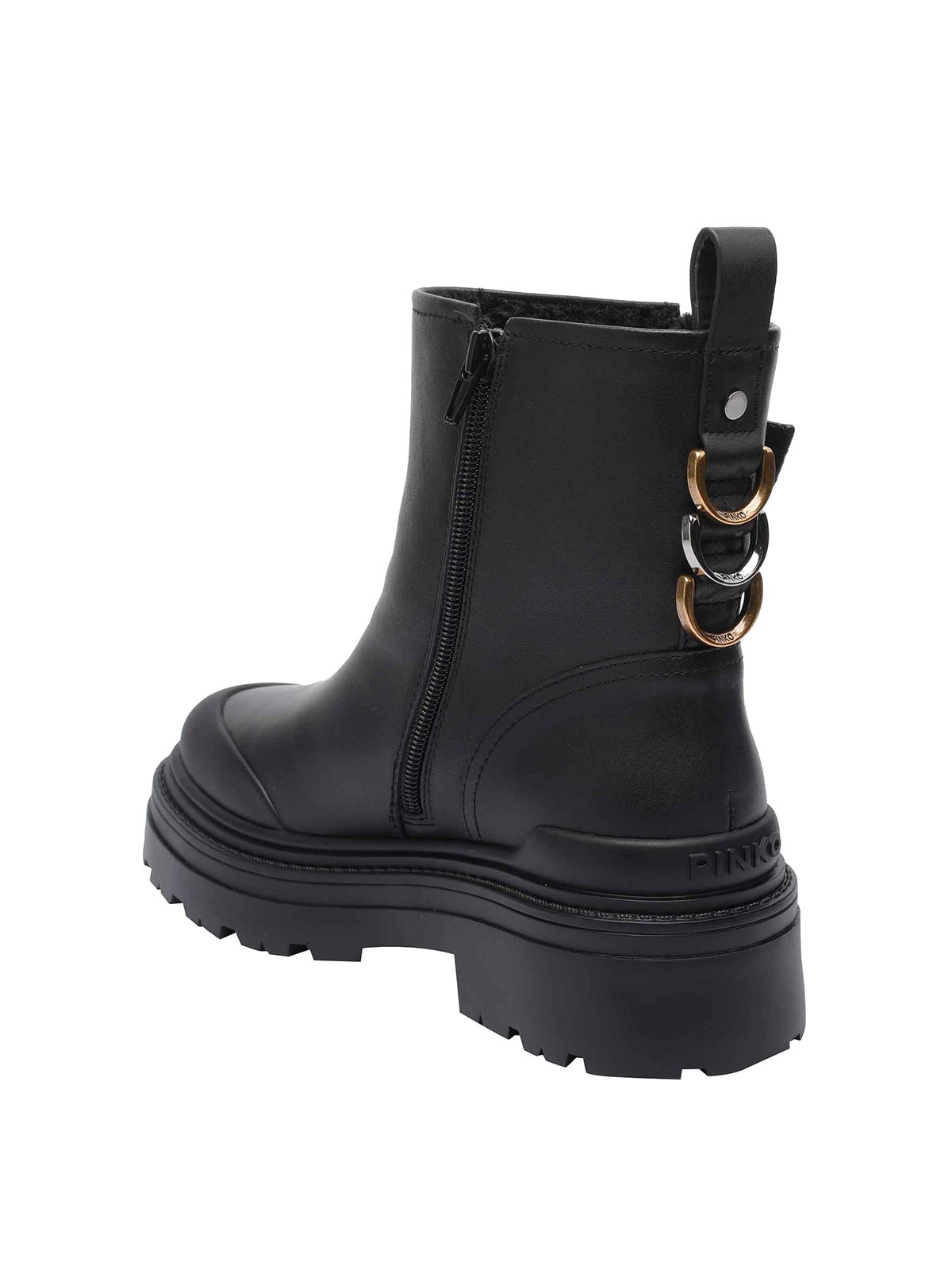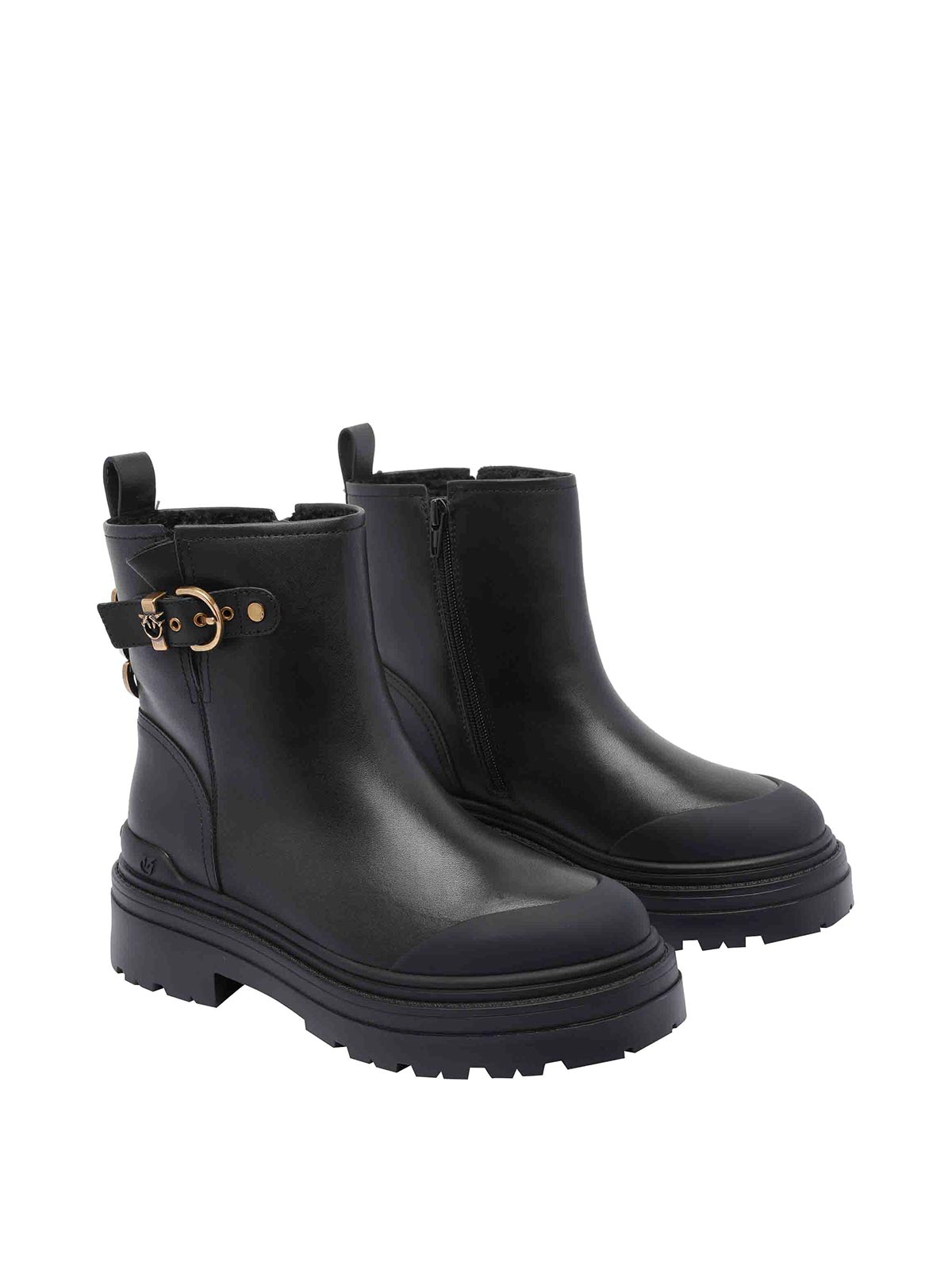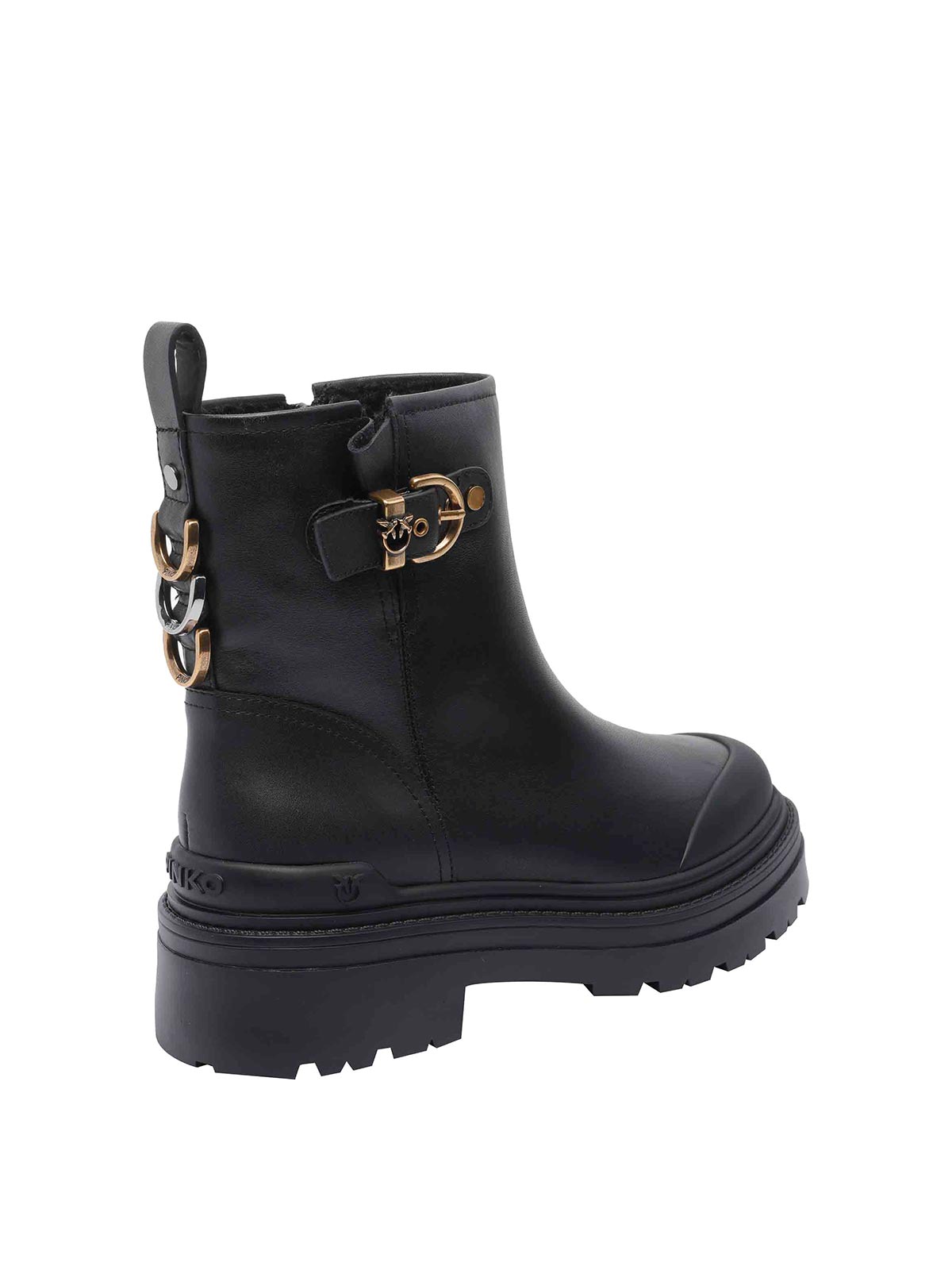 Pinko ブラックミアブーティーラウンドトゥラテラルバックルロゴラテラルジッパー付きデザイナーカラー名:ブラック