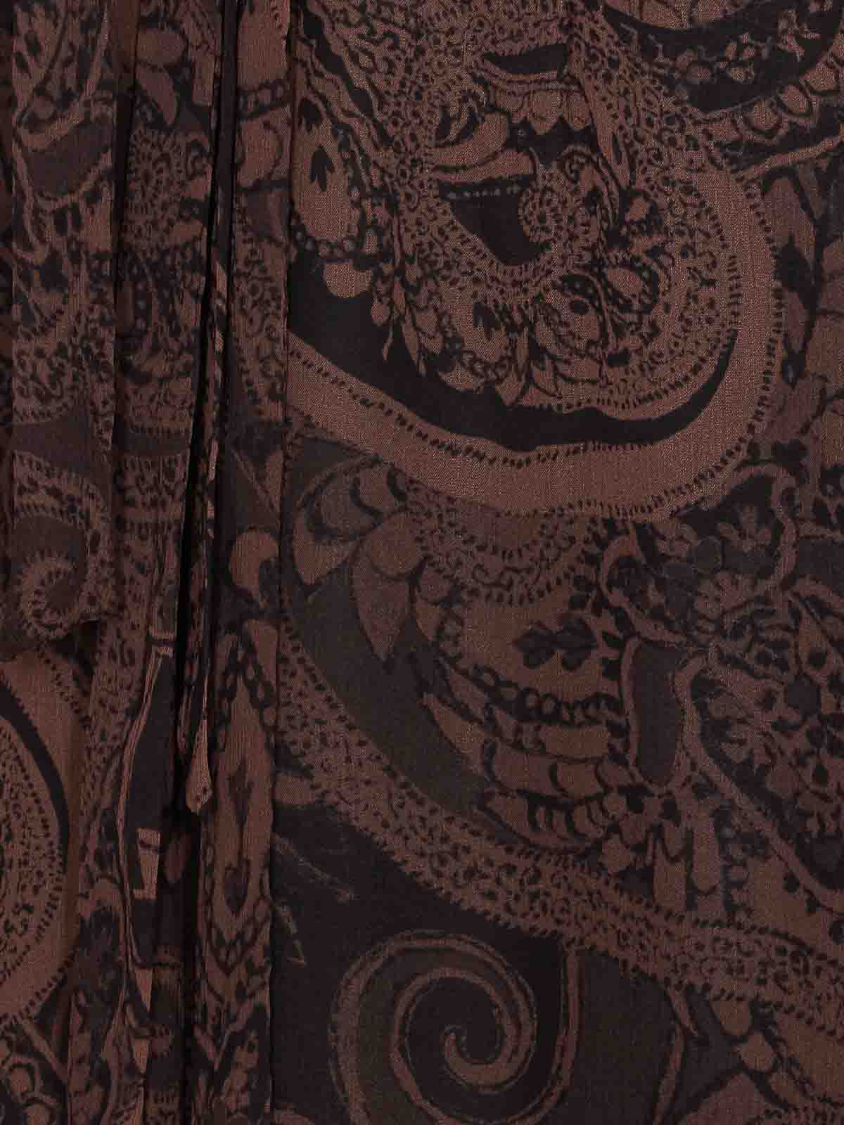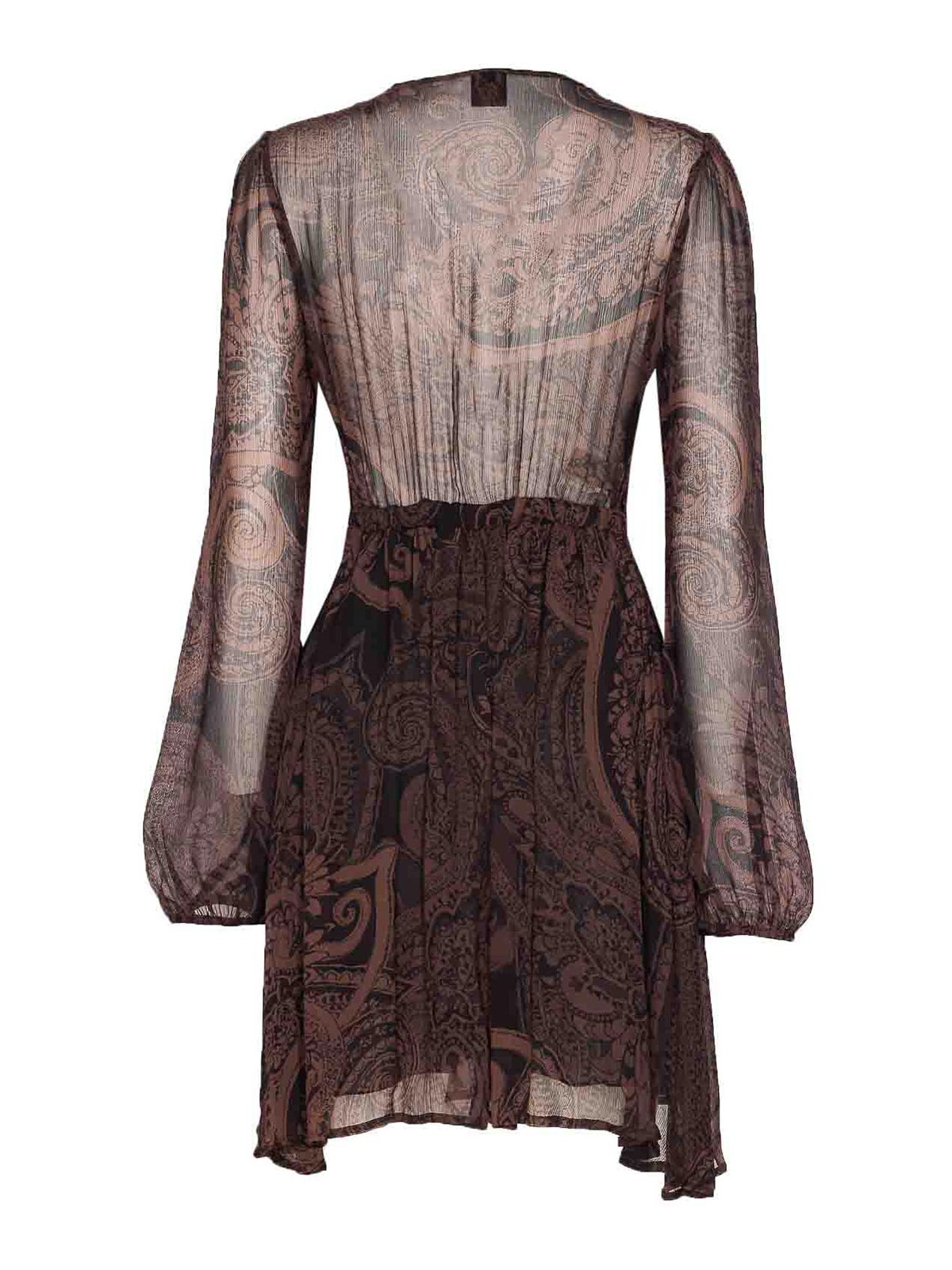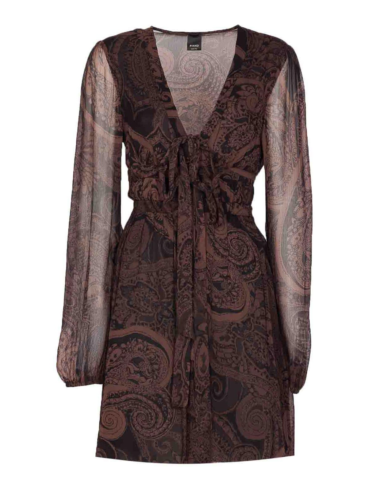 Pinko ダークブラウンドレス、ミニモデル、Vネック、ロングスリーブ、ペイズリープリント、フロントリボンディテール