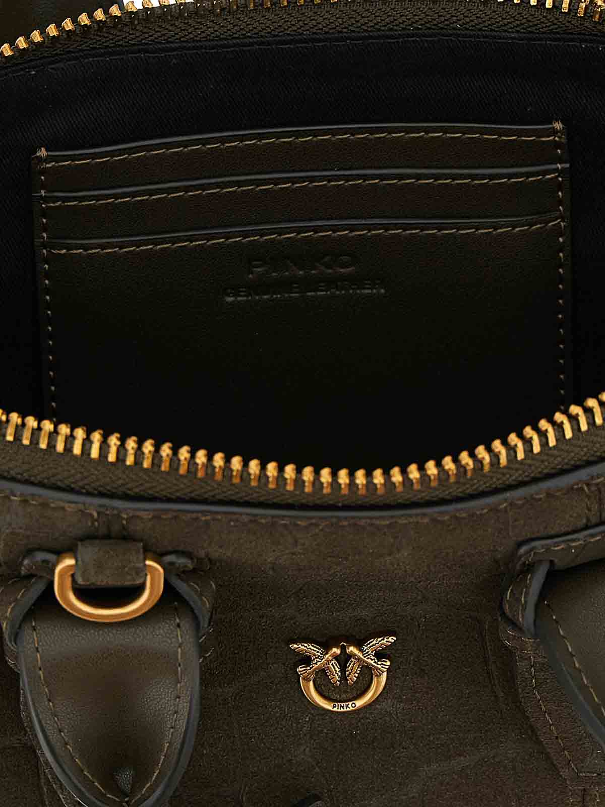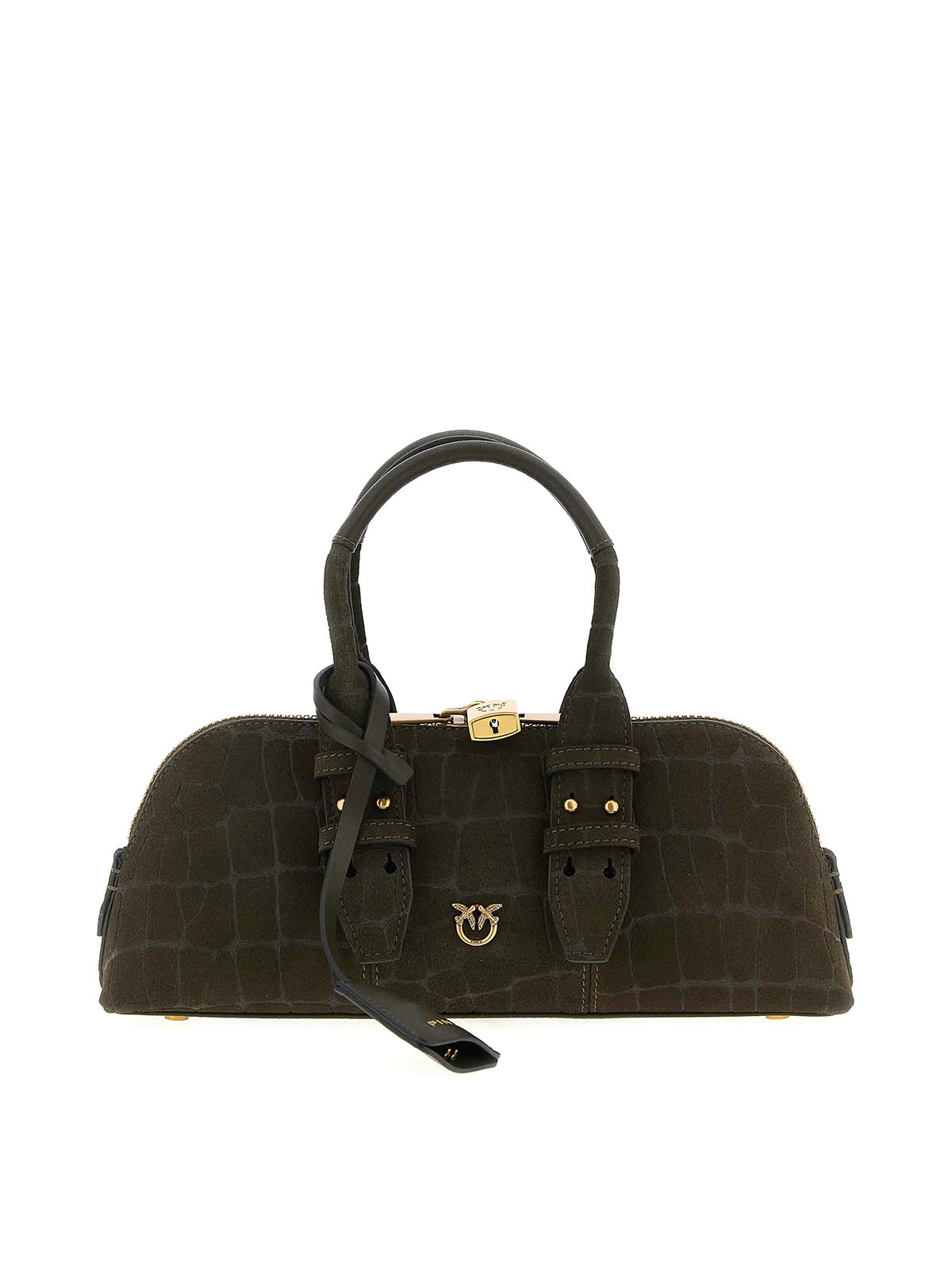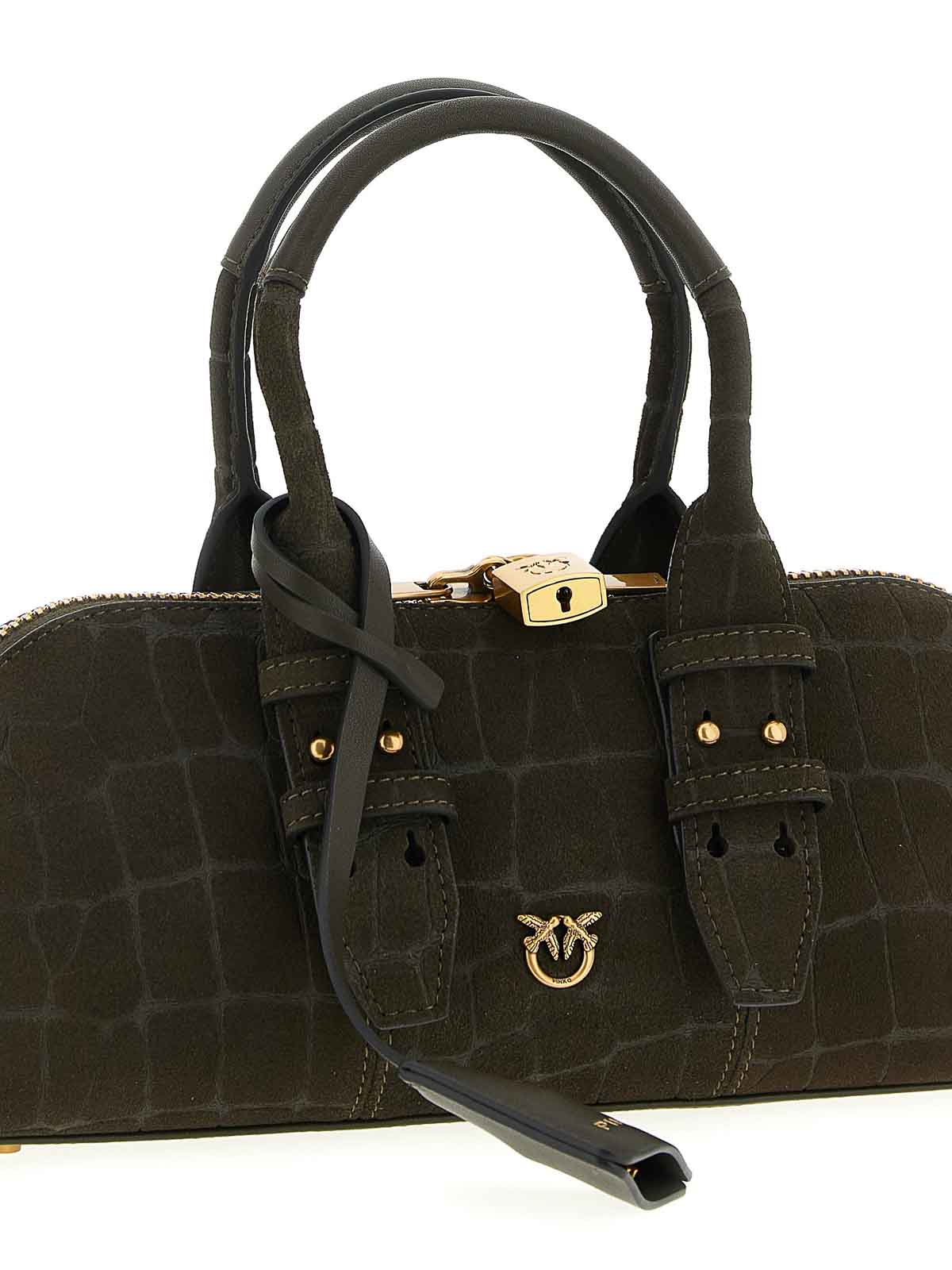 小さな「エスケープバゲット」ココナッツプリントのスエードボウリングハンドバッグ。前面にメタルの「ラブバーズ」のロゴが入り、背面に刺繍が施されています。ダブルアジャスタブルハンドル、南京錠のディテールが施されたトップジッパー、金属製の脚が付いた硬いベース、コットンの裏地、取り外し可能なチャーム、調節可能で取り外し可能なショルダーストラップ。