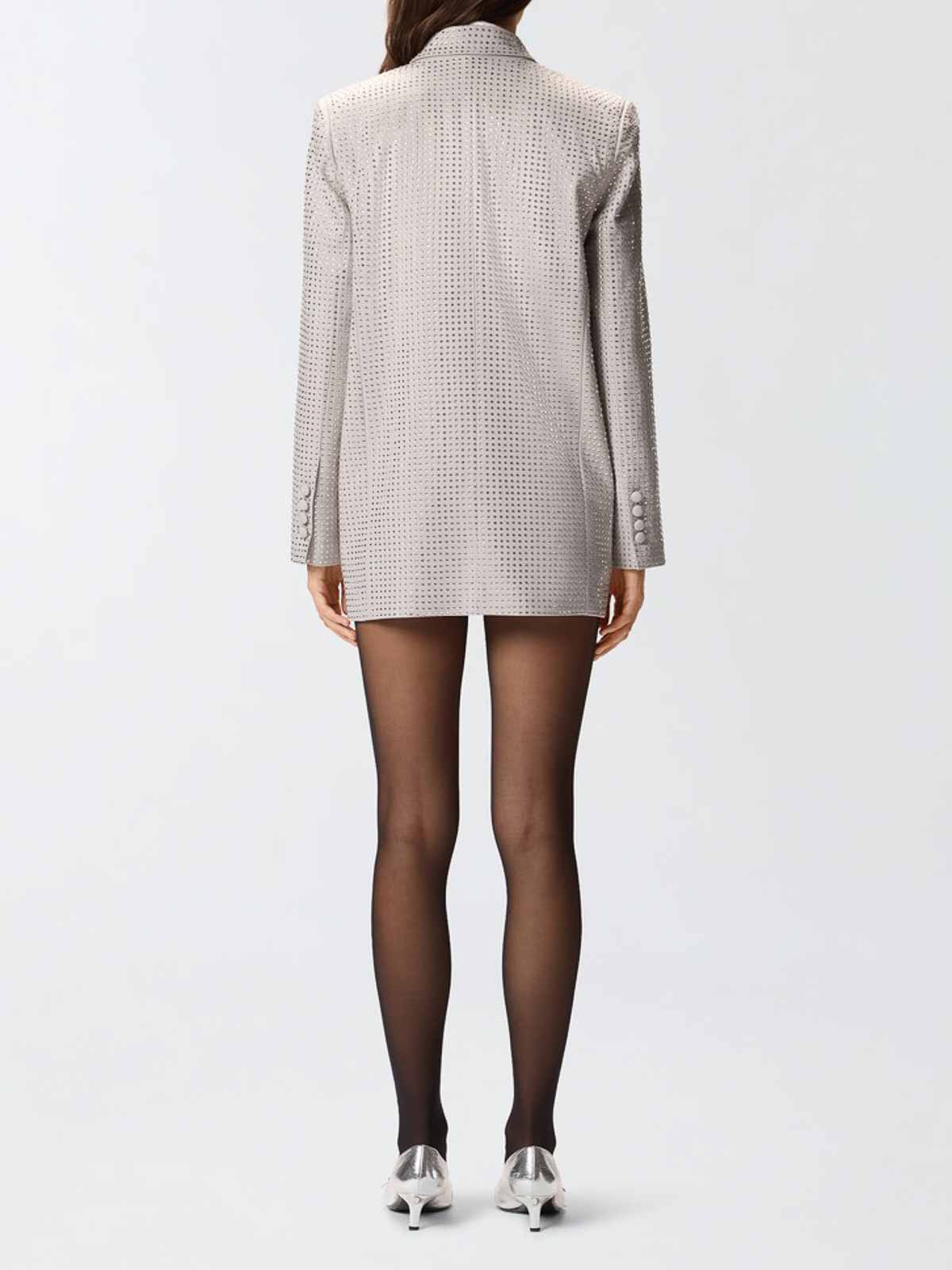 Pinko オーバーサイズのラインストーン付きダブルブレストブレザー。糸染めストレッチビスコース混紡生地で作られ、衣服の表面全体にラインストーンのアップリケがあしらわれています。ボタンで留めるダブルブレストのシルエット、i