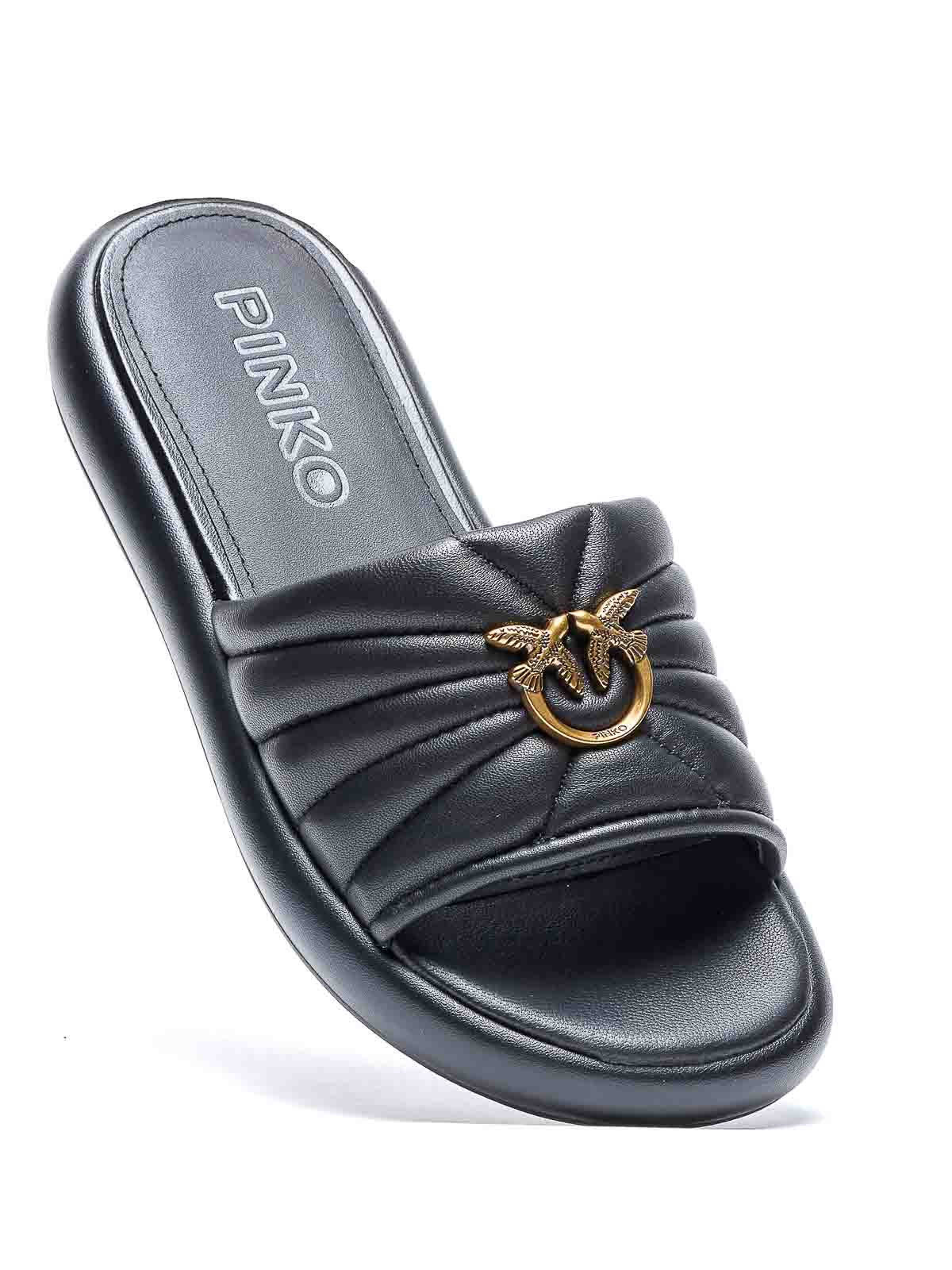 Pinko ブラックフィオナサンダル、ラウンドトゥ、正面ゴールドロゴ、レザーアッパー