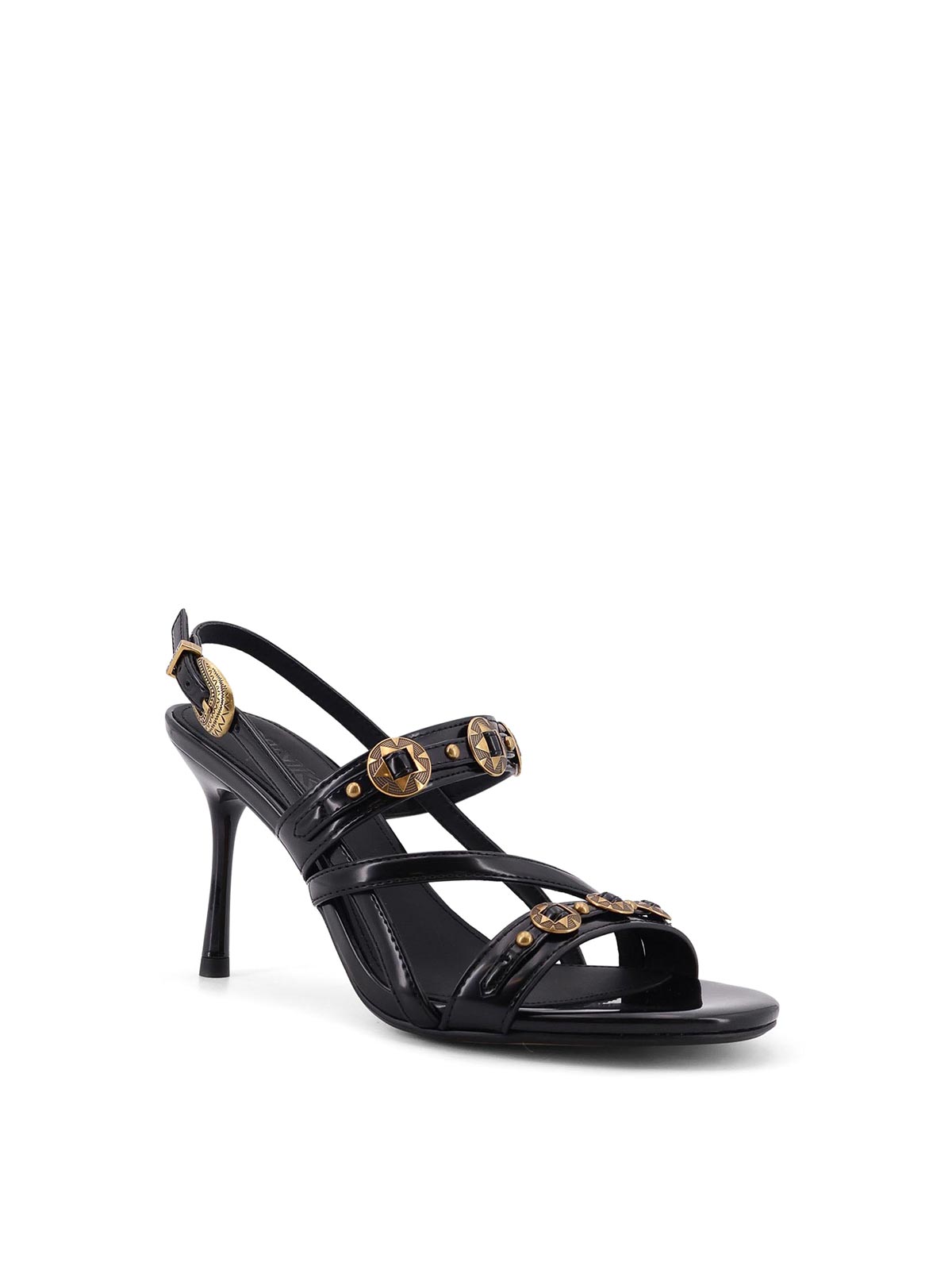 丸いつま先、メタルバックル付き調節可能なストラップ、メタルアプリケーション、カバーヒール、レザー、ヒールの高さ:8 cm。