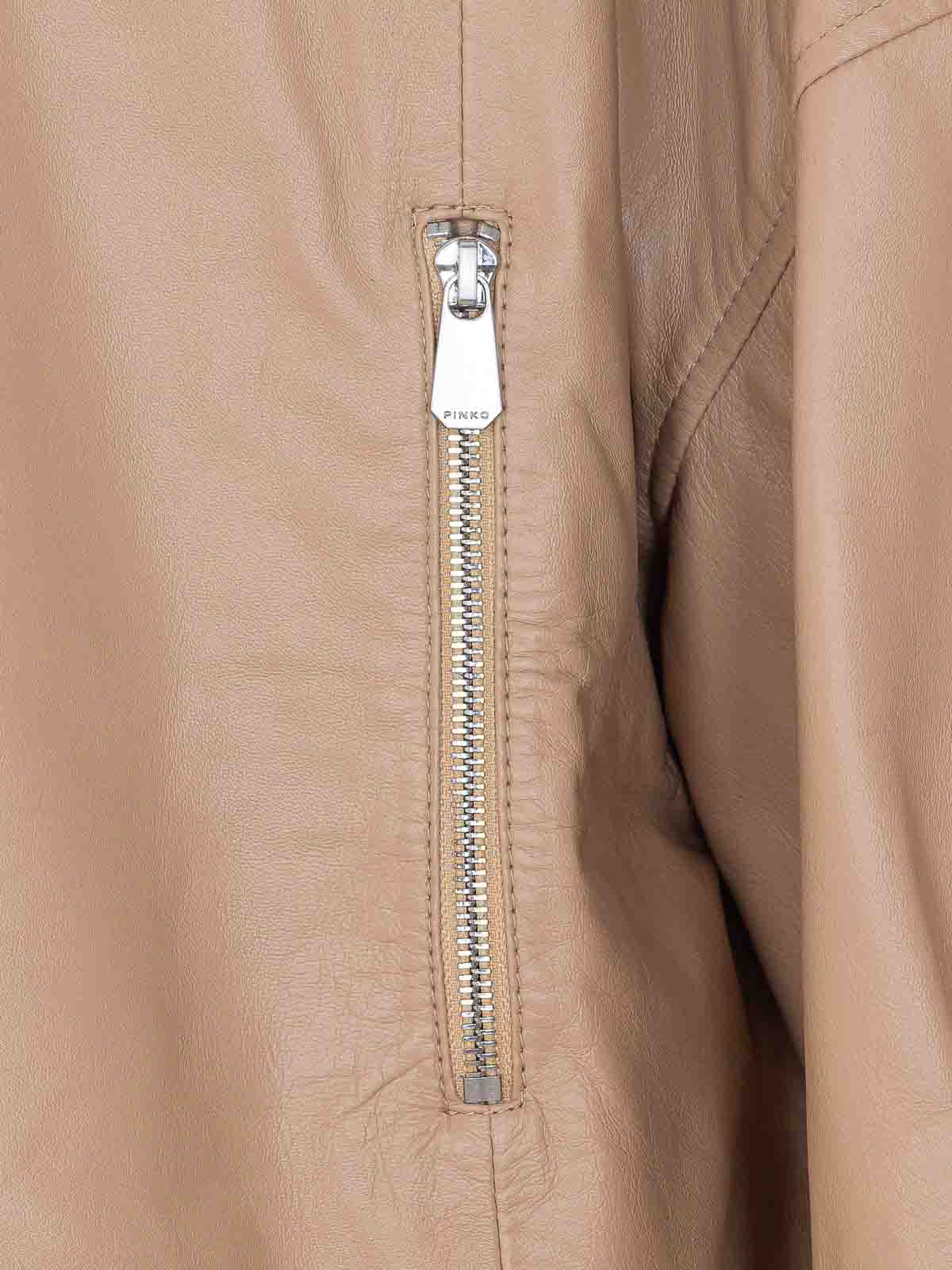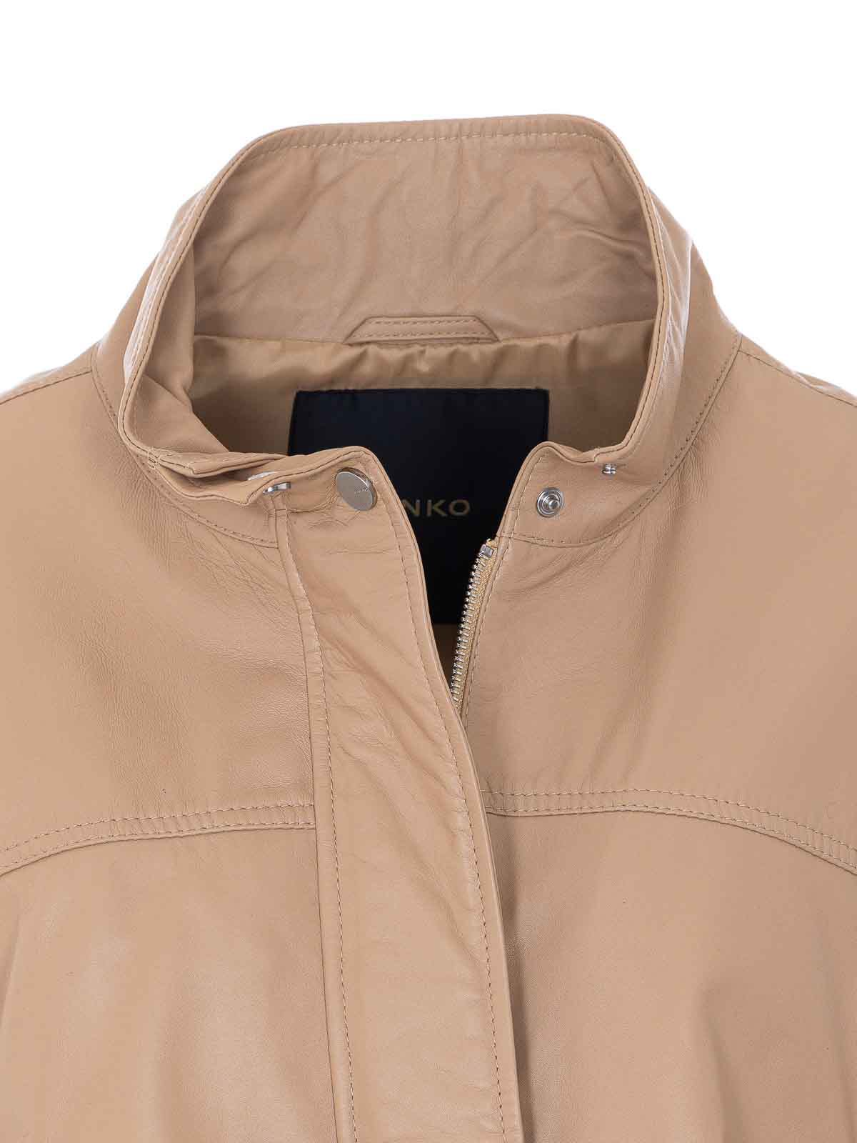 Pinko ベージュベイリーレザージャケット、ファスナーとボタン留め、ハイネック、前面にファスナー付きポケット