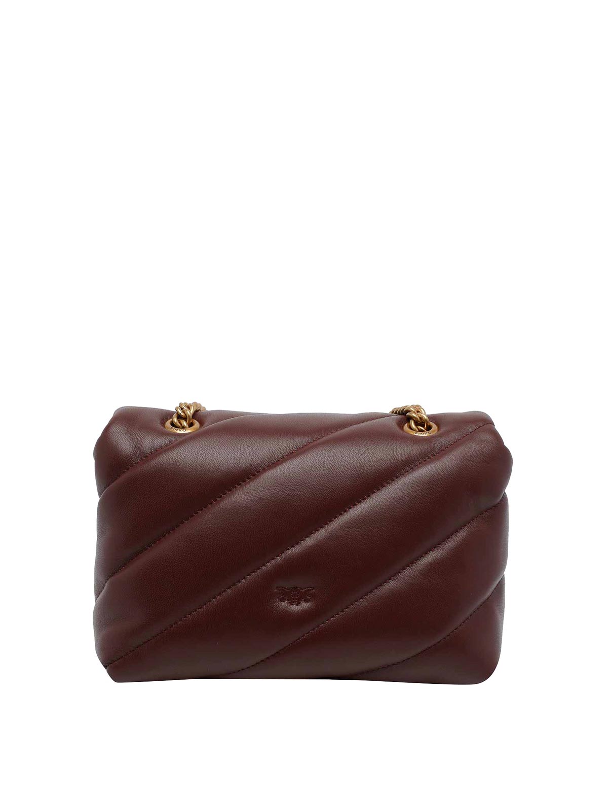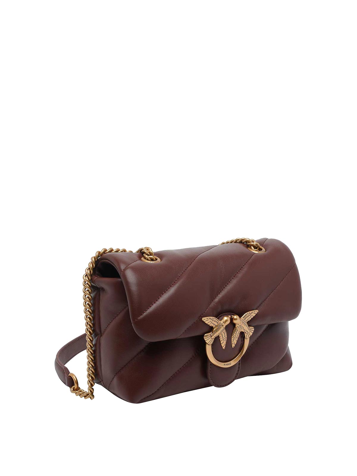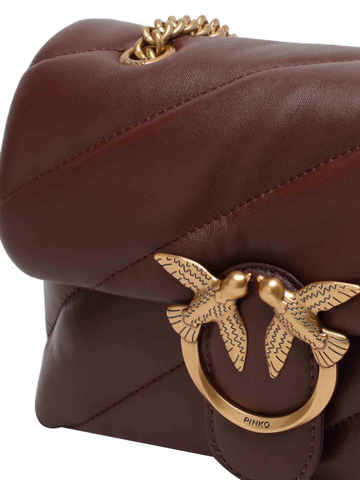 Pinko Burgundy love ミニパファーショルダーバッグ、マグネットインターロッキングクロージャー、2つのコンパートメント、1つはオープン、もう1つはマグネット付き、内側にジッパーポケット、オープンポケット1つ、チェーン付きストラップ、フロントにゴールデンロゴ