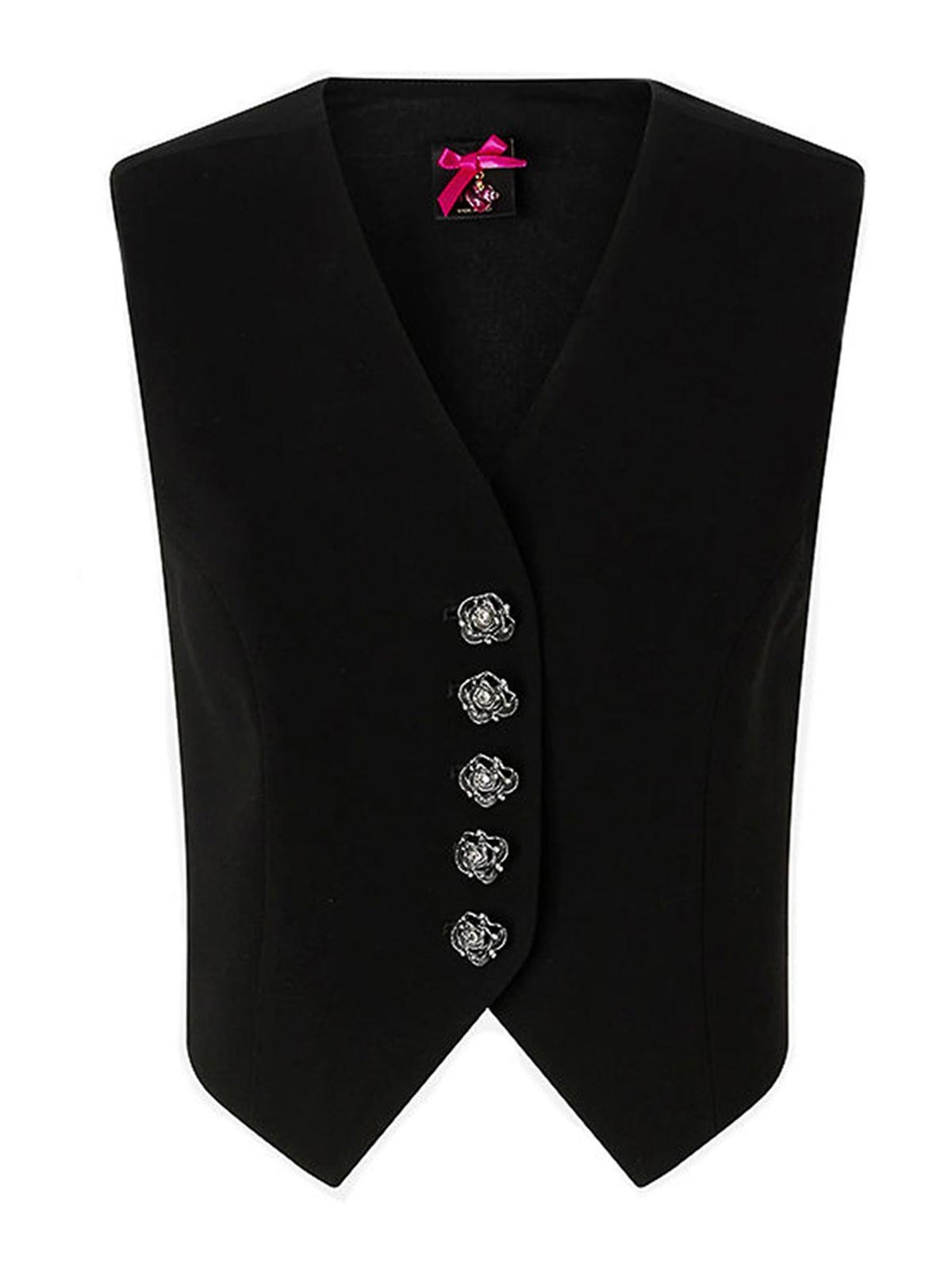 クラシックなキャディを思わせるアイコニックな生地であるストレッチビスコース製のジュエリー付きローズボタン付きピンコウェストコート。Vネックとダブルポインテッドヘムが特徴です。背面の官能的な透明インサートとローズシェイプのボタン留めが際立ちます