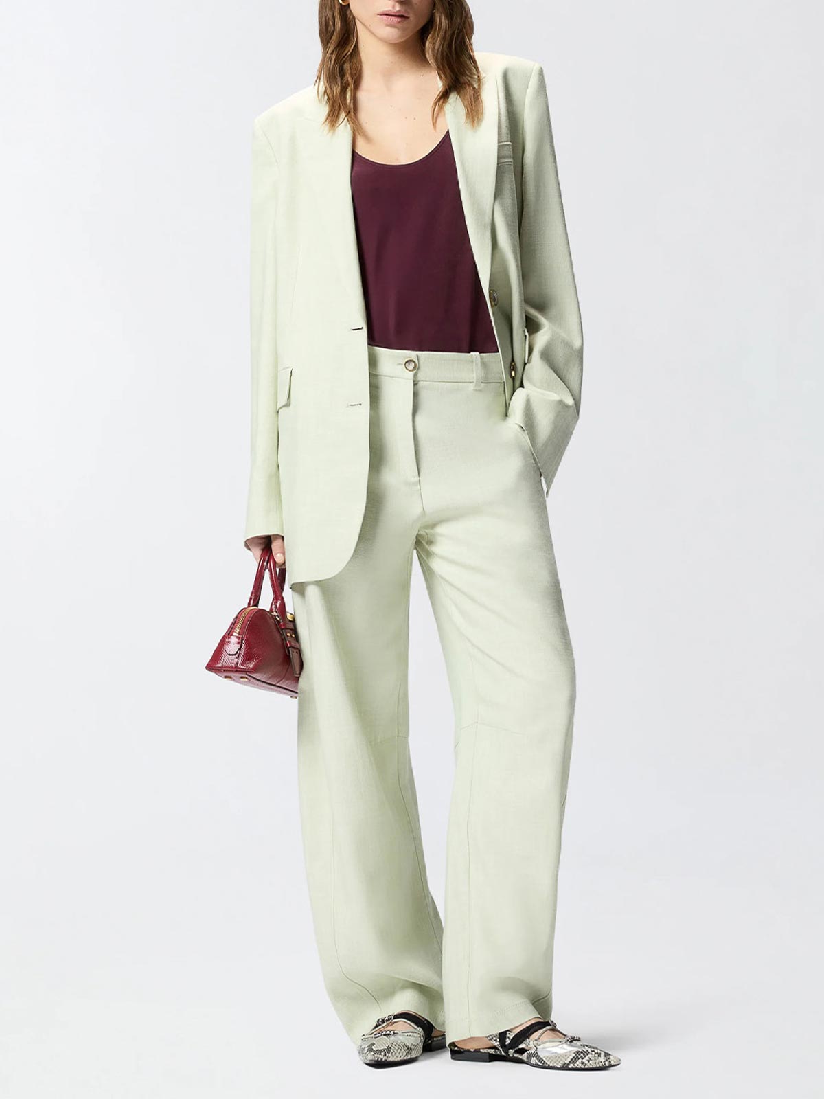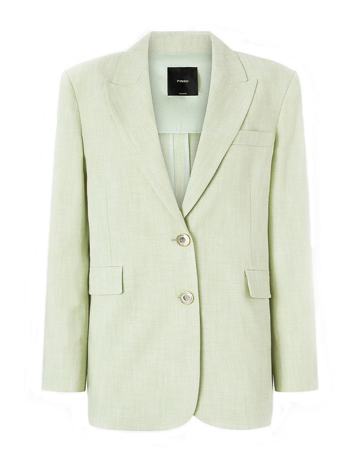 Pinko ラスティックエフェクトのシングルブレストジャケット。ストレッチの効いた流れるような効果のあるパナマファブリック製で、ピークラペル、フロントフラップポケット2つ、胸にウェルトポケット、袖口の洗練されたスリットが特徴で、シングルブレストの2ボタン留めが特徴です。