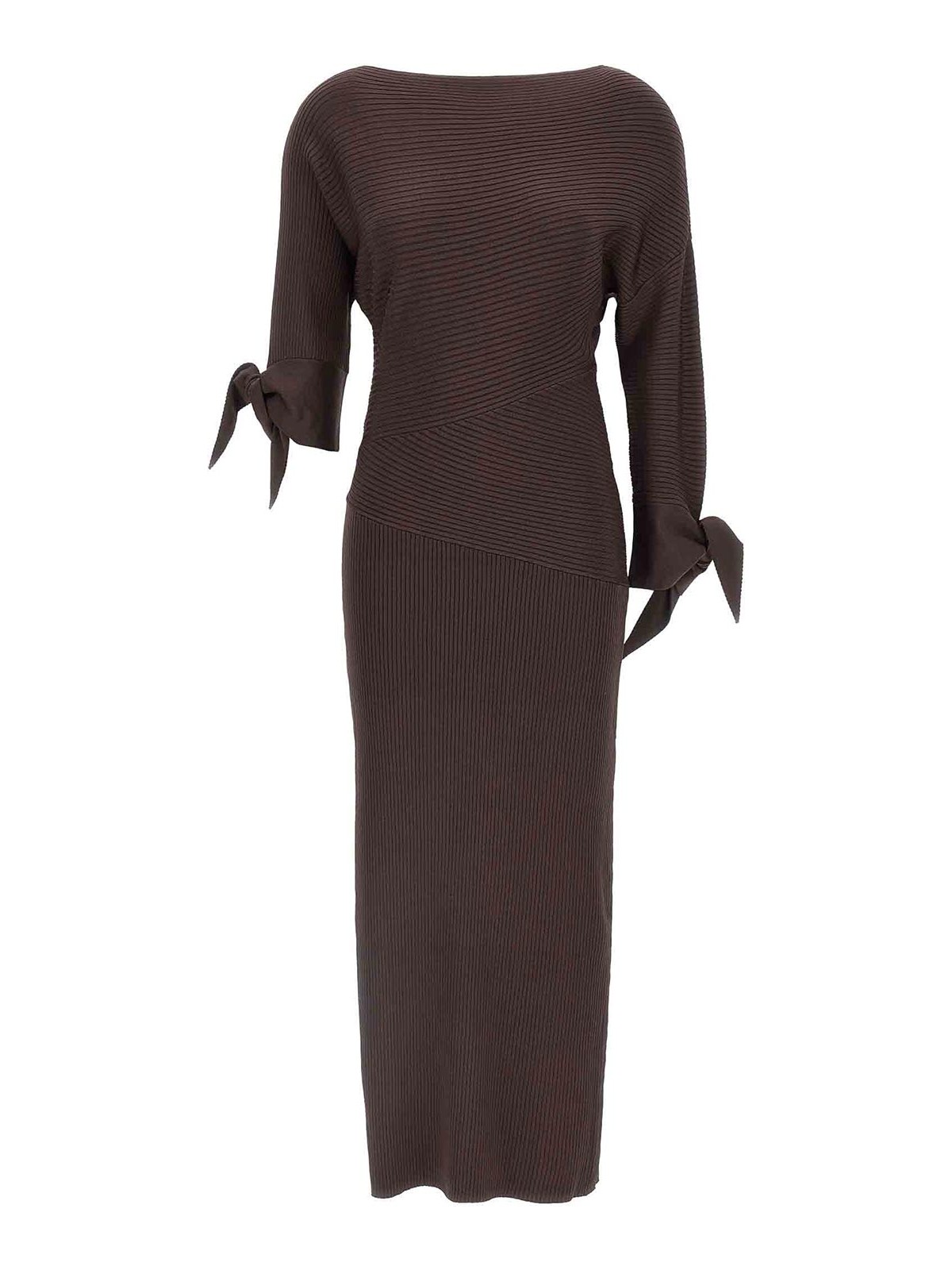 光沢のあるリブ編みのレーヨンで仕立てた「ブリナ」ロングドレス、肩をむき出しにしたアシンメトリーなネックライン、シンプルな結び目やリボンで留めるバンダナ風のフラップが2つ付いたロングスリーブ、サイドスプリット。
