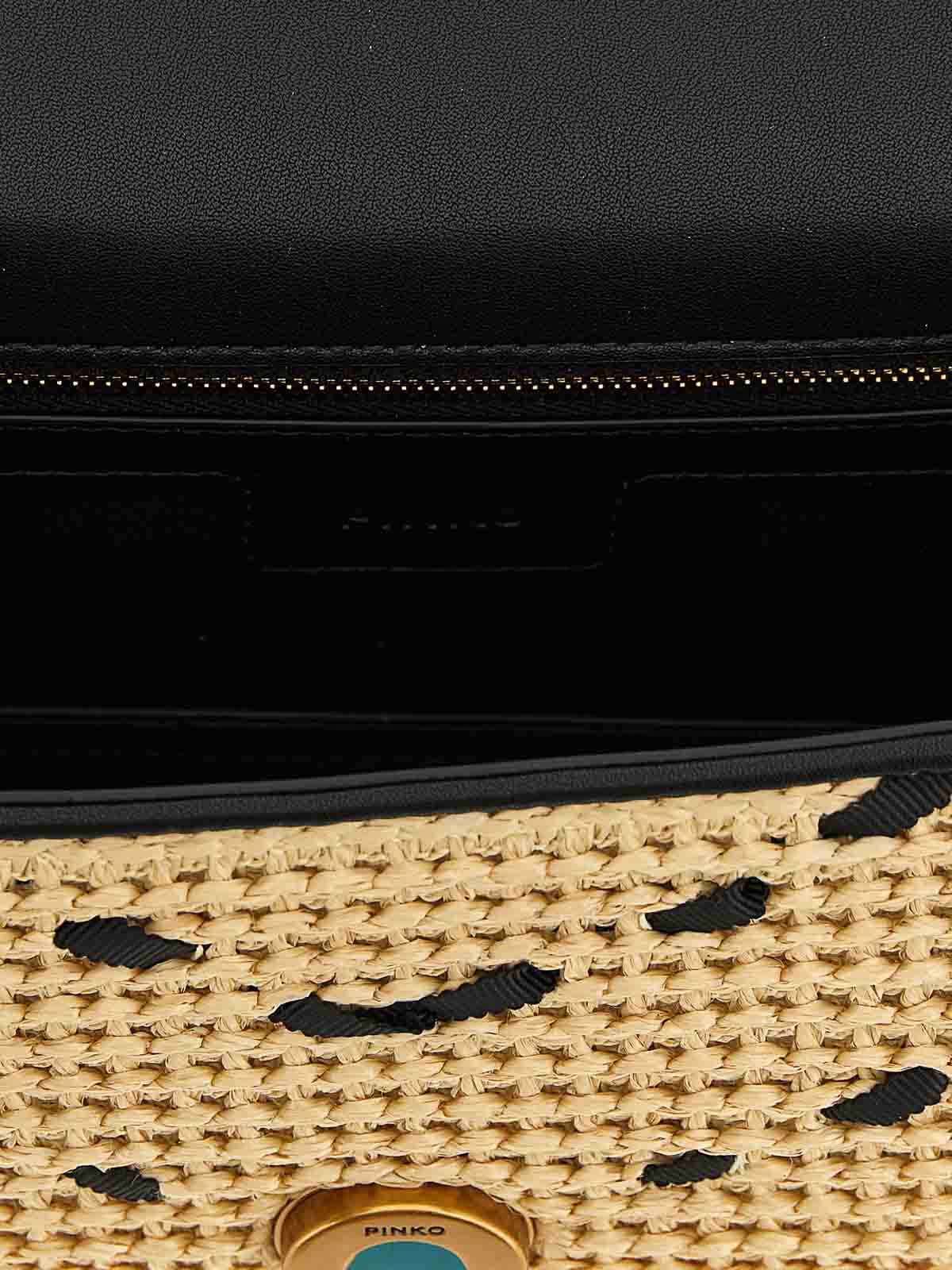 コントラストテープのシェブロンパターンとシルクの手持ちレザーのディテールが施された「mini love one light」ウーブンラフィアクロスボディバッグ、フロントメタルの「ラブバードダイヤモンドカット」バックル付きマグネットフラップクロージャー、レザープロテクション付きチェーンショルダーストラップ。