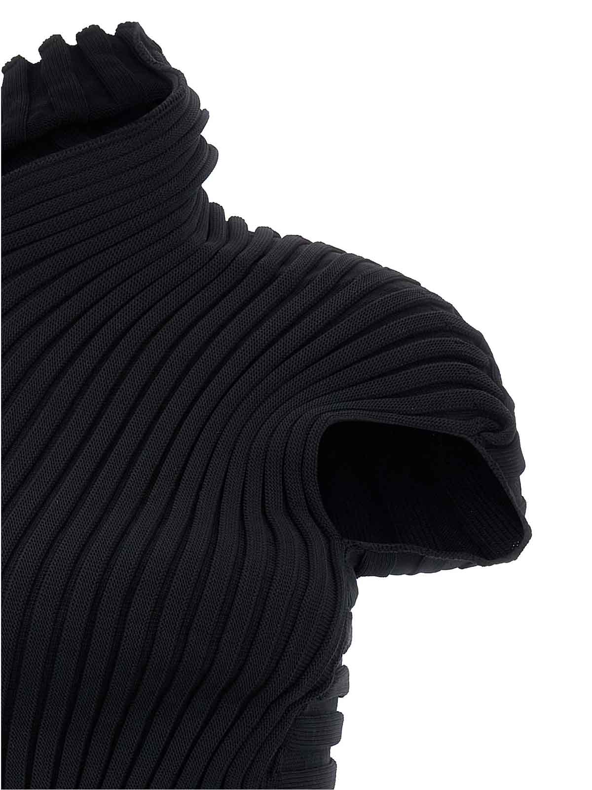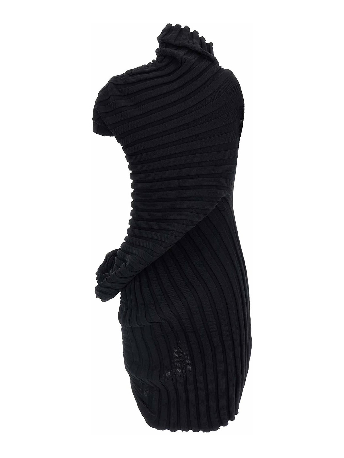 ニット (そのまま) のリブ編みのミニドレスは、サイドに継ぎ目のないニットテクノロジーを採用し、ハイネックのノースリーブでアシンメトリーな裾に仕上げました。