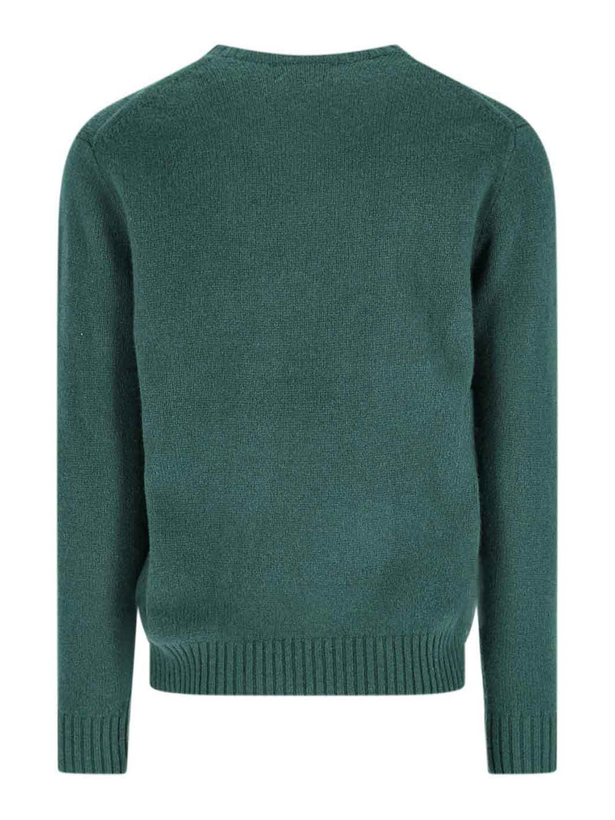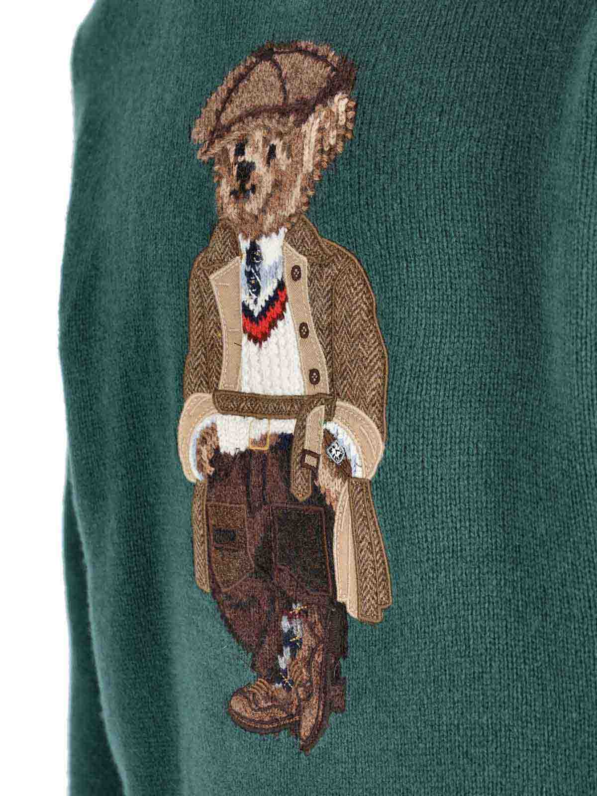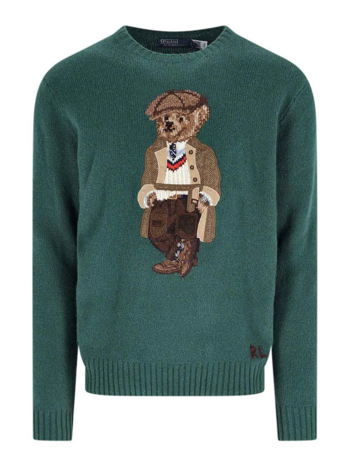 Polo Ralph Lauren Polo Bear セーター、グリーンウール、ニット、クルーネック、前面にマルチカラーのコントラストの効いたロゴ、サイドロゴ刺繍のディテール、リブ仕上げ、ストレートヘム。
