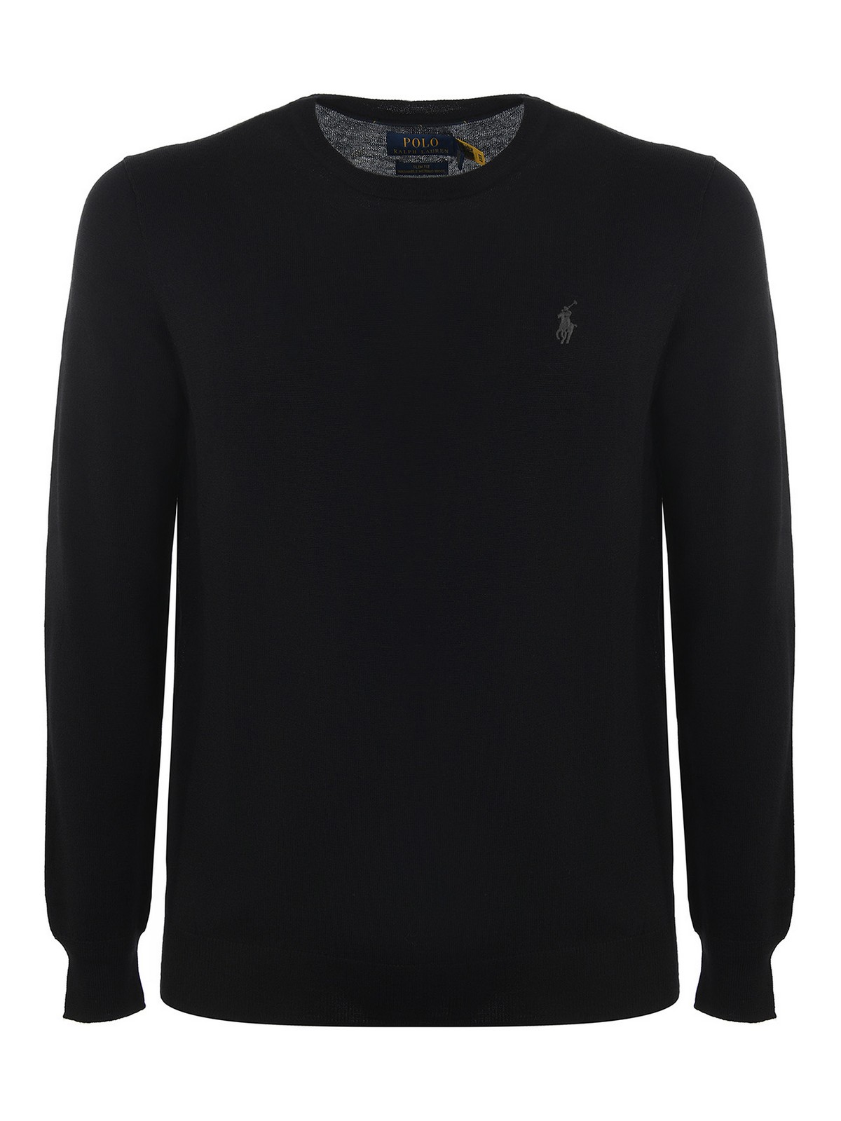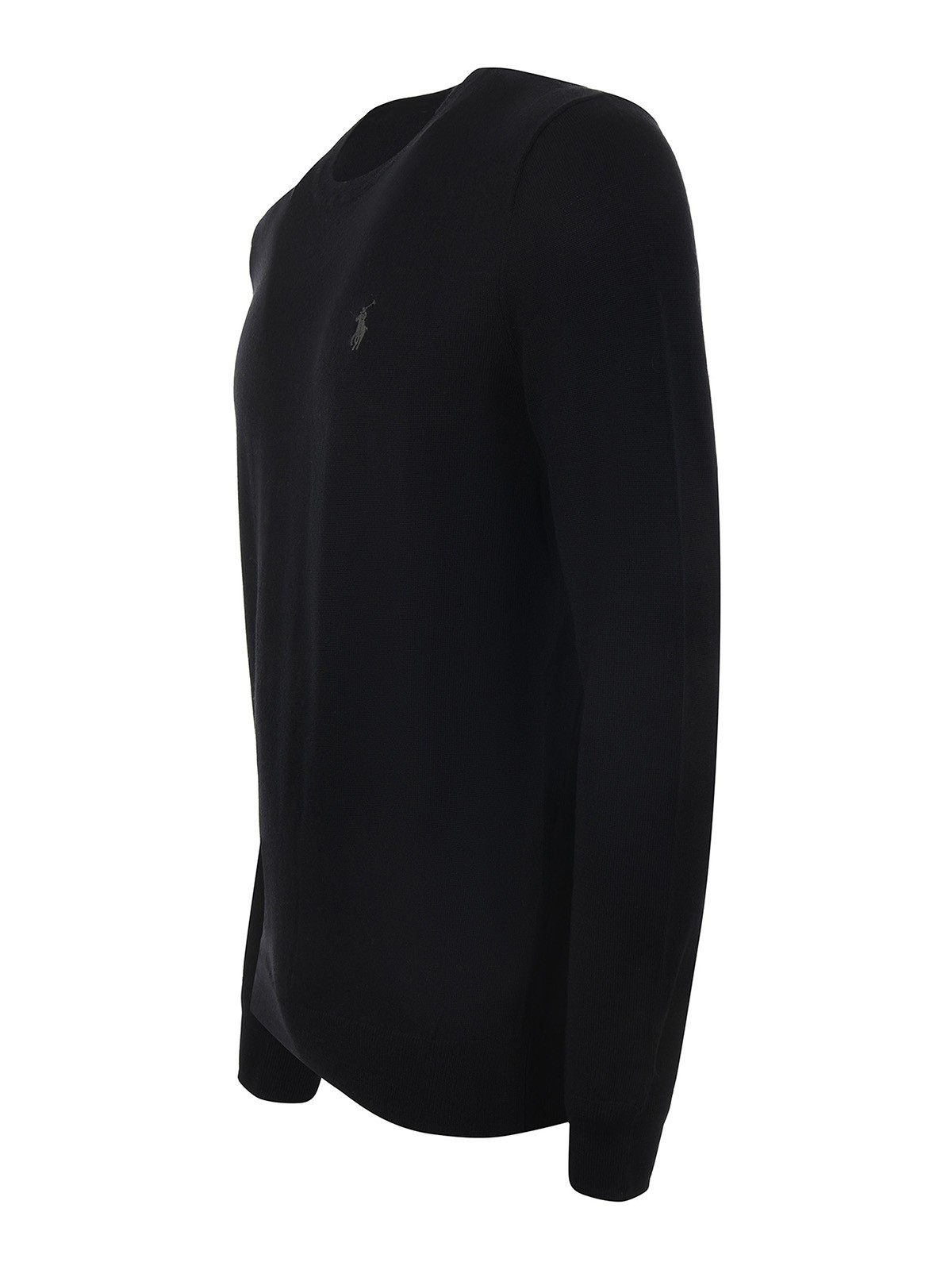 メリノウールブラックのポロラルフローレンセーター、リブ編みのクルーネック、長袖、リブ編みの袖口とボトム、スリムフィット、フロントロゴ刺繍。