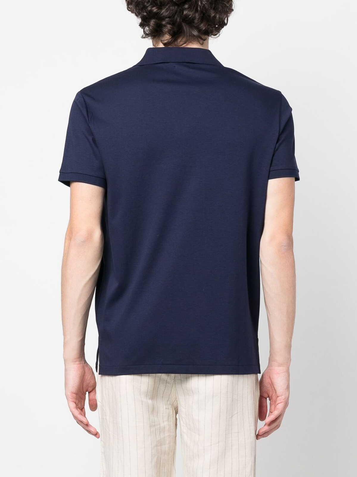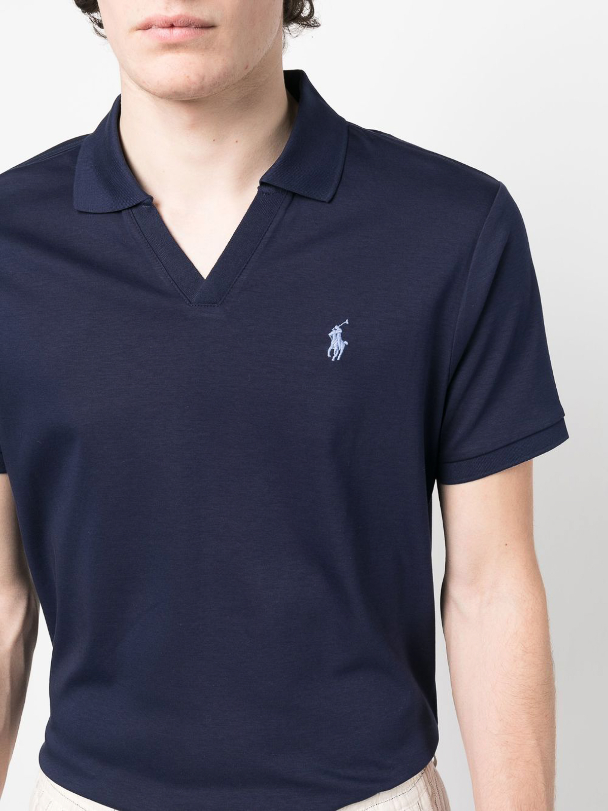 polo Ralph LaurenのVネック半袖ポロシャツは、ミッドナイトブルーのコットンシグネチャーポロポニーモチーフ、胸に刺繍されたロゴ、ポロカラー、Vネック、留め具なし、半袖、ストレートヘムが特徴です。
