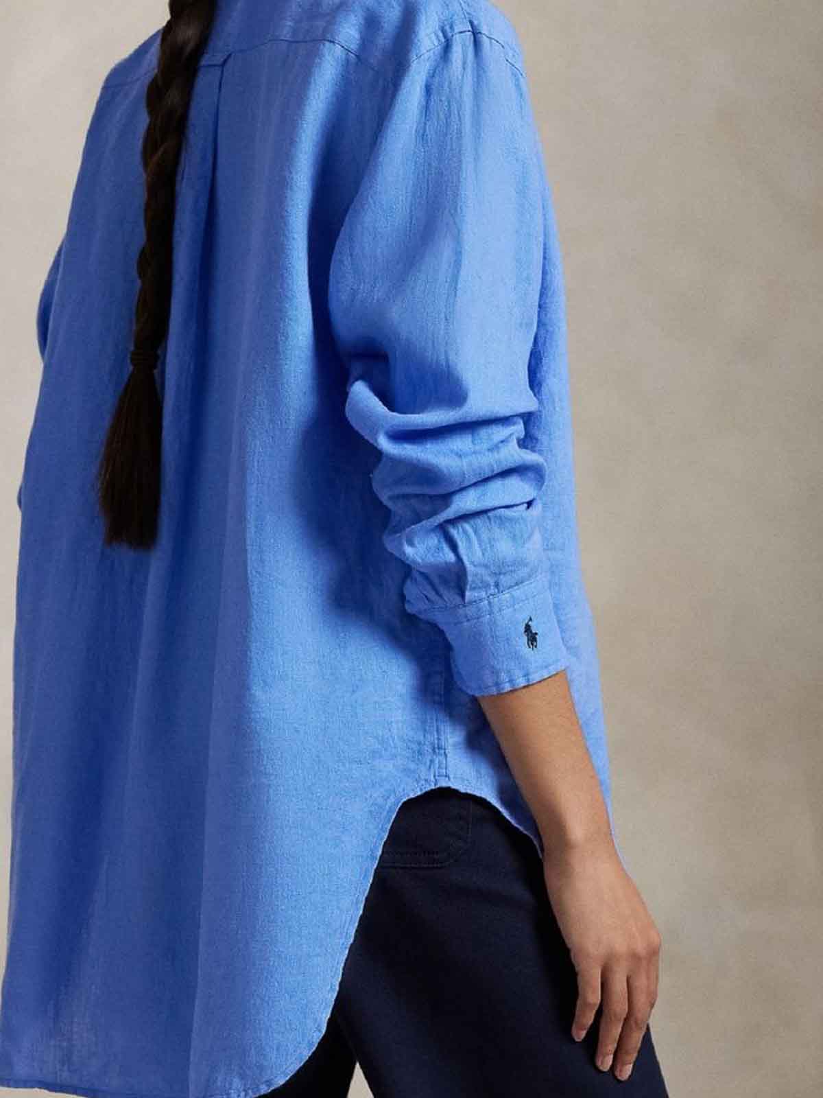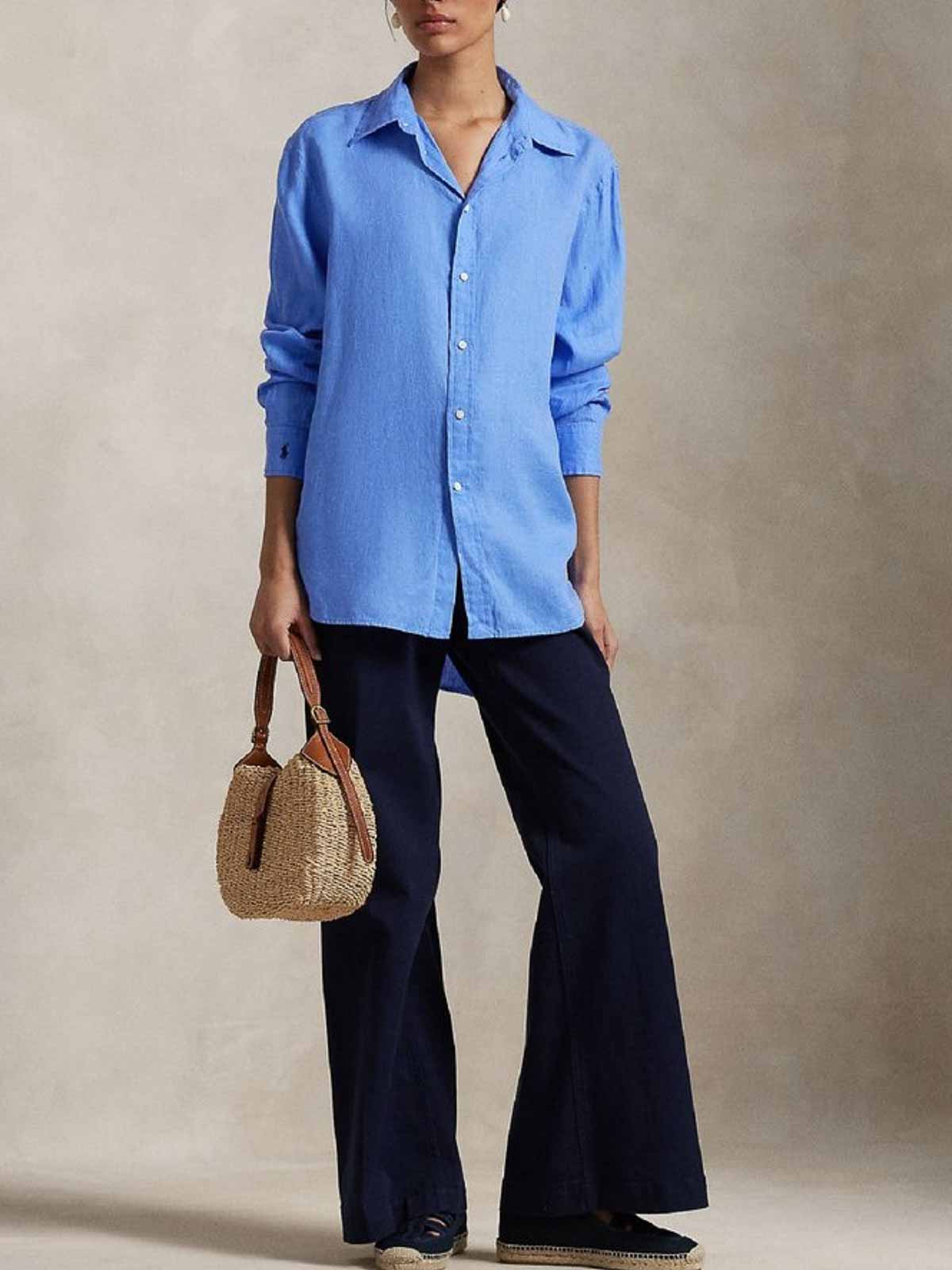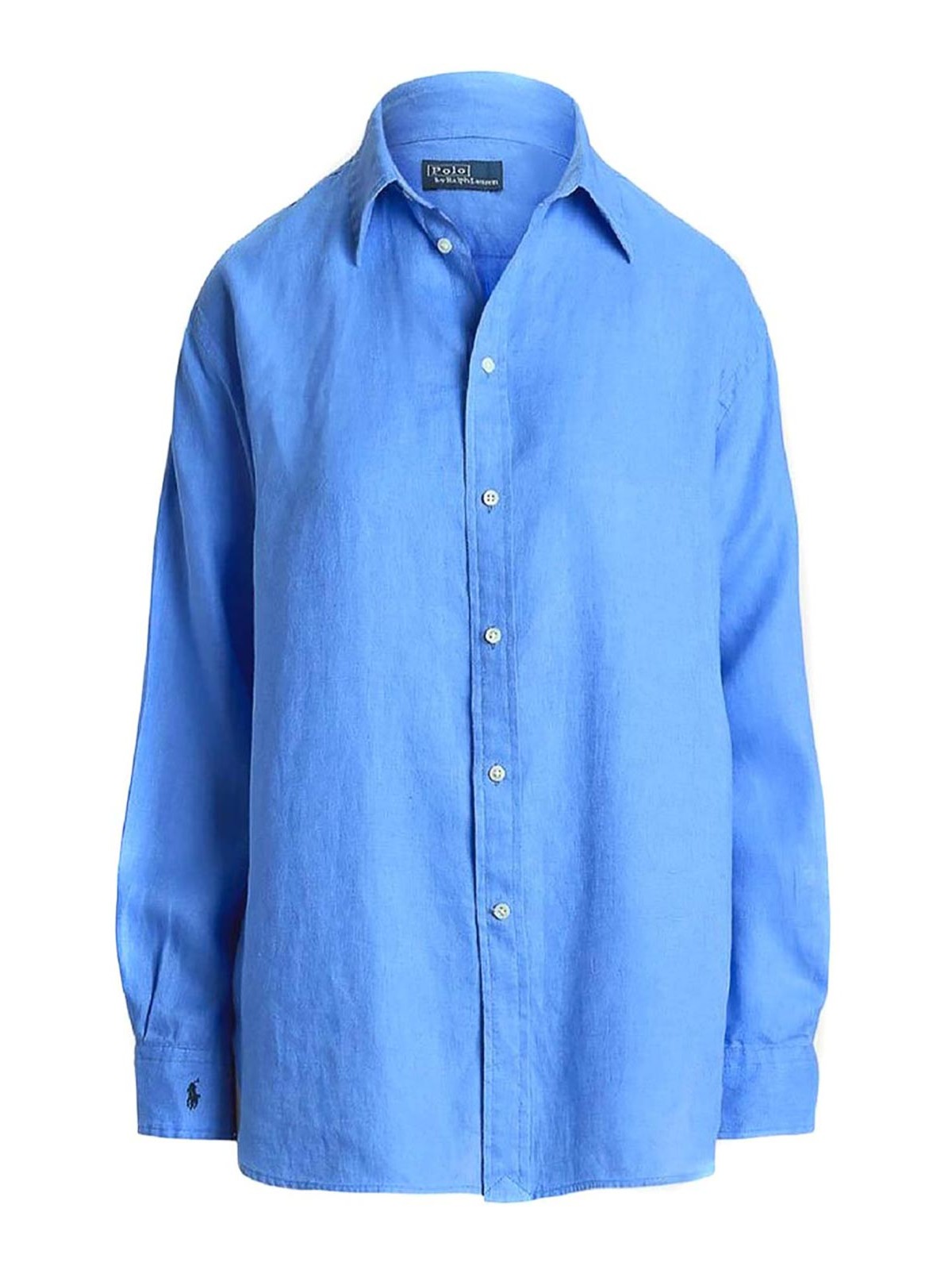 ラルフ・ローレンのサイン入りポロシャツのリネン製マキシシャツ。クラシックな襟、前面にボタンプラケット、胸に小さなロゴ