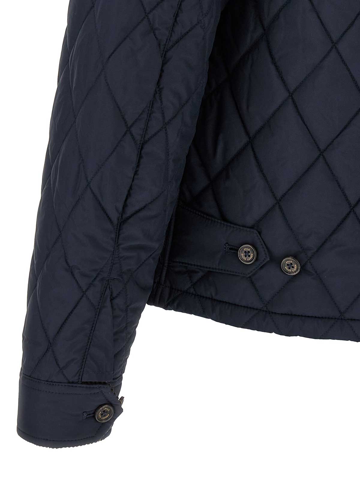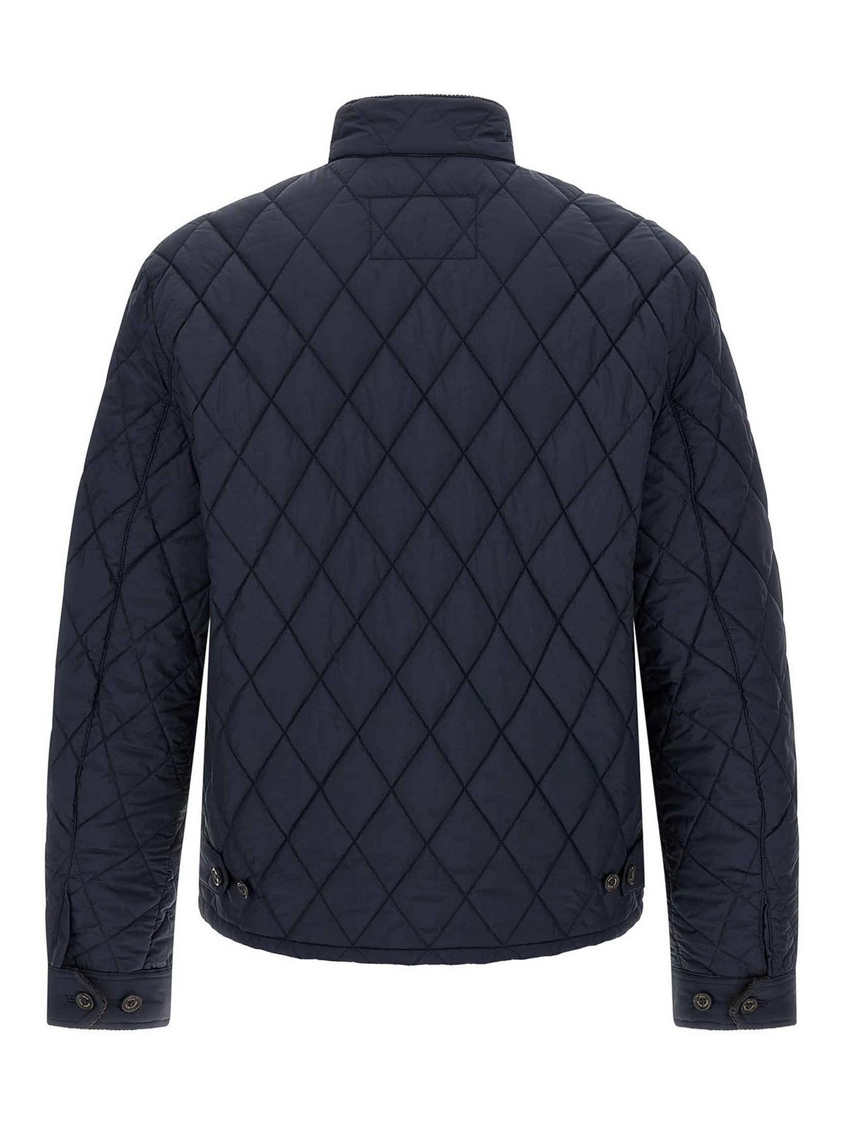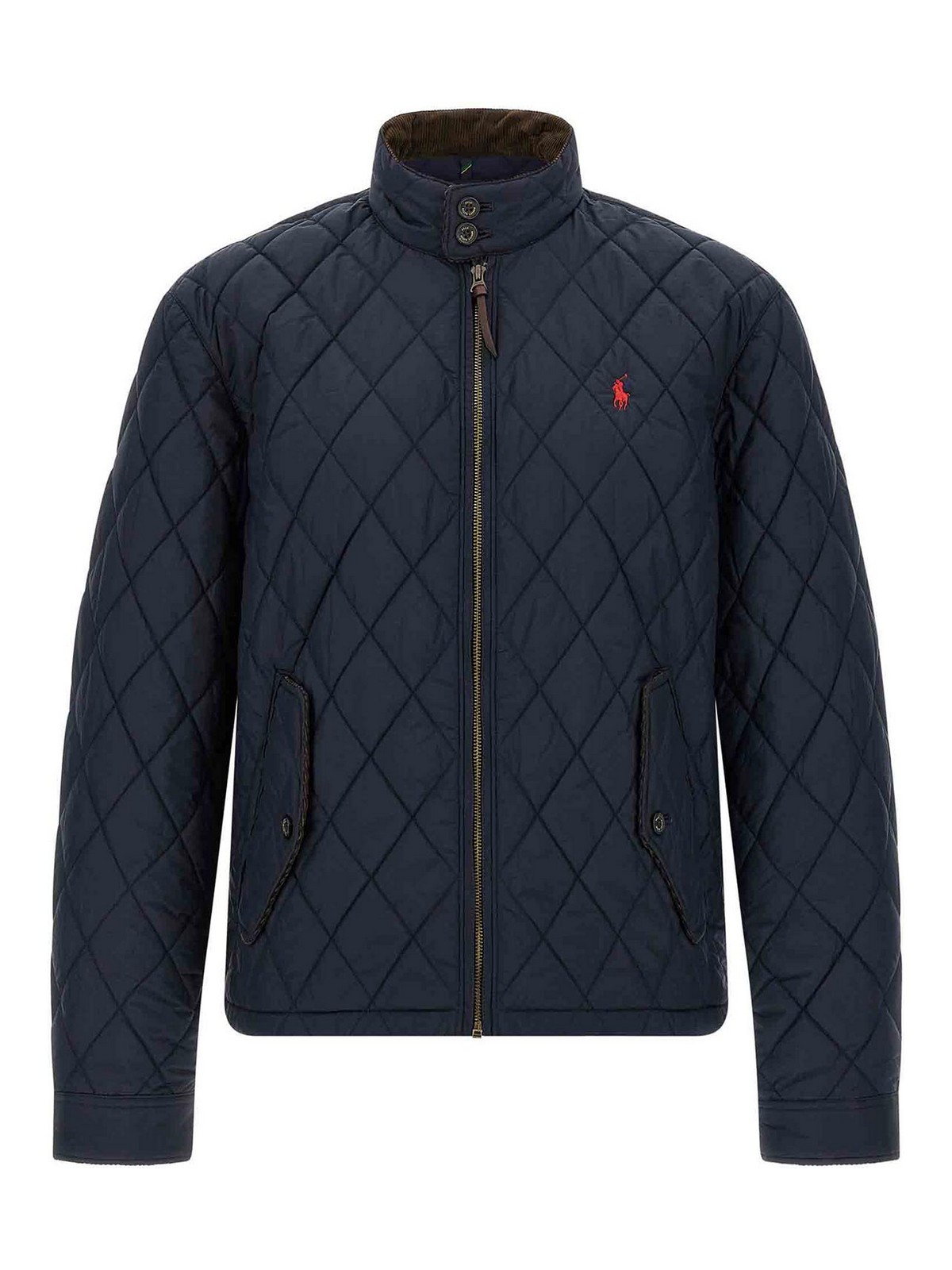 コントラストの効いたコーデュロイのディテール、ロゴ刺繍、フロントジッパーをあしらった薄手のパッド入りキルト生地のジャケット、ボタン留め付きハイネック、ポケット、袖口付き長袖
