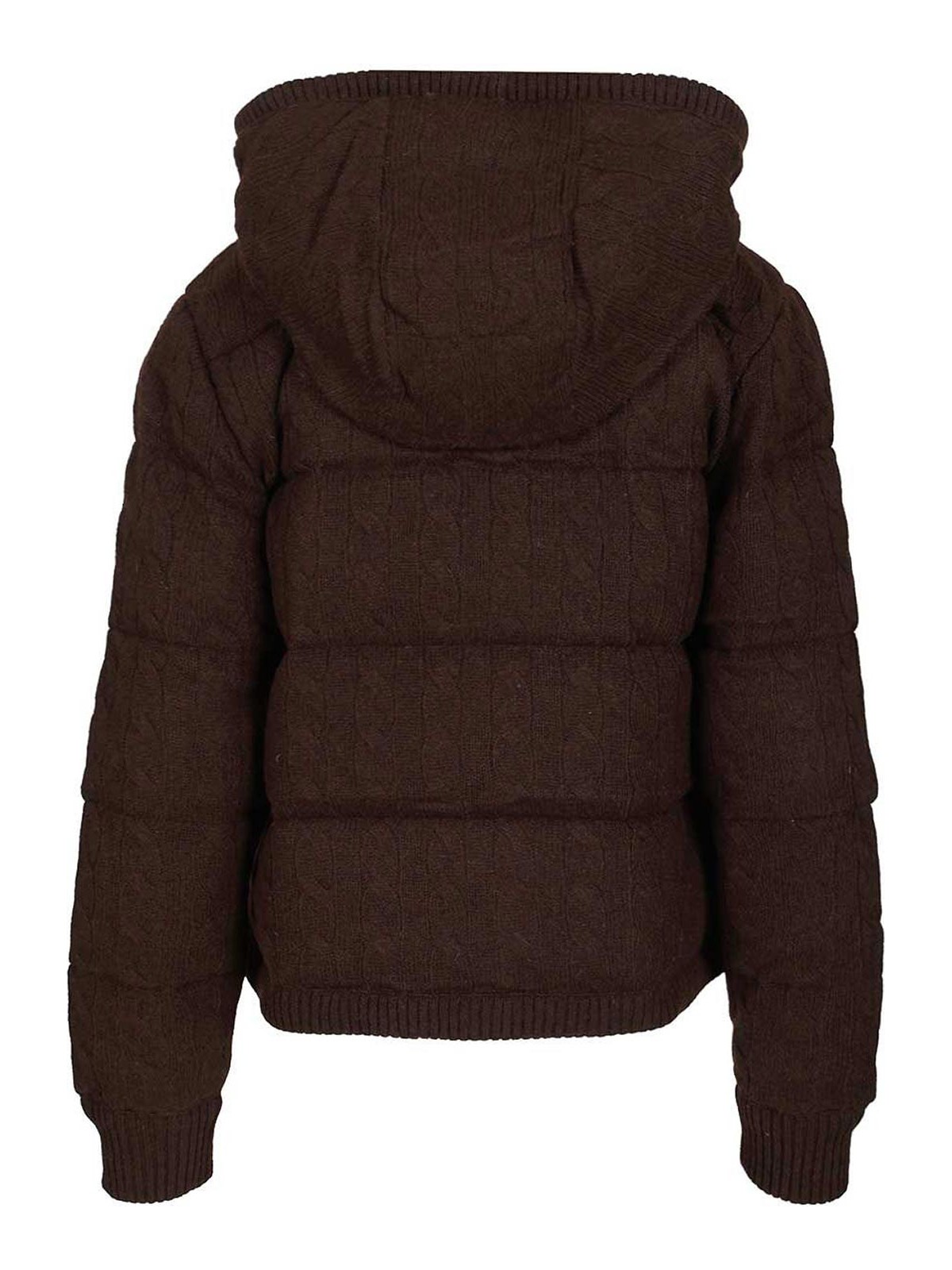 ケーブルニットのカシミアとウールのダウンジャケット、ドローストリング付きの取り外し可能なフード、ウェルトポケット、ダブルスライダージッパー。