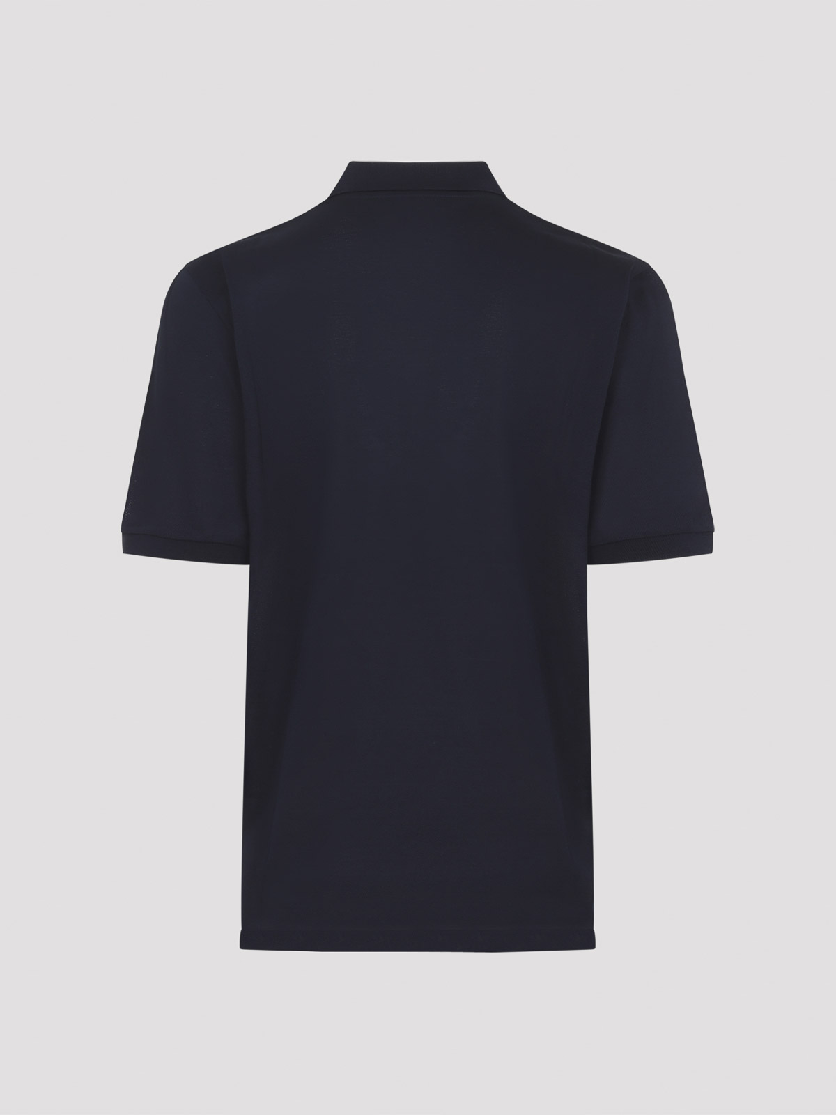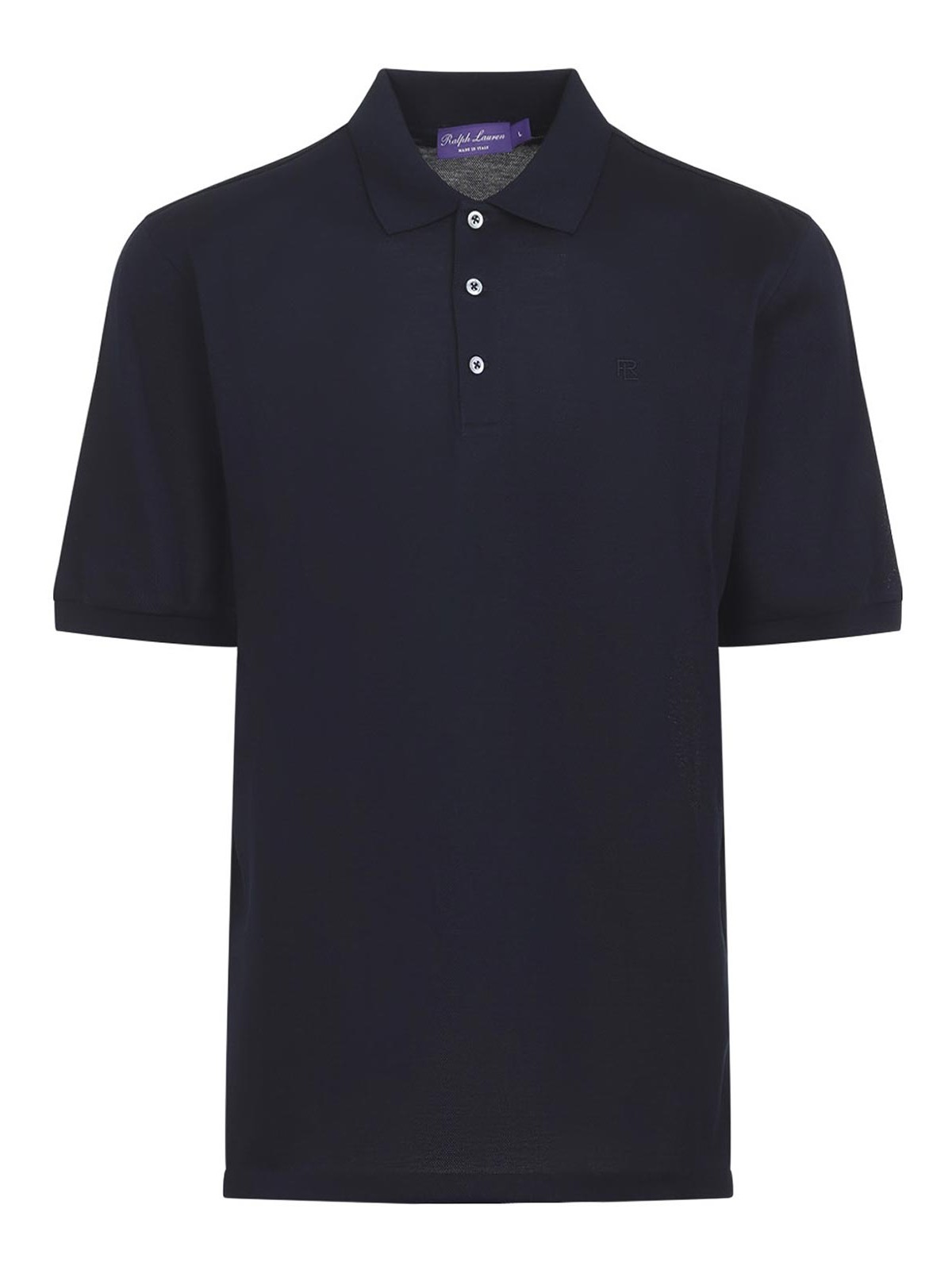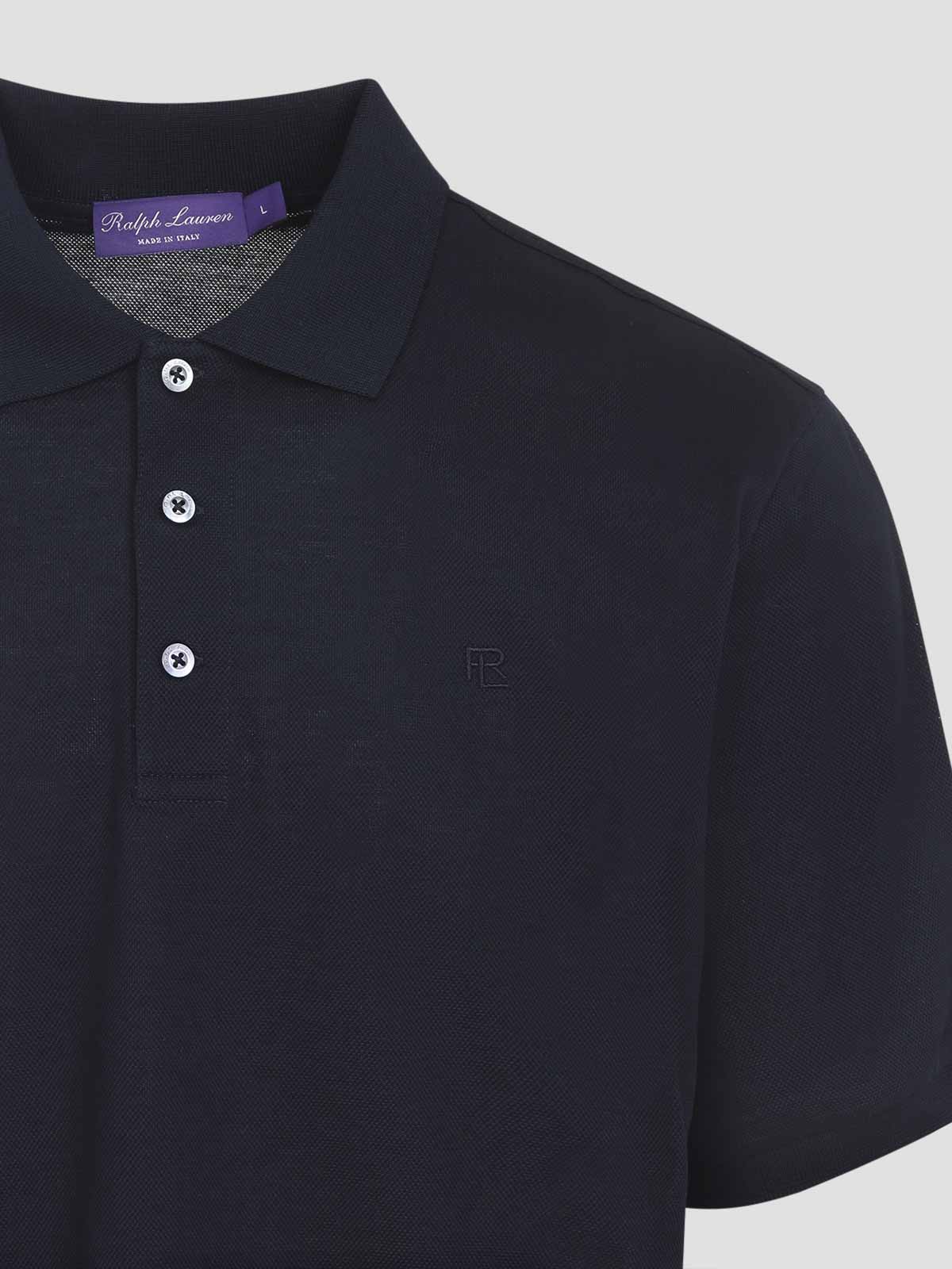 ラルフローレンパープルレーベルクラシックチャーメインネイビーブルーコットンポロシャツ。ピュアクラシックチャーメインネイビーブルーポロ、クラシックポロカラー、チェストトーナル刺繍レタリングロゴ、半袖、ストレートヘム。