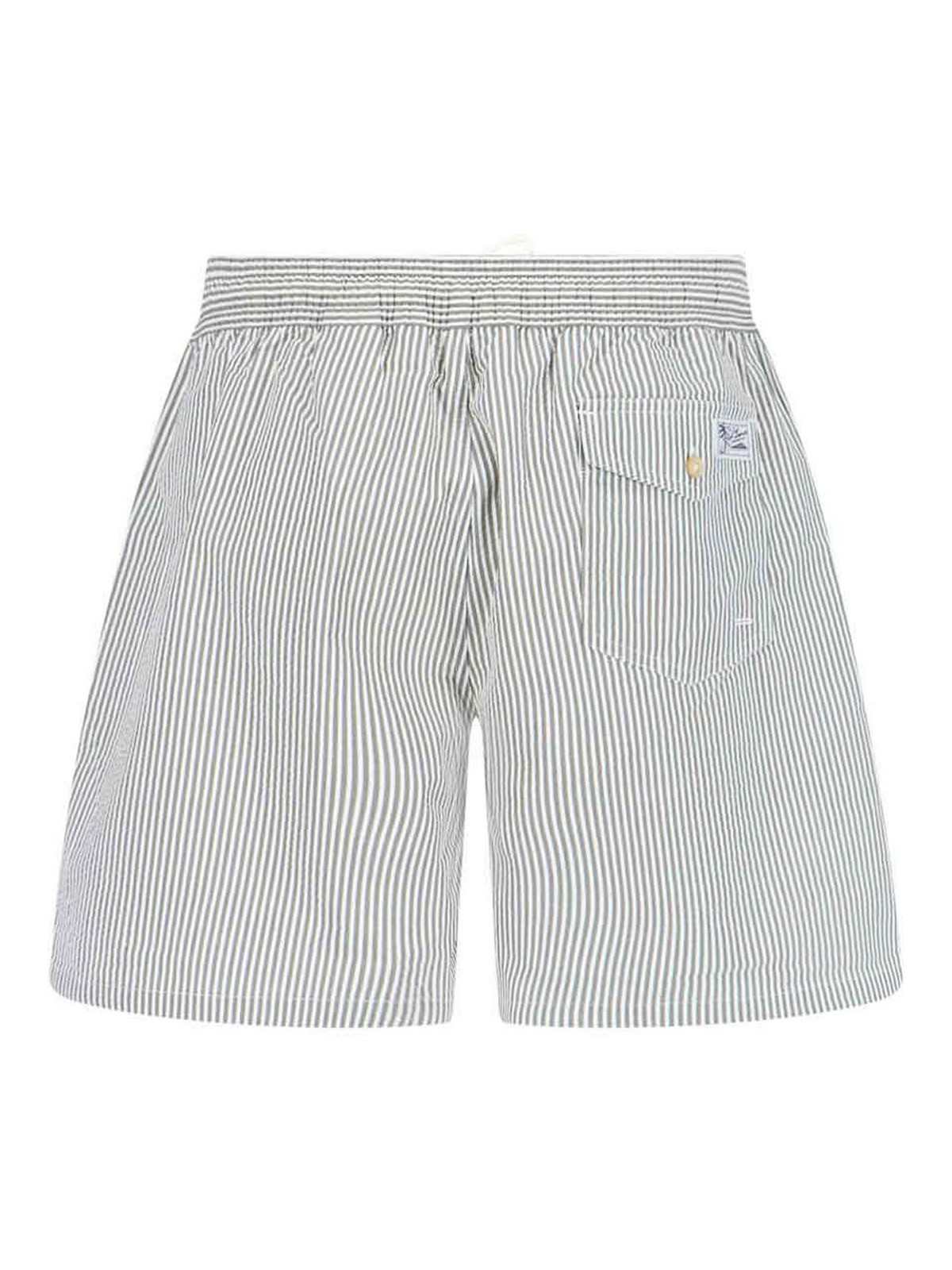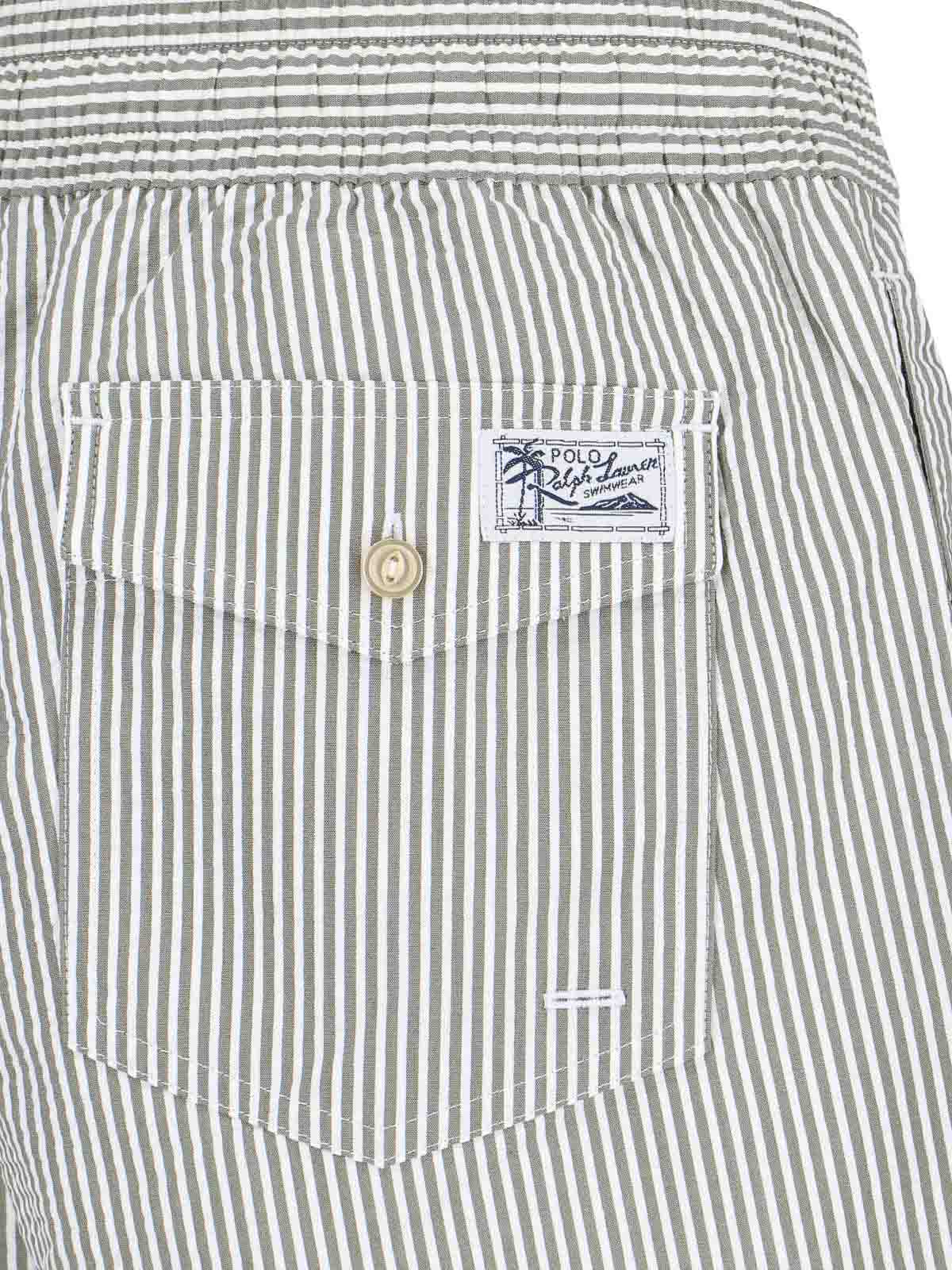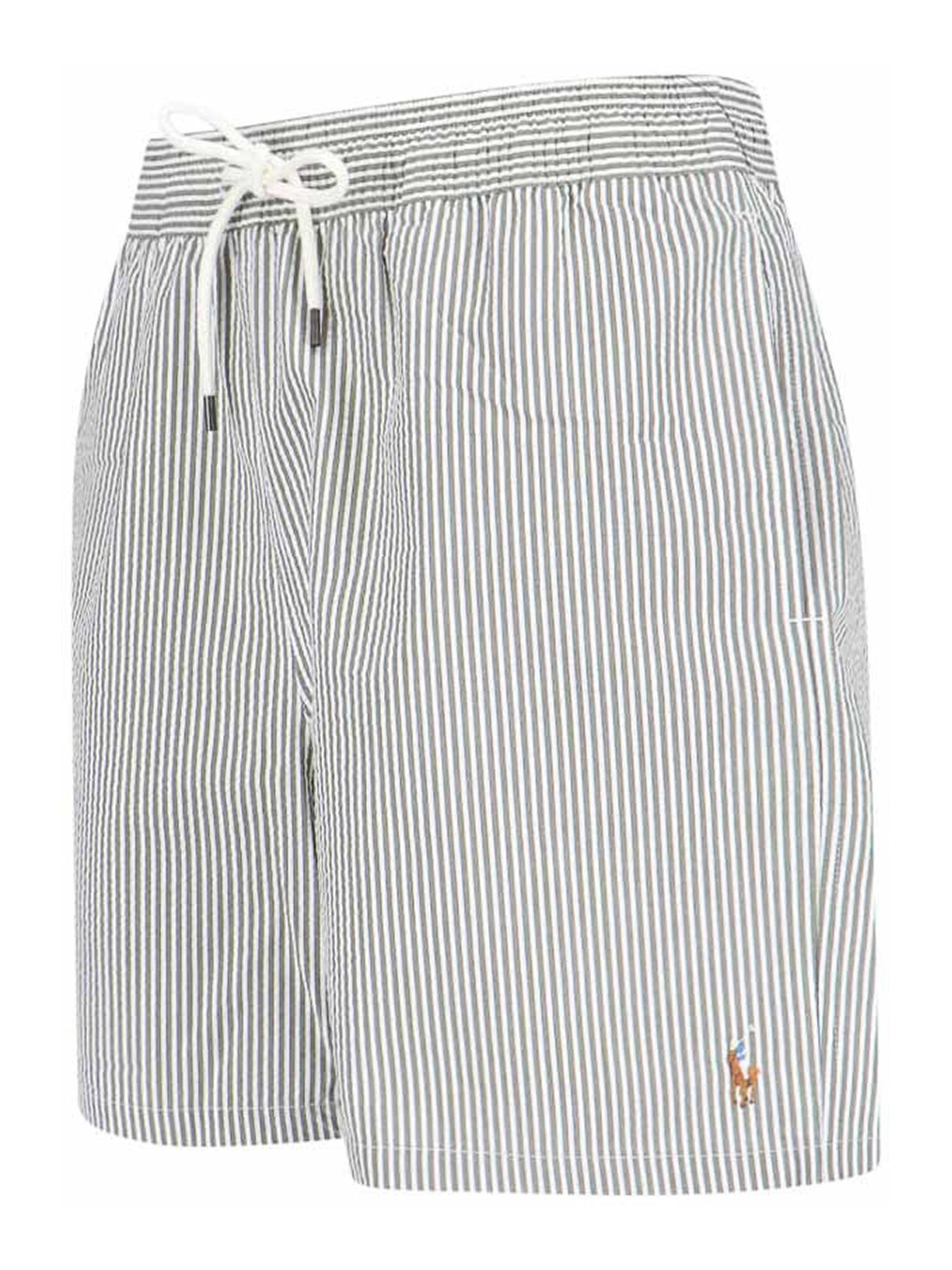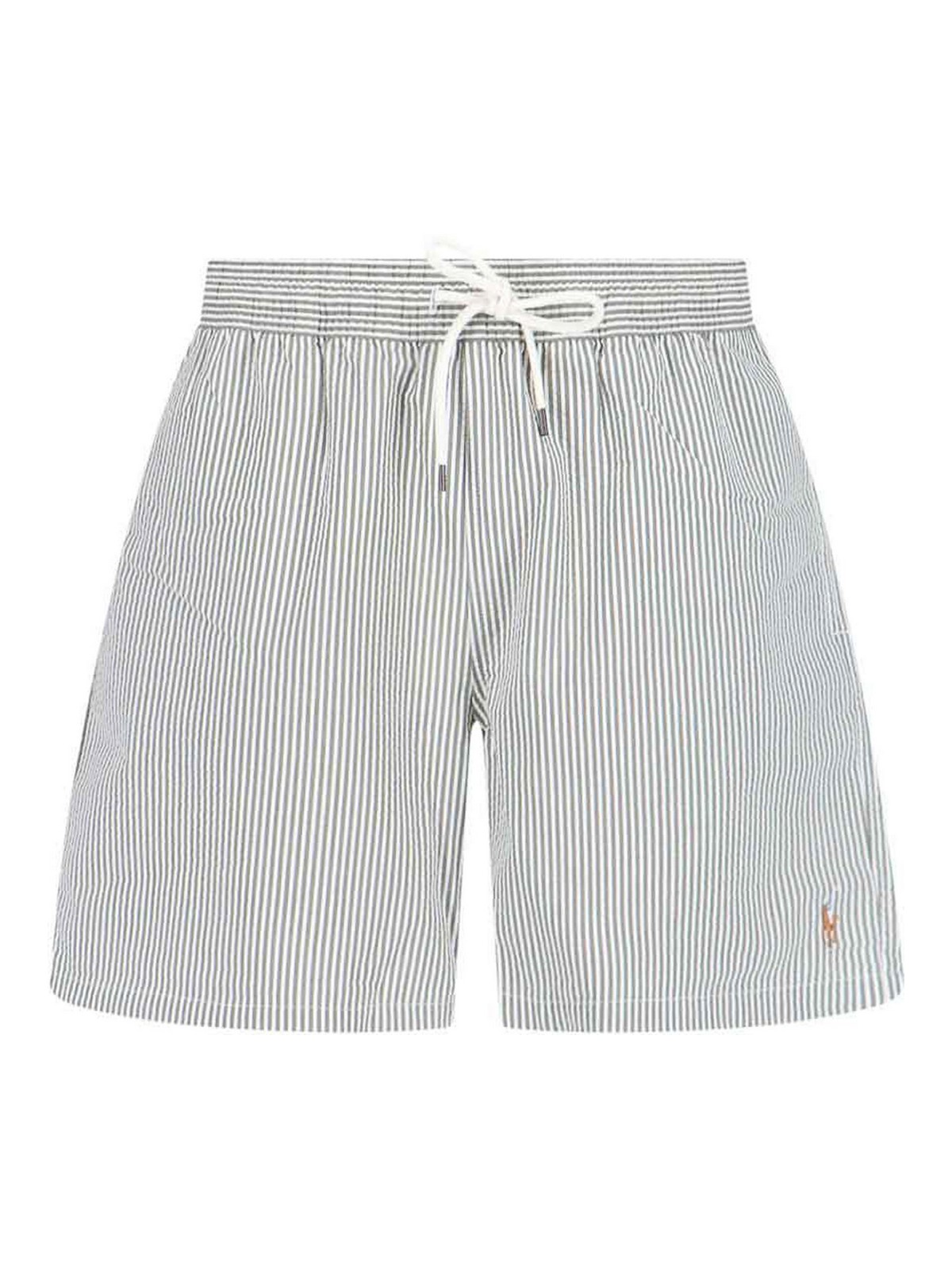 ポロラルフローレンスイムショーツ、ストライプ柄、伸縮性のあるミッドウエスト、ドローストリングウエスト、フロントロゴ、サイドポケット2つ、バックボタンフラップポケット1つ、ストレートレッグ。