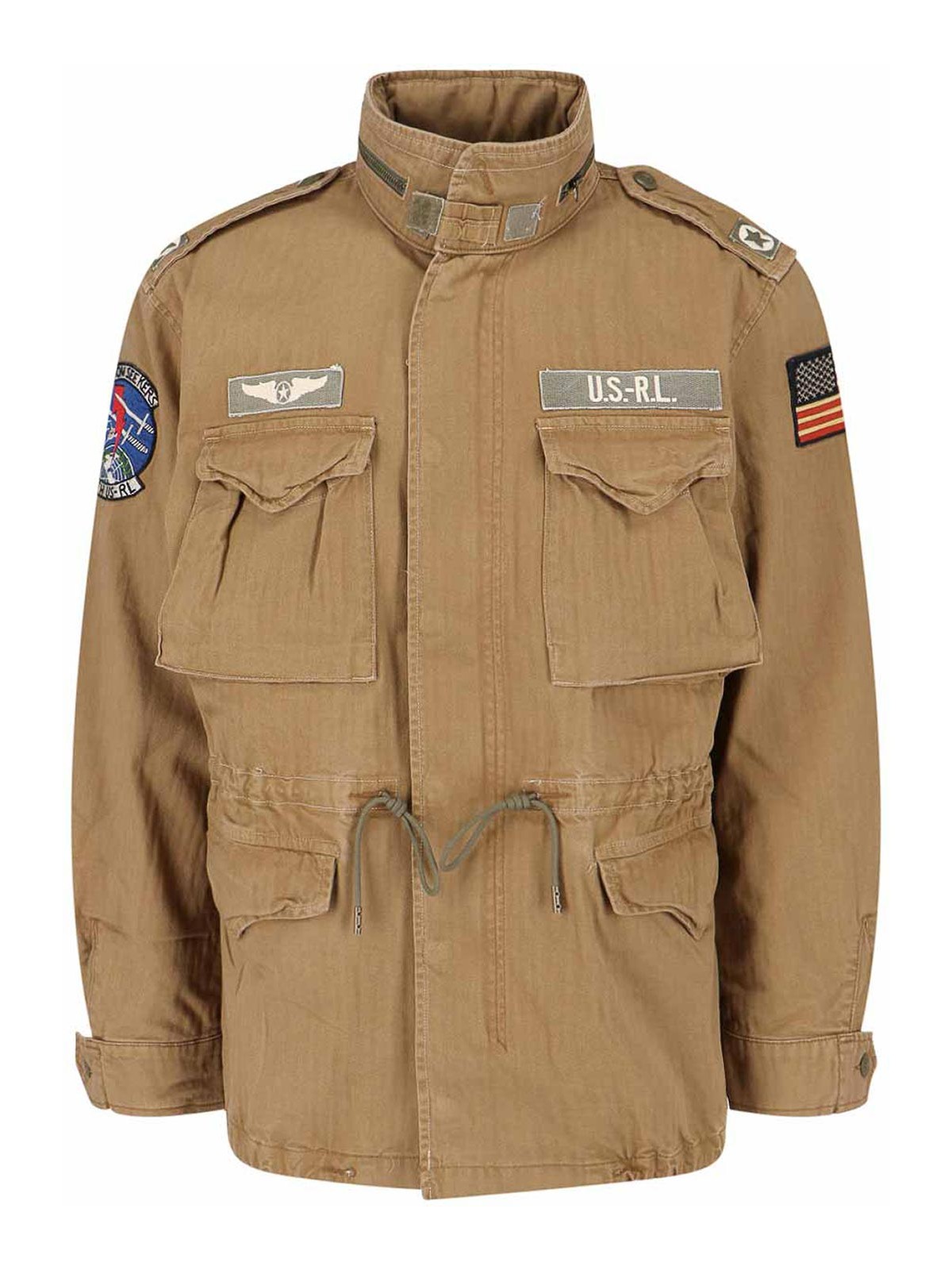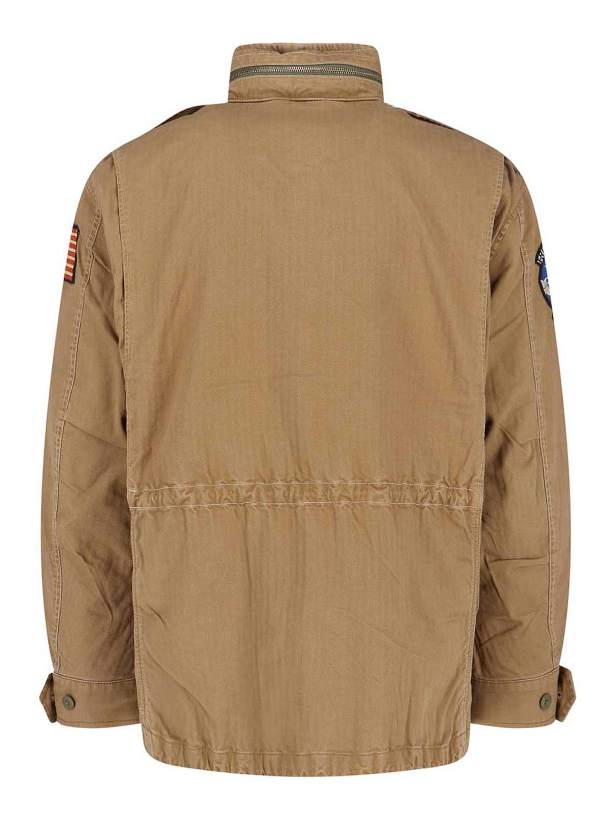 ブラウンコットンのポロラルフローレンパッチ付きミリタリージャケット、ハイカラー、取り外し可能なフードジッパー、ボタンと隠しファスナー、調節可能なカフストラップ、胸フラップポケット2つ、マルチカラーチェストパッチ2つ、ウエストドローストリング、サイドフラップポケット2つ、マルチカラースリーブパッチ2つ、ストレートヘム。