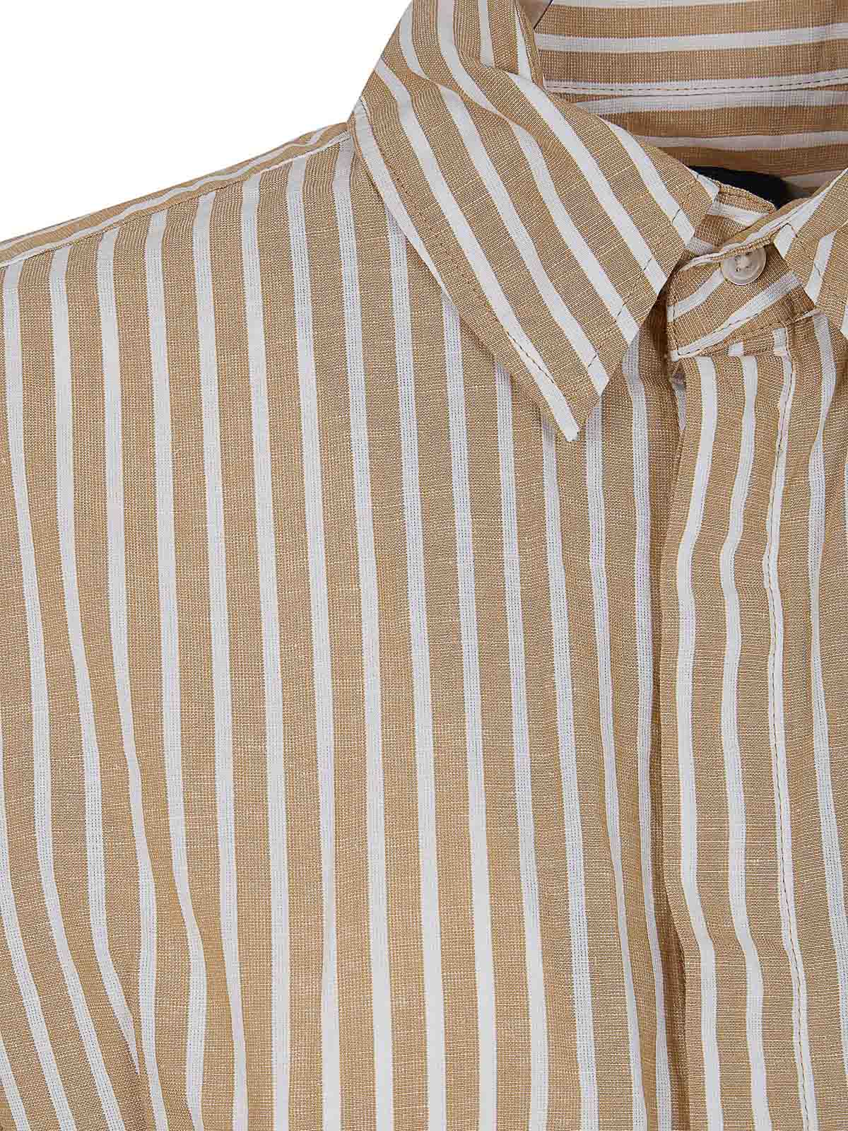Ralph Lauren ポロをブレンドしたストライプ柄 Aラインシルエットシャツドレス。ローショルダー。ボックスプリーツ付きバックヨーク。足首より上の長さ。スリットヘム。袖口にもマザーオブパールのボタンが付いた隠しポインテッドカラー。長袖サイドスラッシュポケット