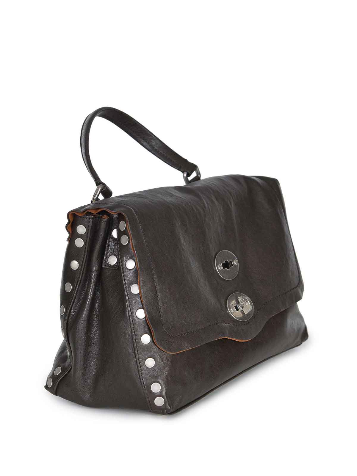 チャコールカラーのレザー製Zanellato postina デイリーバッグ。シルバーのメタルインサート。サイドにスタッズディテール。トップハンドル。クロージャー付きフラップ、メタルターンロック。裏地付き。内側にレザーロゴパッチ。ジッパー付きの内側のウォールポケット。ダブルコンパートメント。手で着けたり、肩にかけたり、クロスボディにかけたりできます。調節可能で取り外し可能なレザーショルダーストラップ。ダブルトーンオントーンレザーストラップ。幅 30 cm 高さ 18 cm 奥行 15 cm ハンドル 11 cm 100% イタリア製