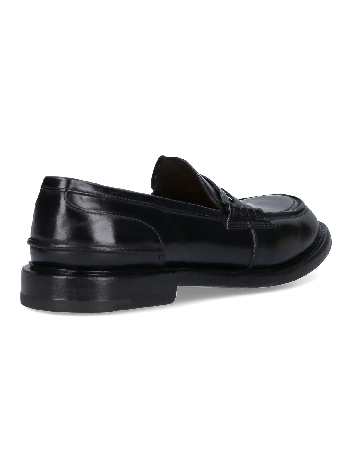 受賞歴のあるカーフスキンローファー、ブラック、ラウンドトウ、アッパーカットアウトバンド、ビジブルステッチ、スリッポンフィット、レザーソール。