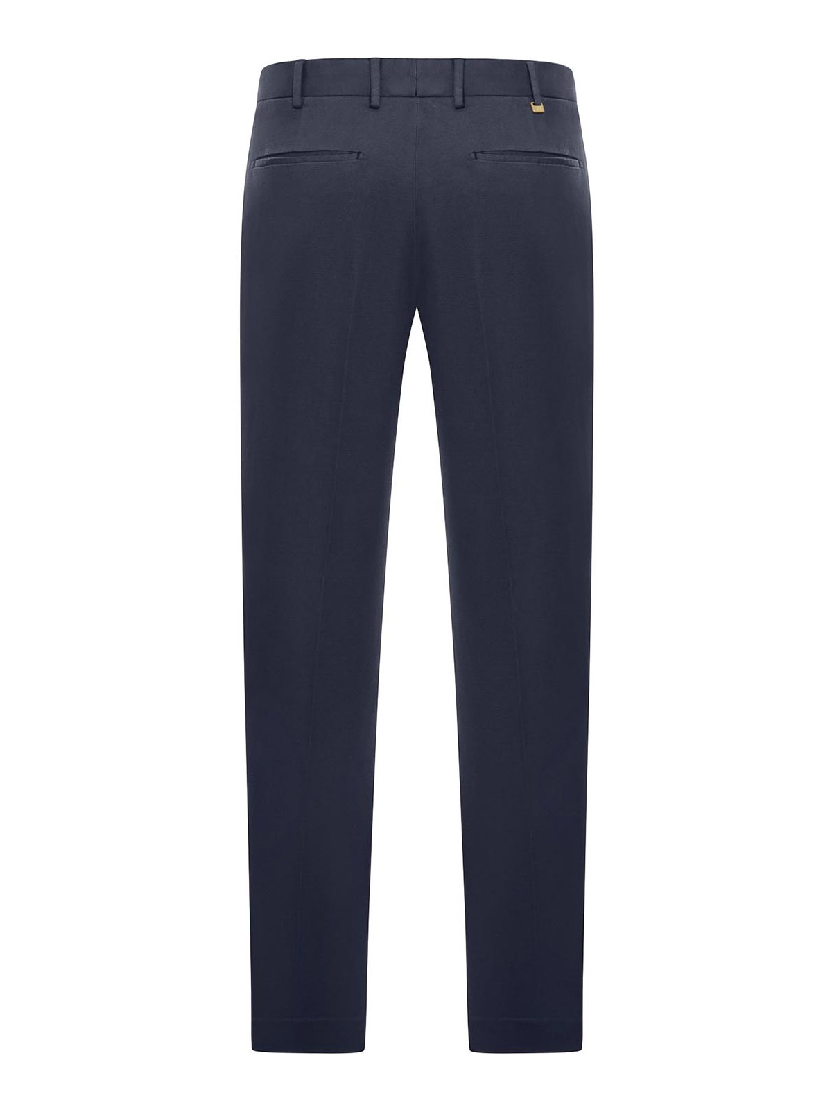 フロントファスナーとフッククロージャー、ベルトループ、斜めポケット、バックウェルトポケット2つ、スリムフィット、コットンとカシミアブレンド、色:ダークネイビー