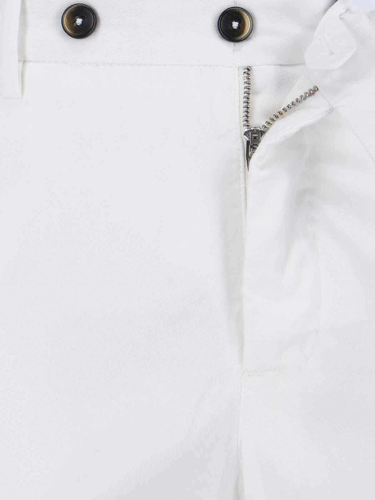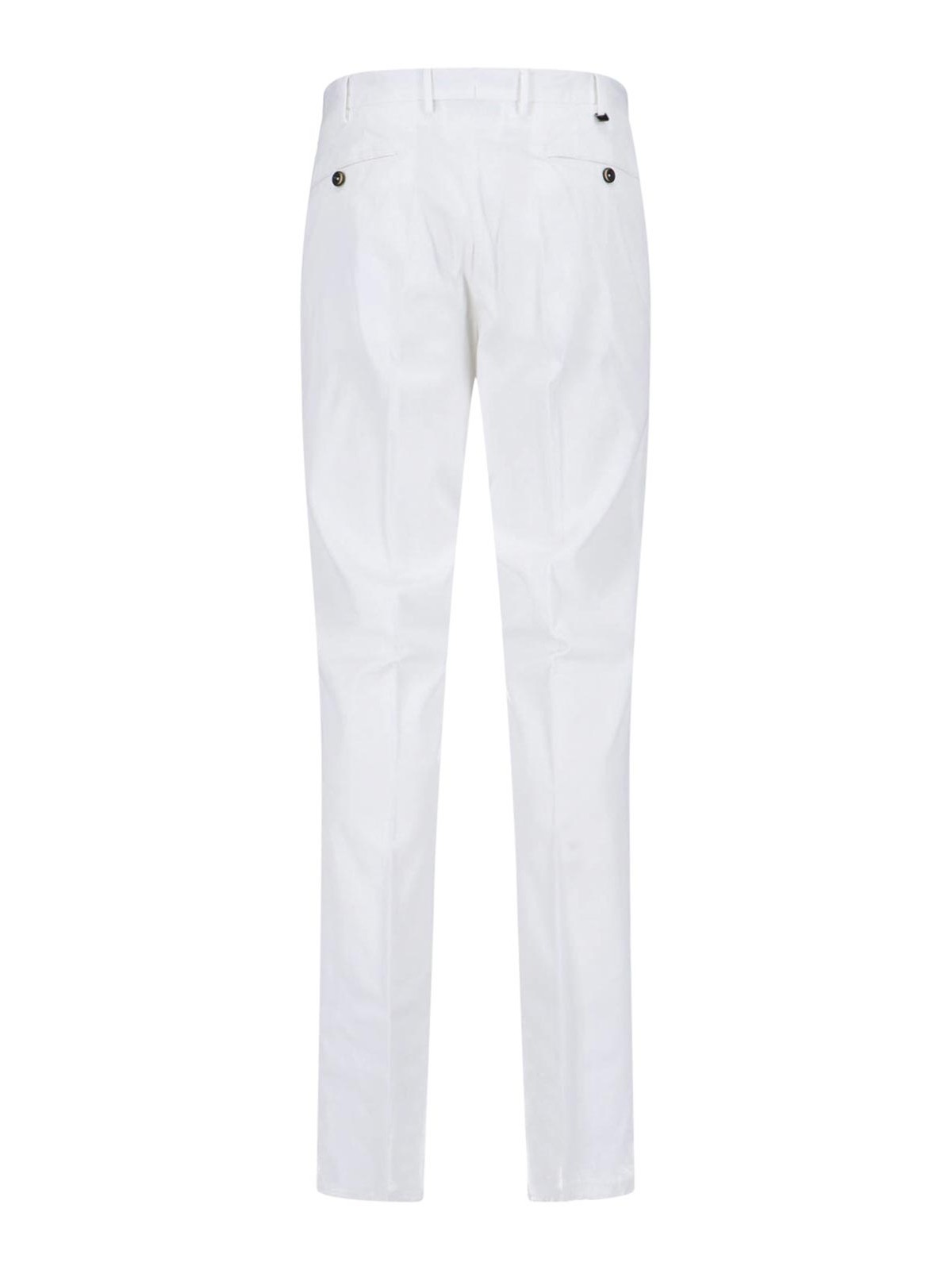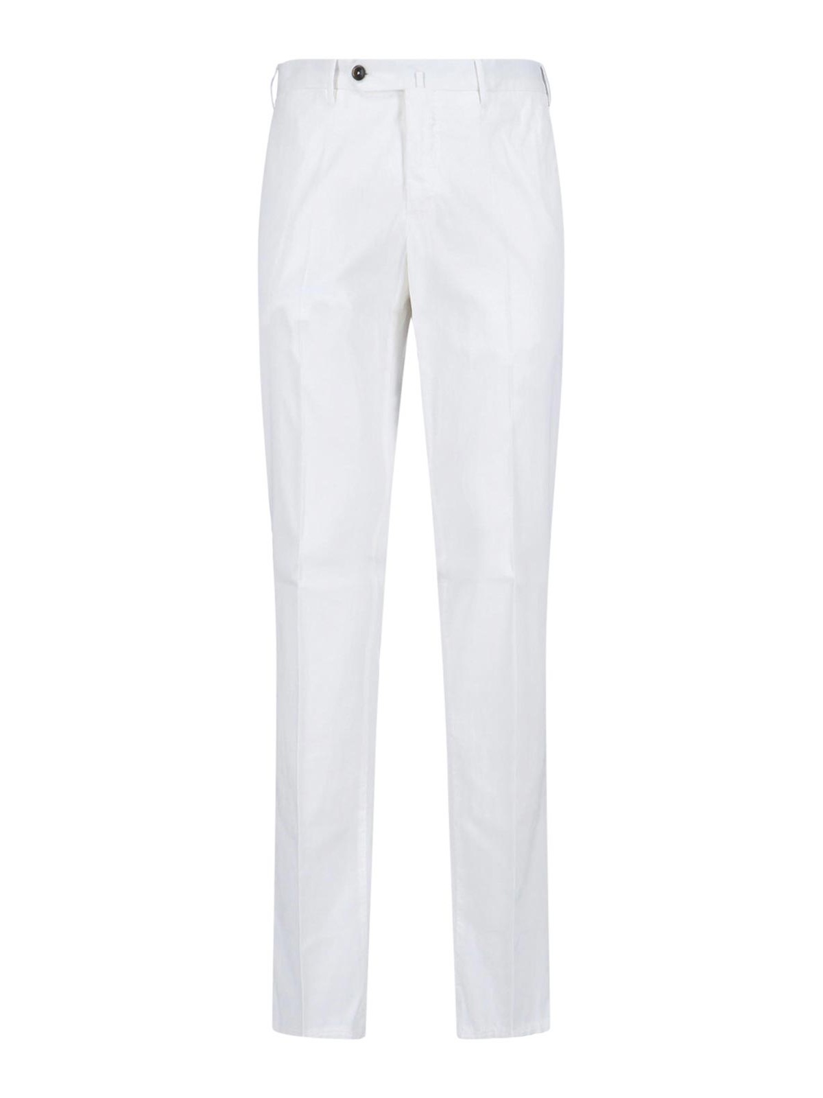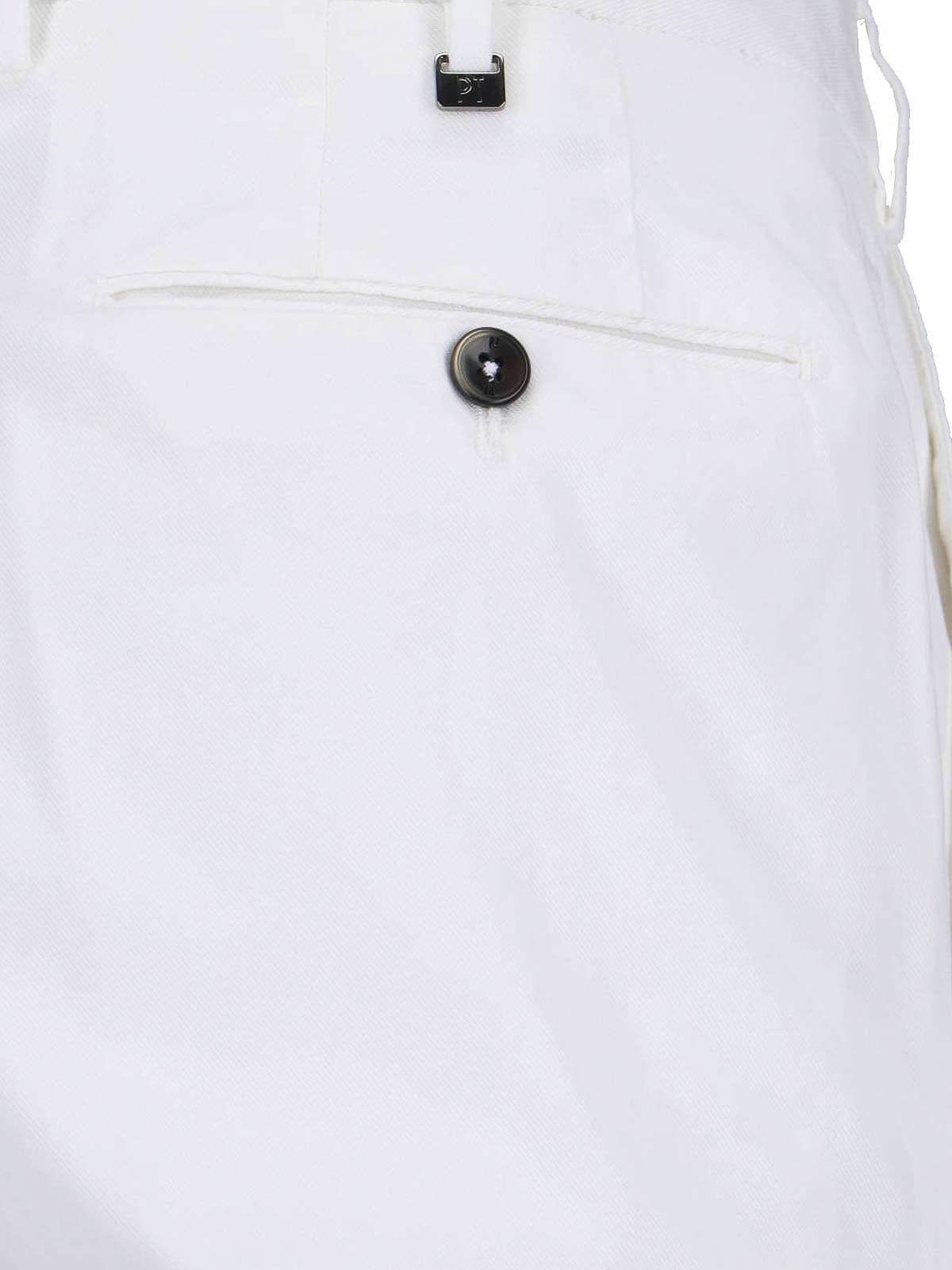 白いリヨセルとコットン混紡のPT Torinoストレートパンツ、ミディアムウエスト、ボタンとジッパー、ベルトループ、斜めのサイドポケット2つ、ボタンフラップポケット2つ、スリムレッグ。