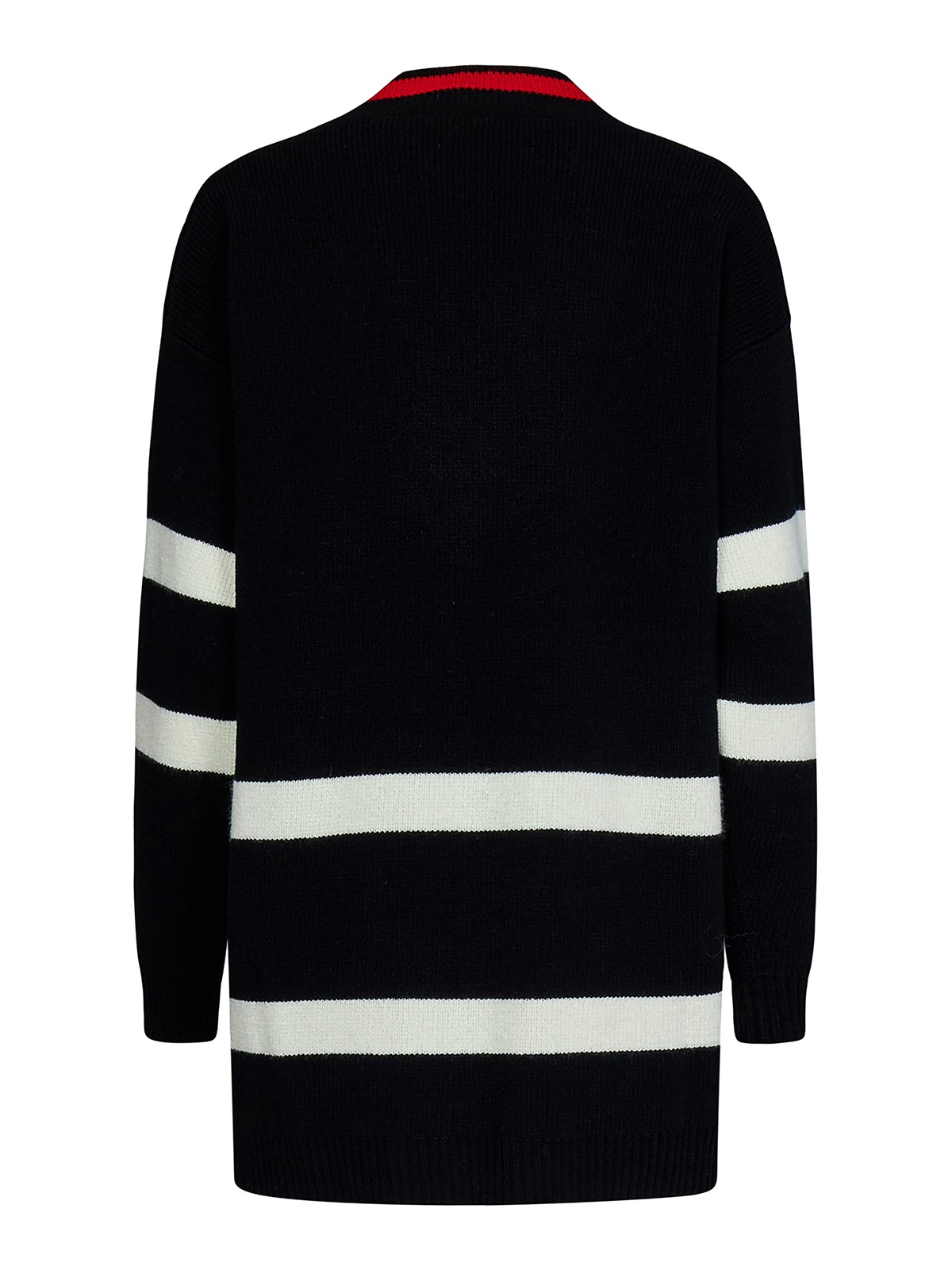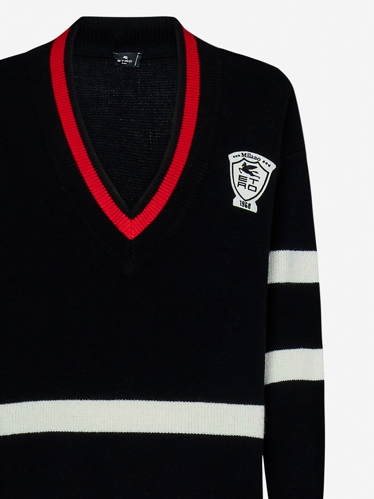 赤のストライプモチーフをあしらったリブ編みのVネック。長袖、ドロップショルダー、胸に白いパッチがあしらわれ、紋章風の刺繍が施されたエトロキューブのロゴとペガサスの全面白い横縞模様、リブ編みの袖口と裾はブラックカラー。