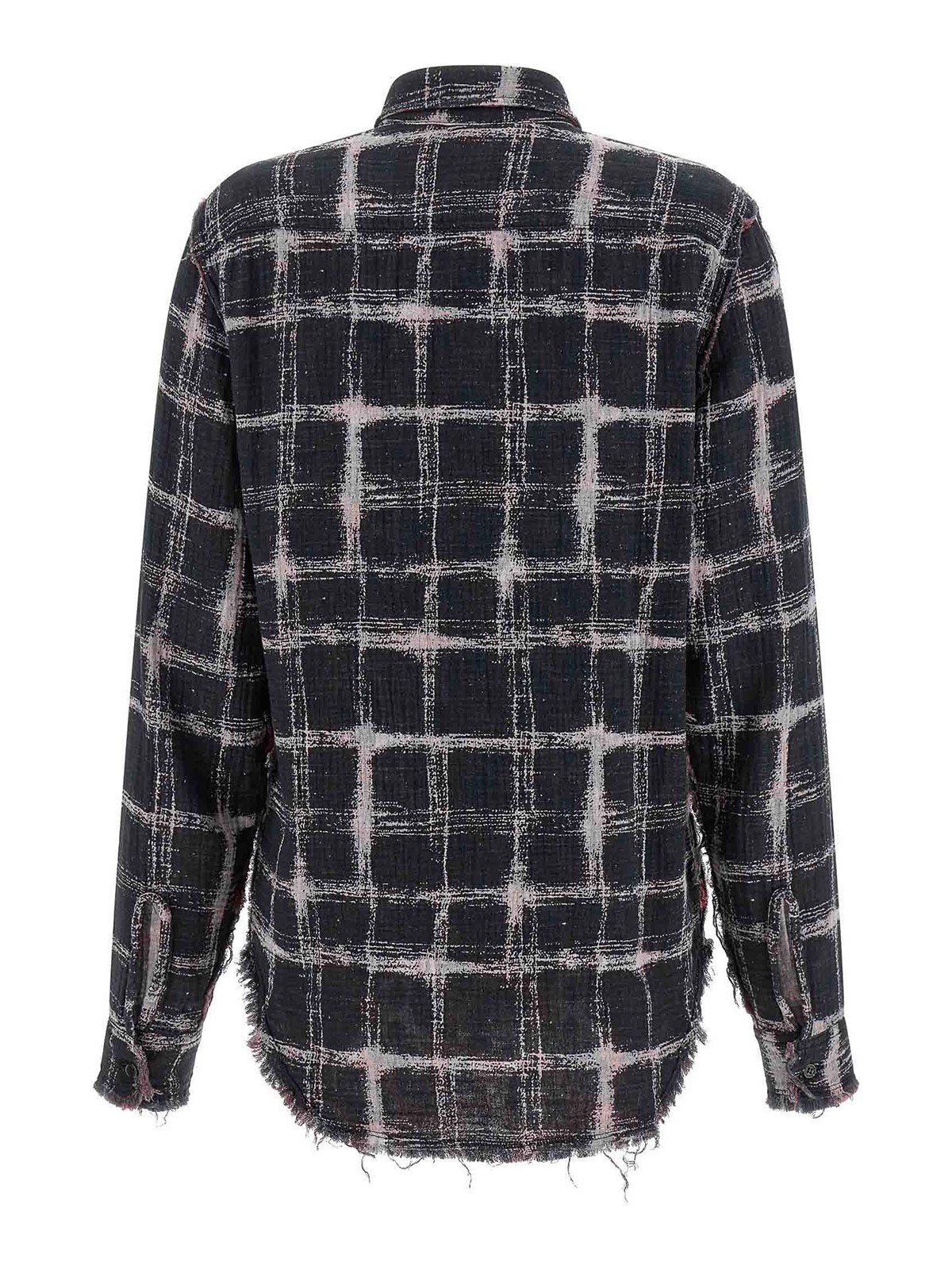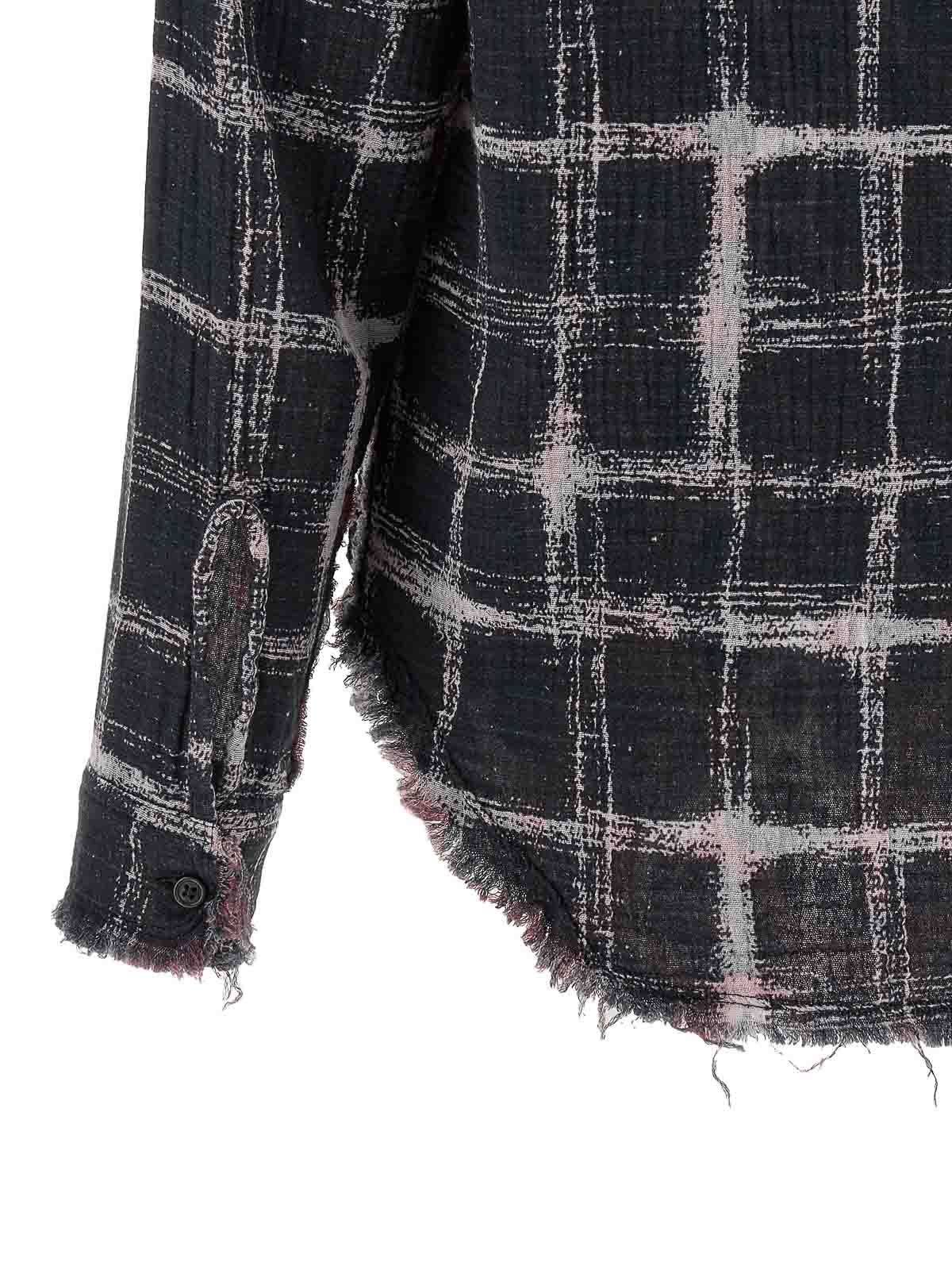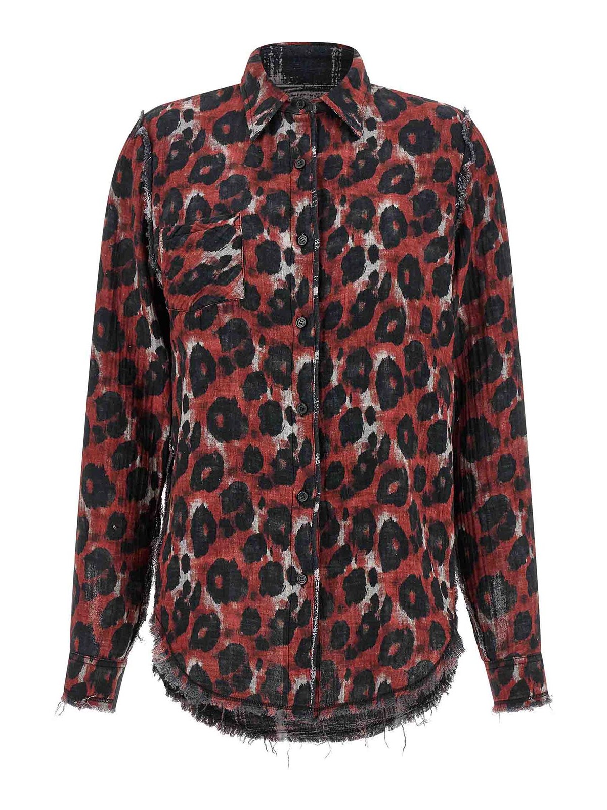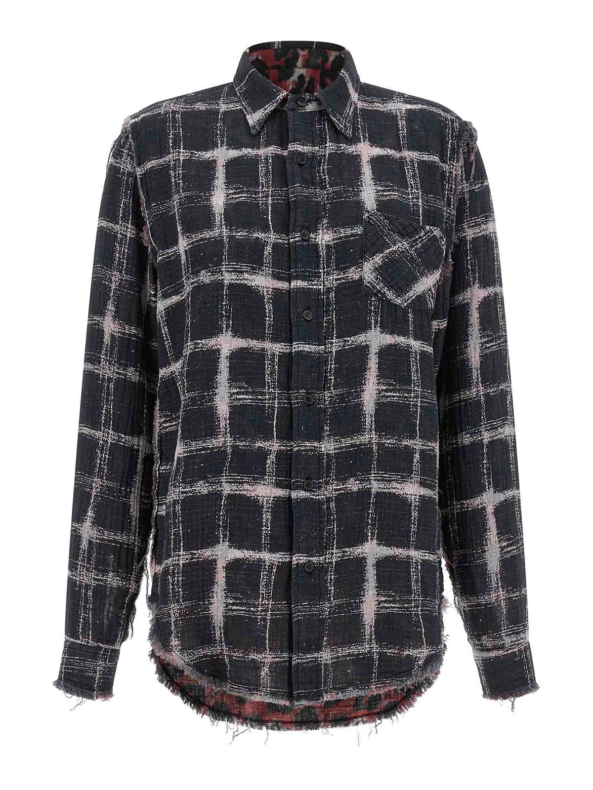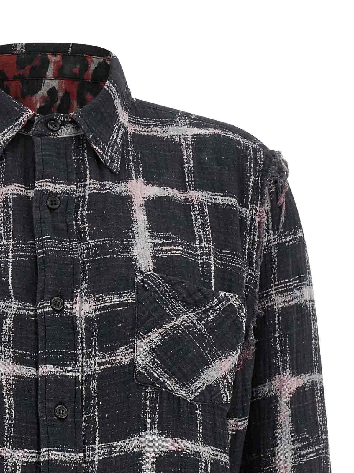 チェックとアニマル柄のリバーシブルピーチハンドコットンシャツ、胸ポケット、フロントボタン留め、長いカフスリーブ、ほつれた裾、丸みを帯びた裾。