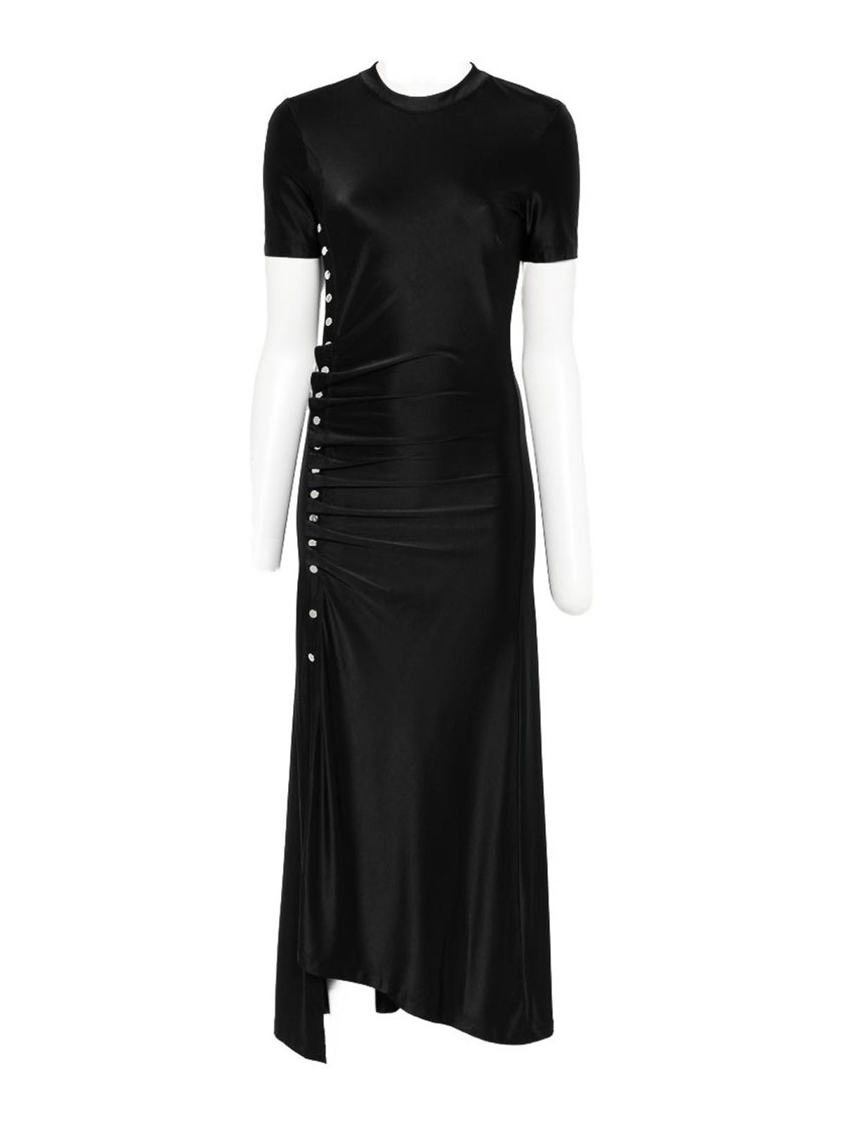 ブラックのサイドボタン付きショートスリーブ、ラウンドネック、後ろにキーホール付き、裾はアシンメトリー