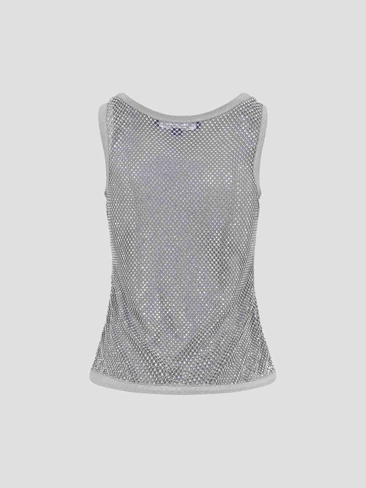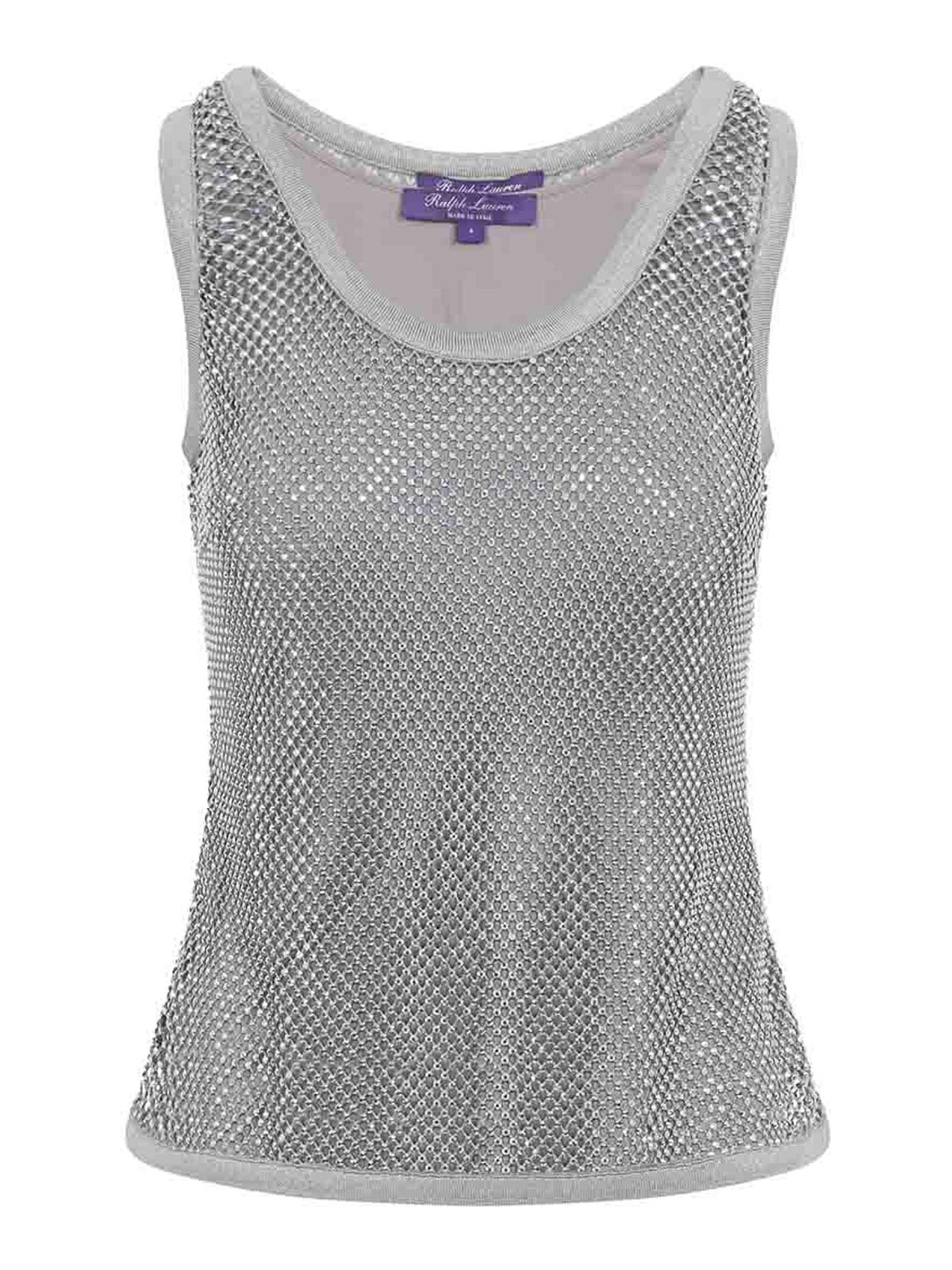 ラルフローレンコレクションのシルバーメロニーブラウス。ビスコースとエラステインのブレンドで作られています。2層構造、ラウンドリブネック、ノースリーブ、ストレートヘム。クリスタルのディテールが施されたネットデザイン、同系色の総裏地。