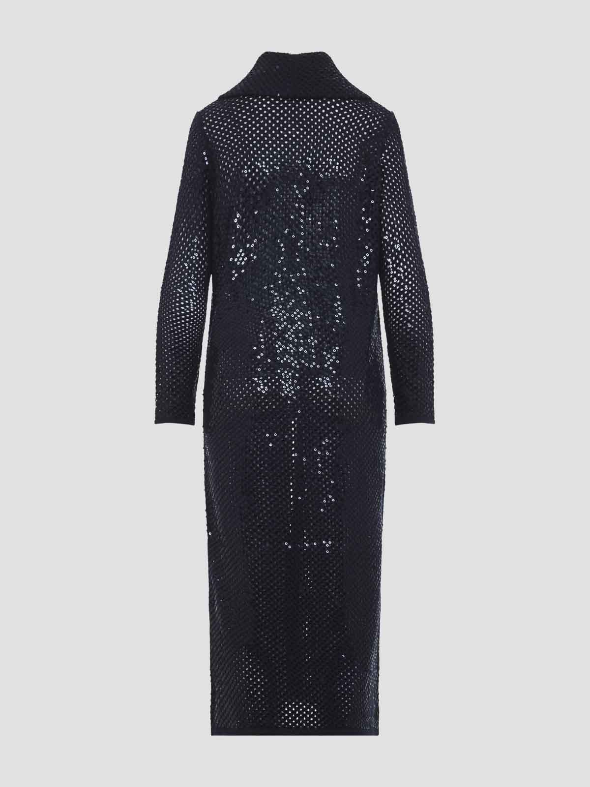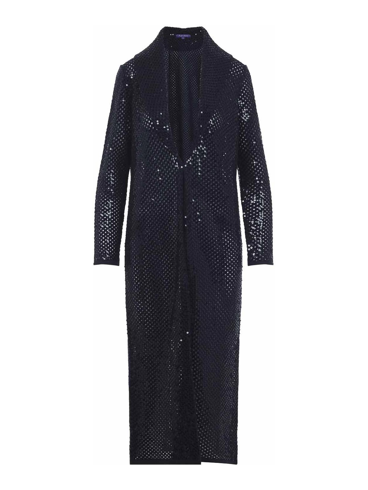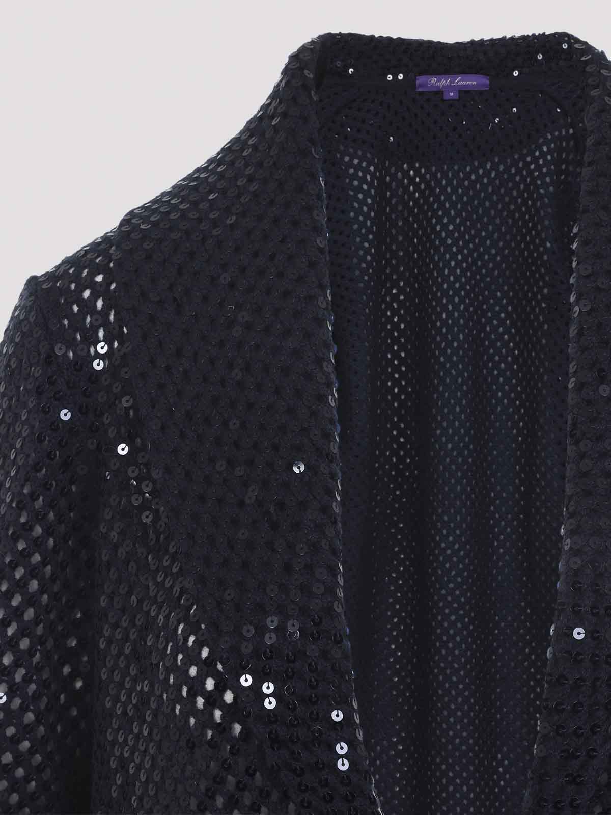 ラルフローレンコレクションアイコンネイビーブルーカシミアロングカーディガン。ピュアアイコンネイビーブルーカシミアカーディガン。ショールカラー、オープンフロント、ロングスリーブ、フィートレングス、ストレートヘム。ストレートフィット、メッシュデザイン、全面に同系色のスパンコールディテール。