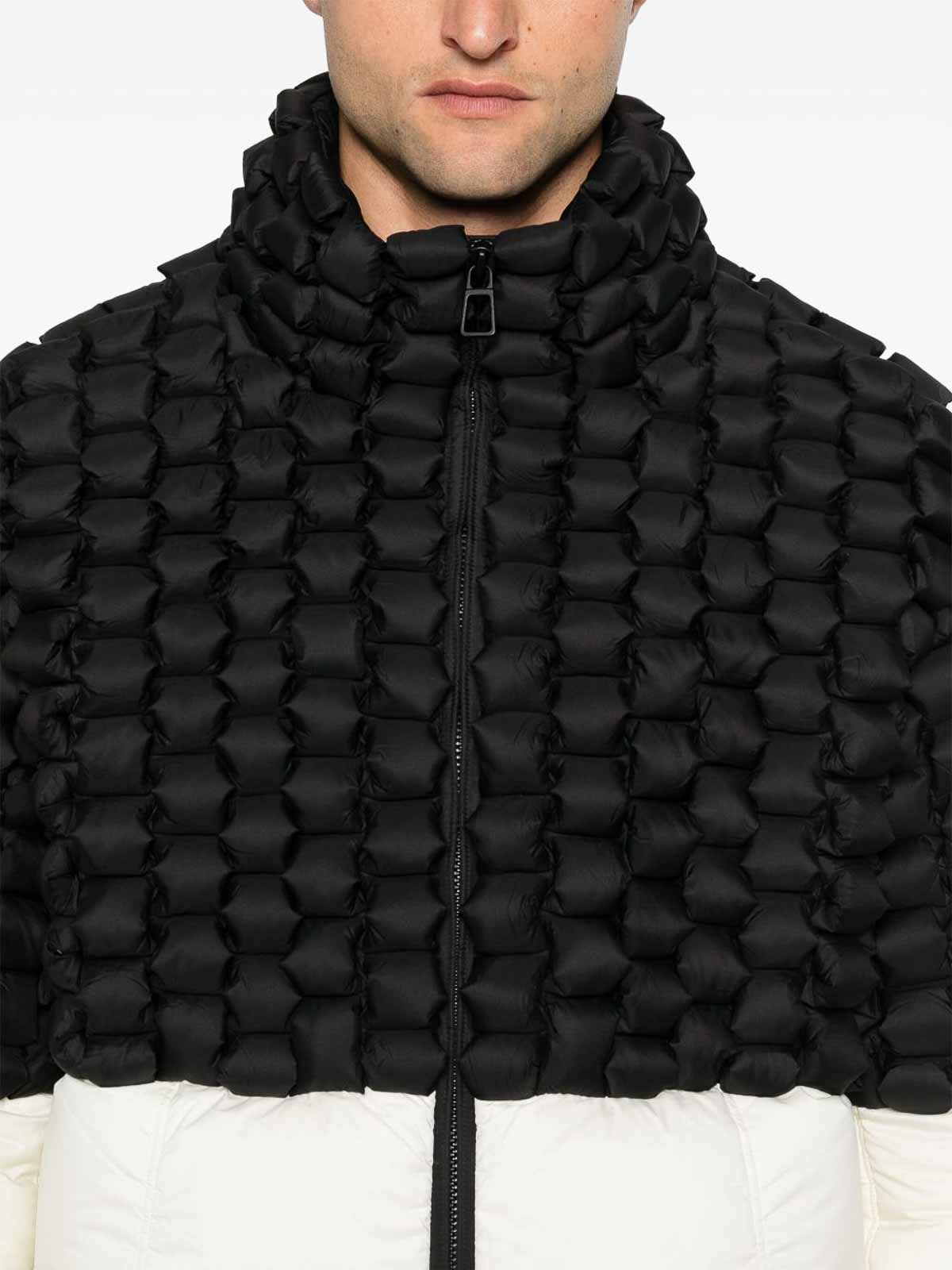 Dキルトデザインのジッパーとハイカラーを備えたraxxyの黒と白のジャケット