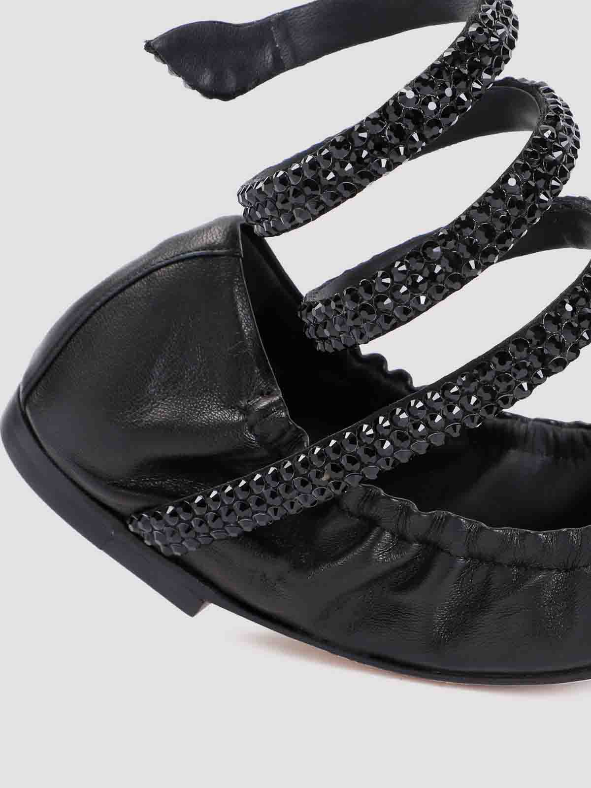 Rene caovillaのブラックラムレザーバレリーナ。ラムレザーのブラックヴァンプ、丸いつま先、ゴムトリム、ブラックトーンのクリスタルで飾られた足首周りのシグネチャースネークストラップ、ブランドインソールとアウトソール。