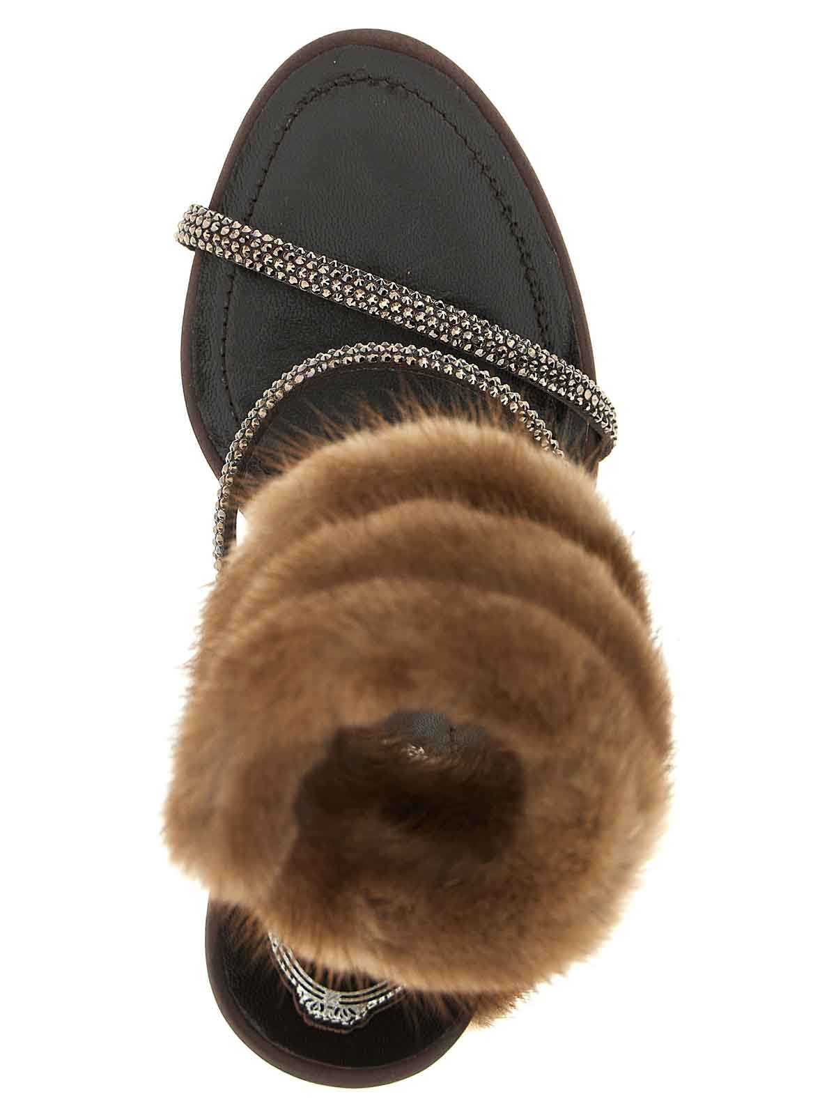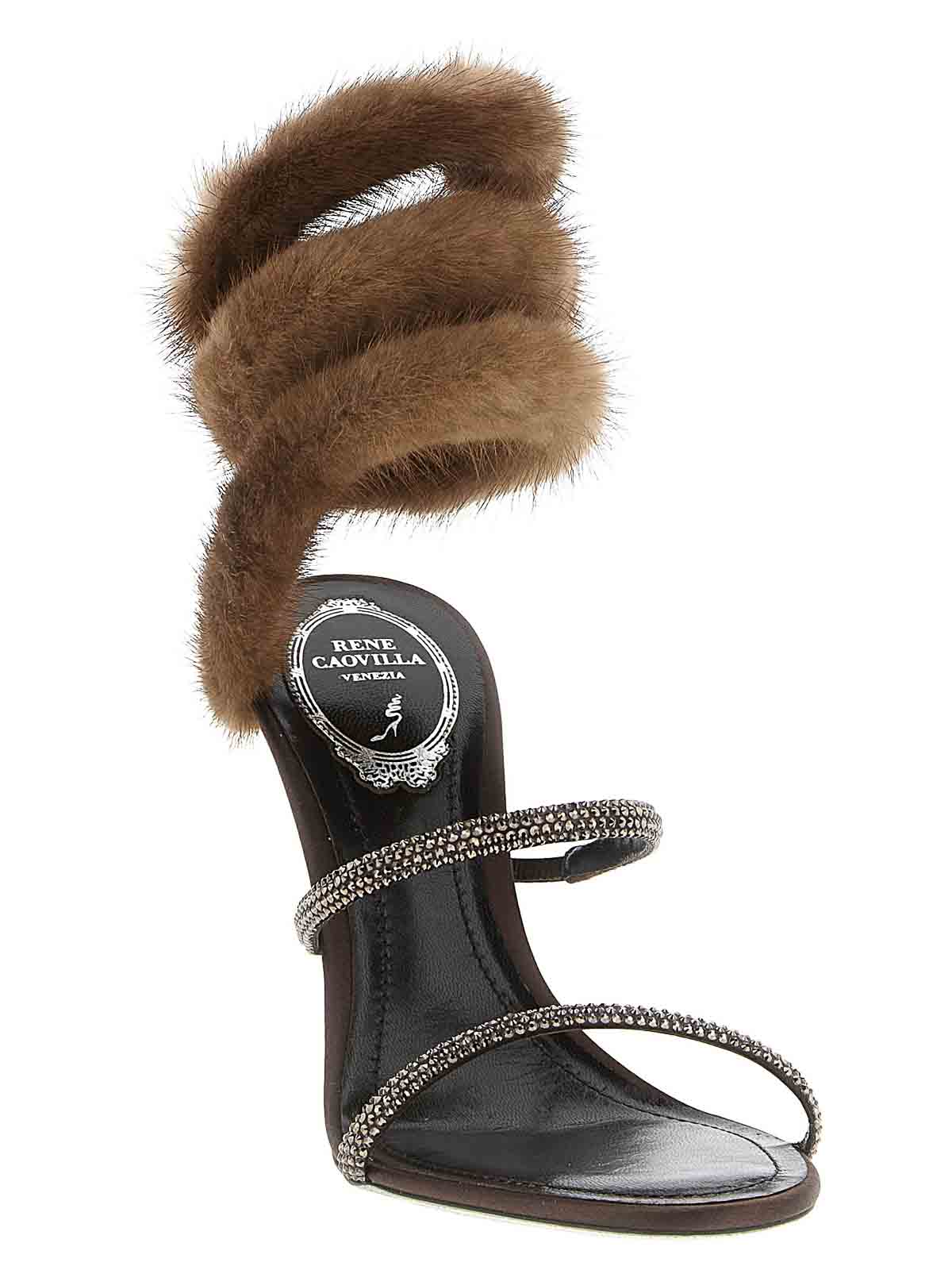 ストラップにラインストーンをあしらったリンジーのサテンサンダル、ミンクファーで覆われた足首を包むバンド、ヒール、スターダストソール。