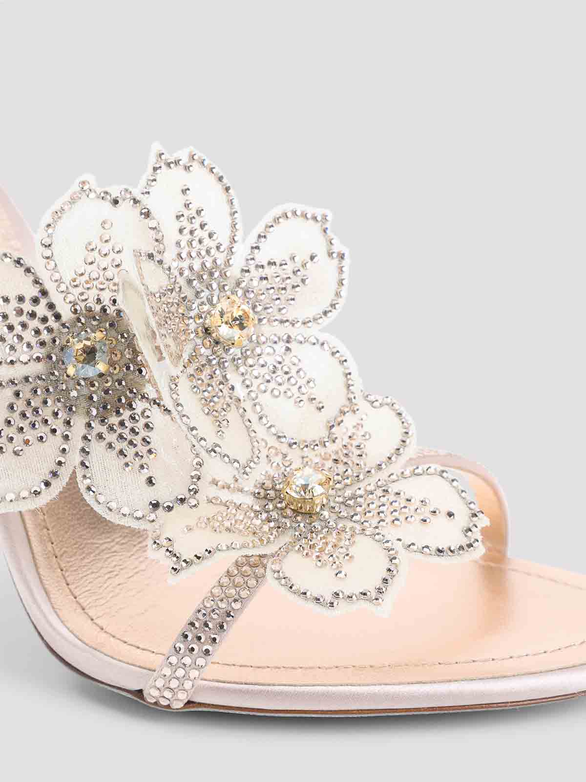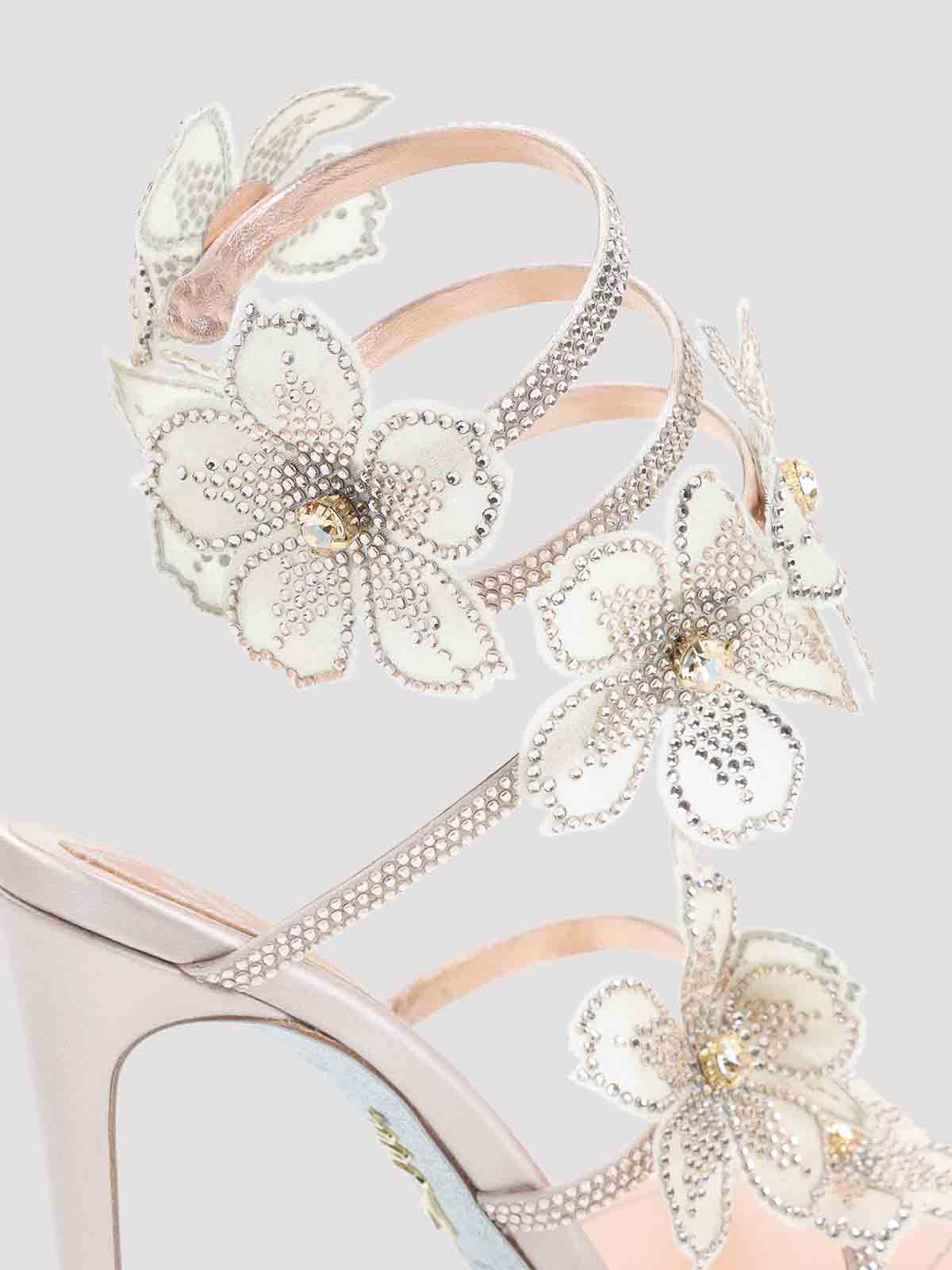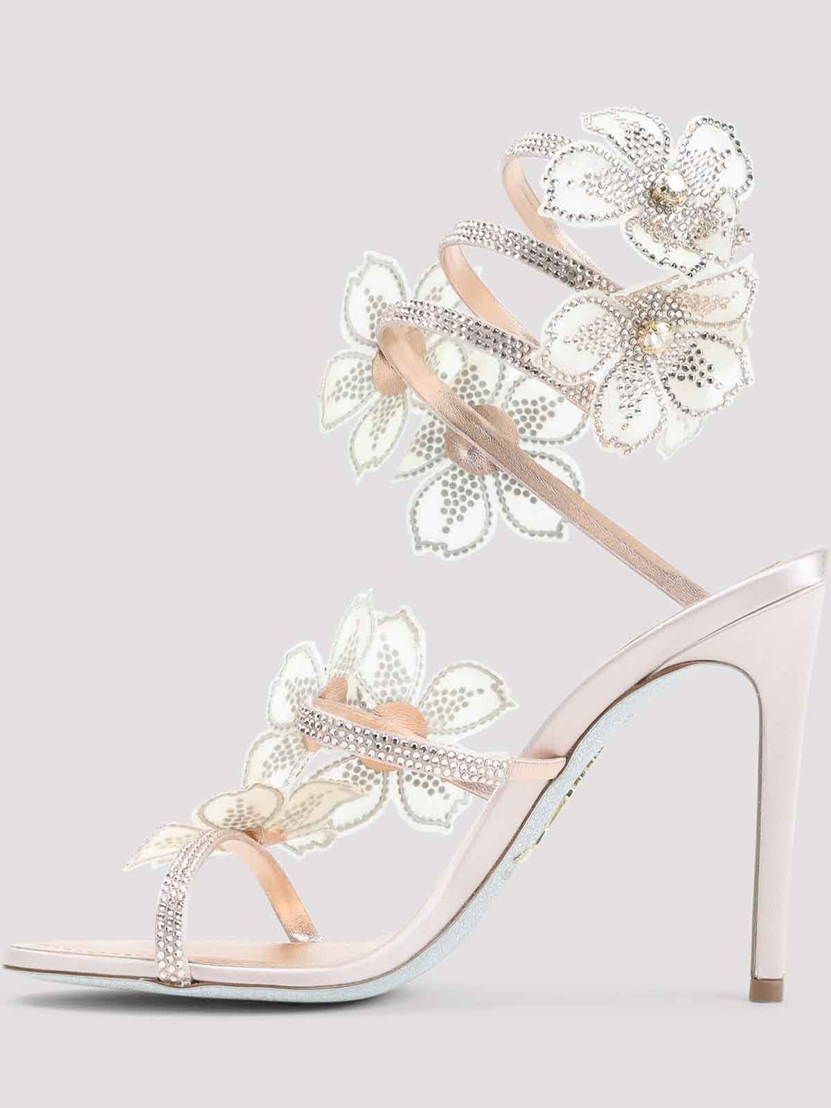 Rene caovillaレザーピーチフラワーサンダル。ピーチフラワーの装飾と手作業でラインストーンをあしらったサテンとレザーのアッパー。ハイヒール、レザーソール、インソール。