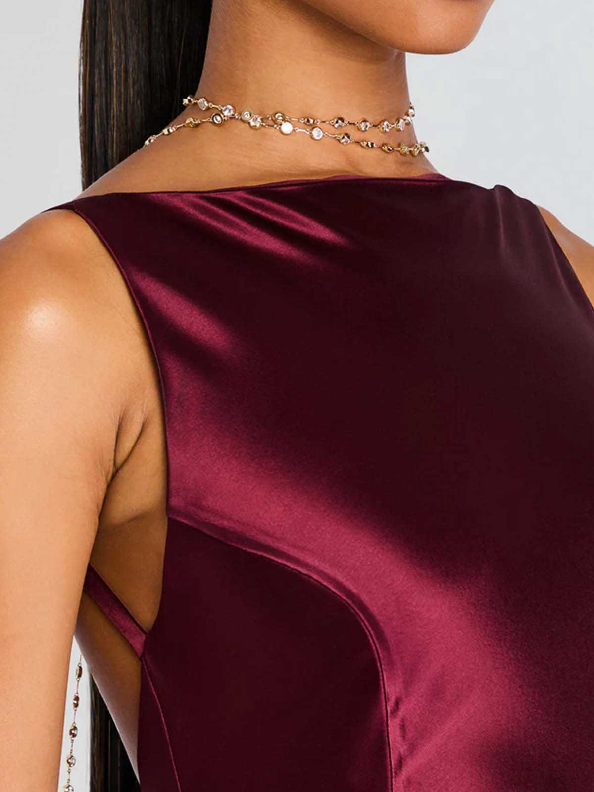 ロングモデル、細いショルダーストラップ、スクープネック、隠しファスナー、フルレングスのバックフリル。組成 76% アセテート、24% ポリエステル