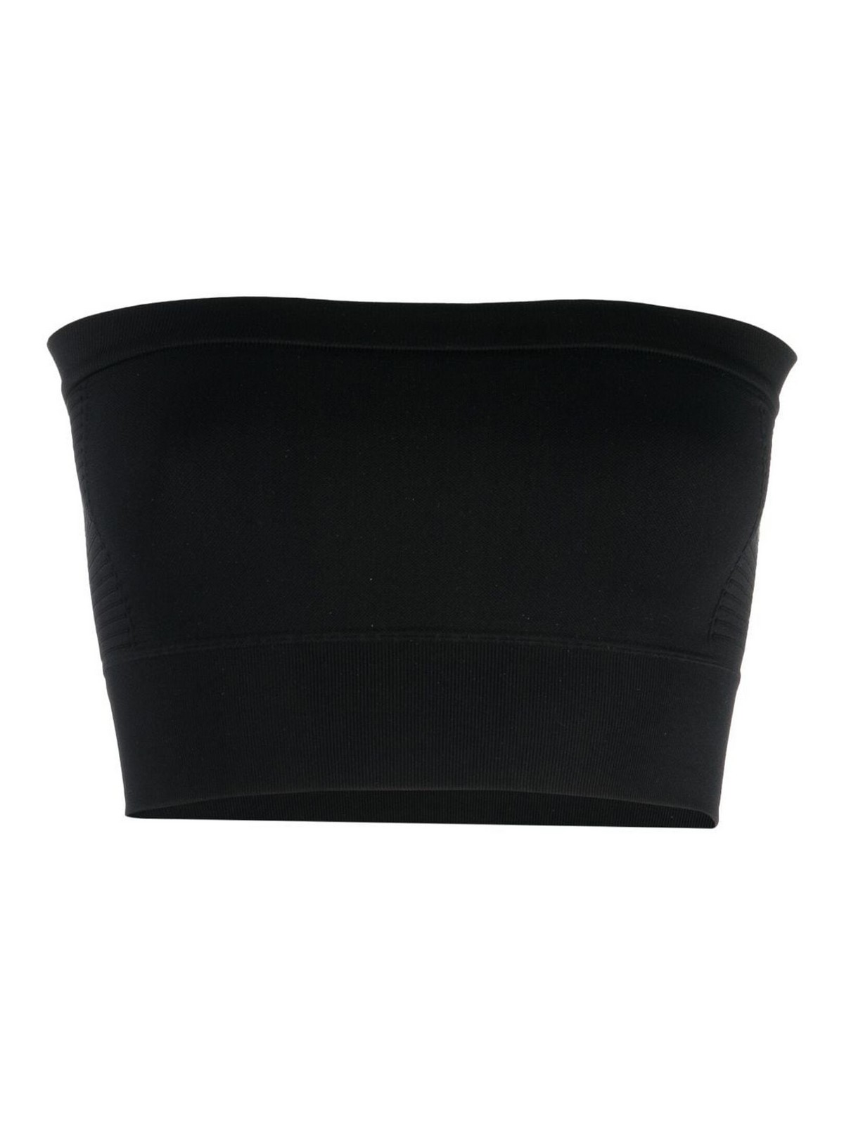 rick Owensのストラップレスニットストレッチトップは、黒のストレッチデザインのニット構造、ボディコンデザイン、バルドーネックライン、ストラップレス、クロップド、リブ編みの裾が特徴です。