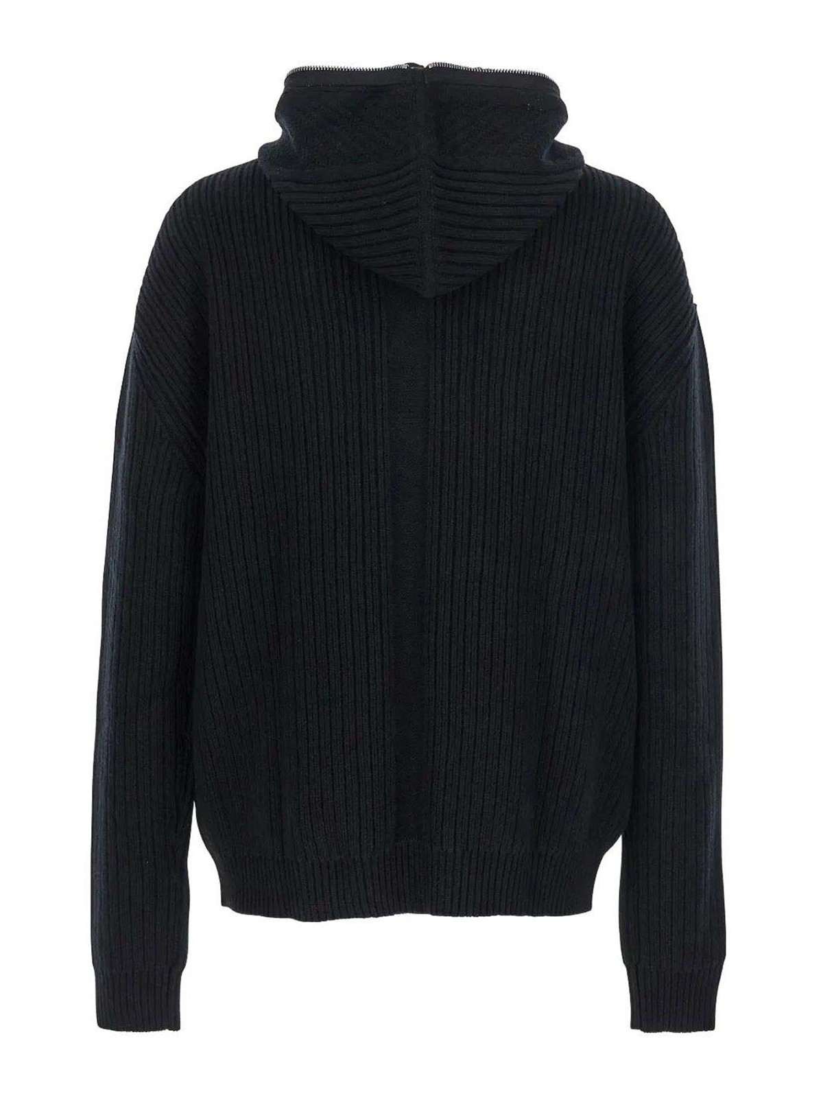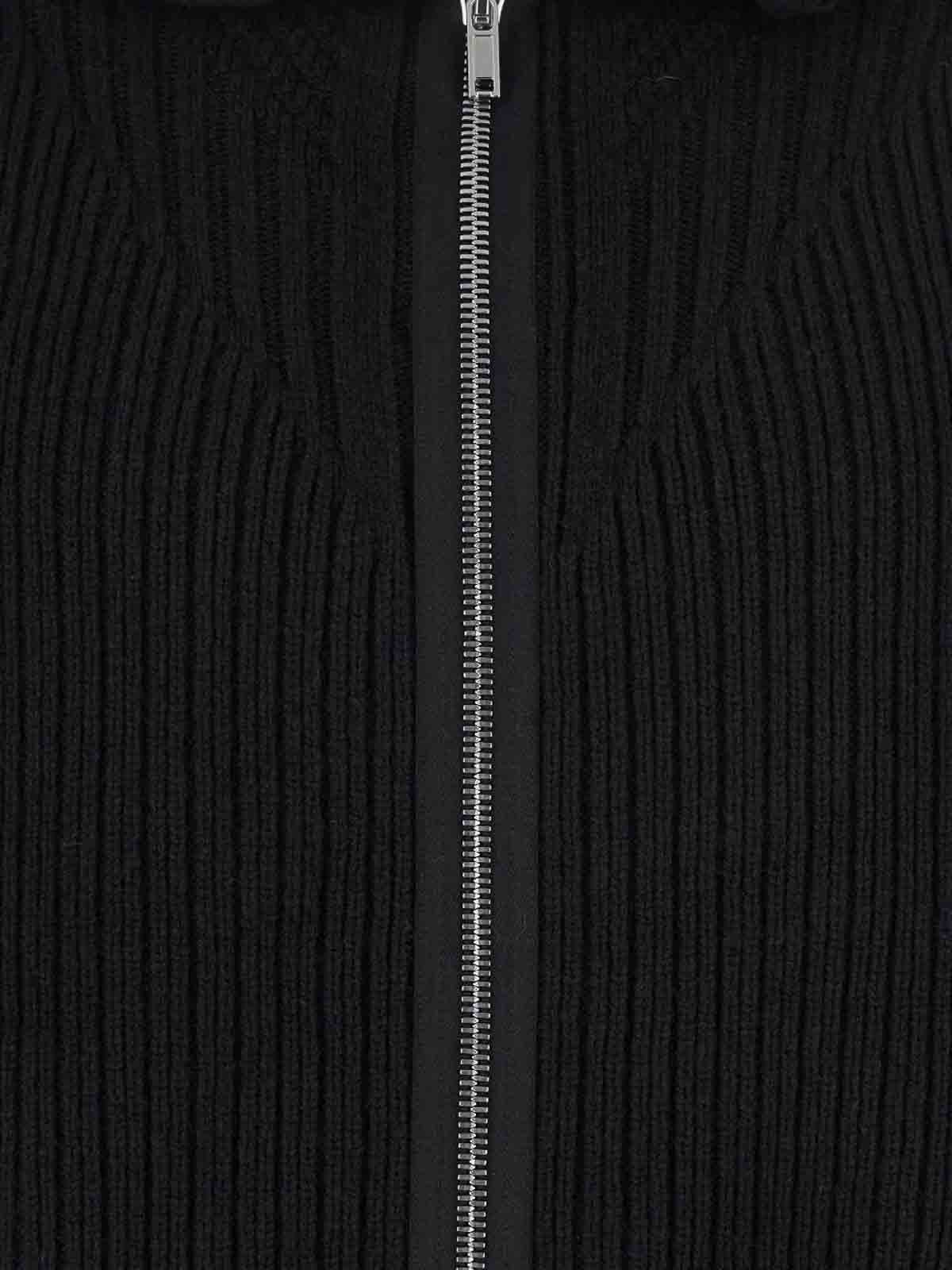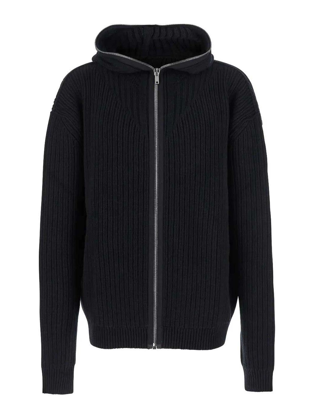 ブラック、リブニット、フルファスナー、フード付きネックライン、ロングスリーブ