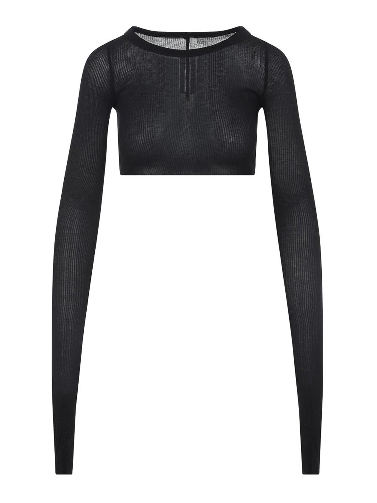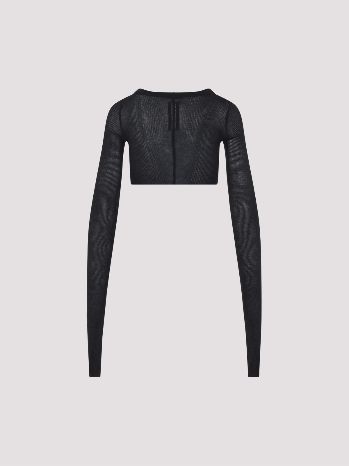 Rick owens LS クロップブラックビスコーストップ。軽量ブラックビスコースとシルクのリブ編みロングスリーブトップ。ラウンドネック、背中のアイコニックな中央トップステッチ、スリムフィット、クロップド丈が特徴です。
