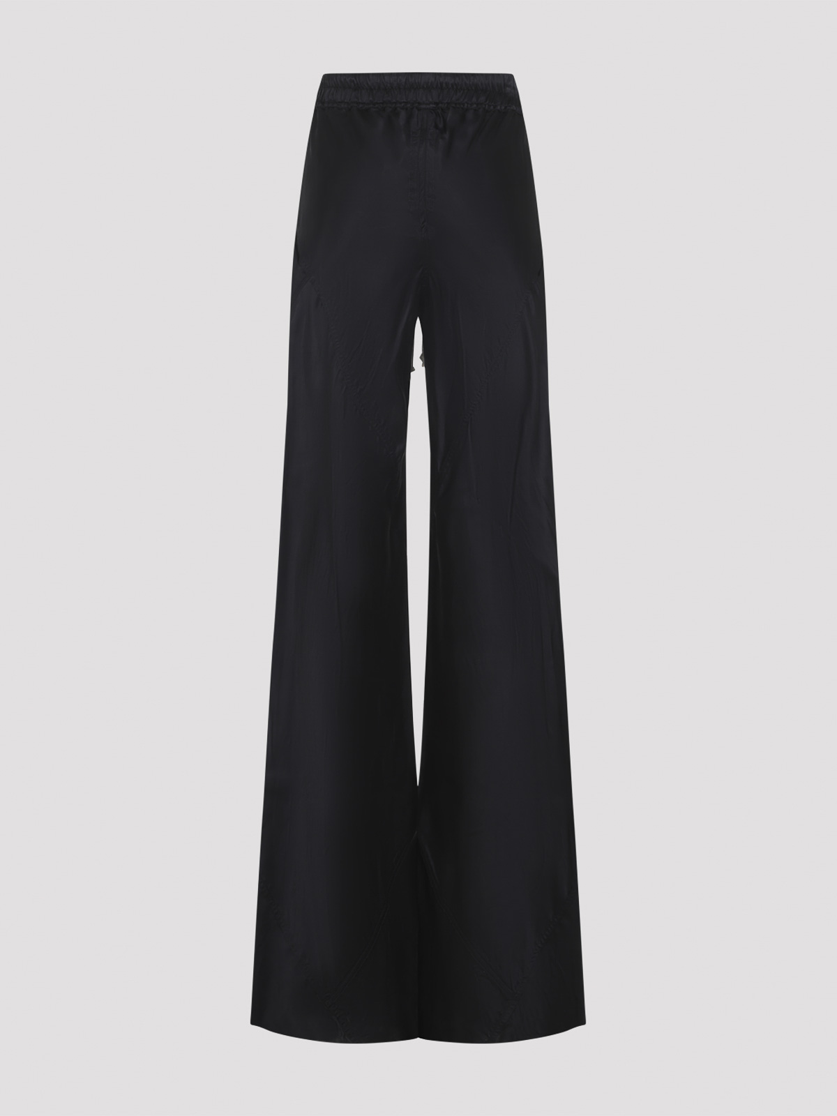 Rick owens ドローストリングバイアスブラックキュプラパンツ。ブラックの半光沢キュプラ製で、アイコニックなドローストリングが付いた伸縮性のあるウエストバンド、低いクロッチ、脚に沿って斜めのトップステッチを施したバイアスカット、サイドポケット、ワイドレッグ、フロアレングスが特徴です。