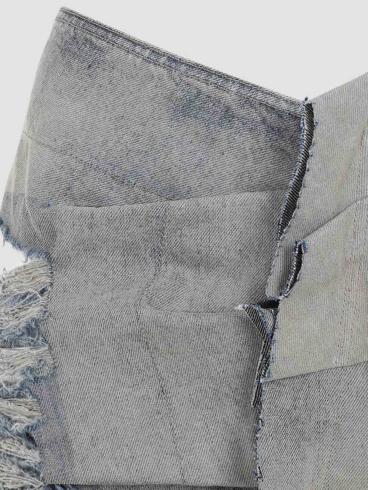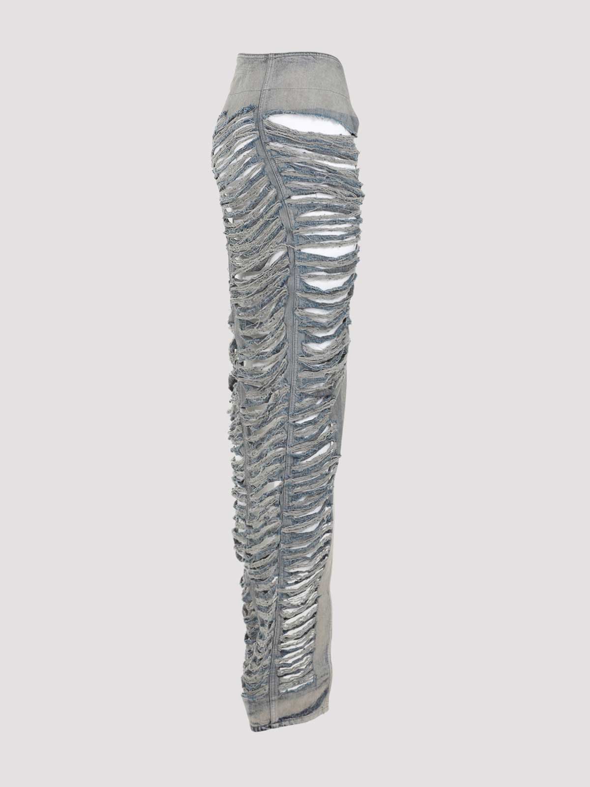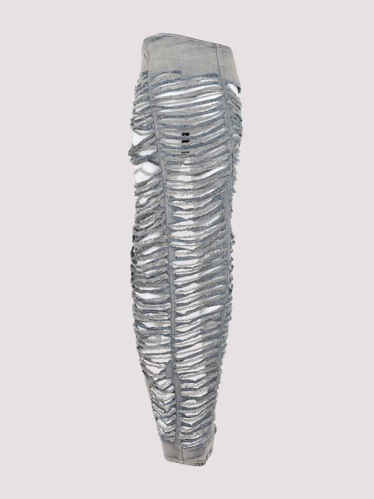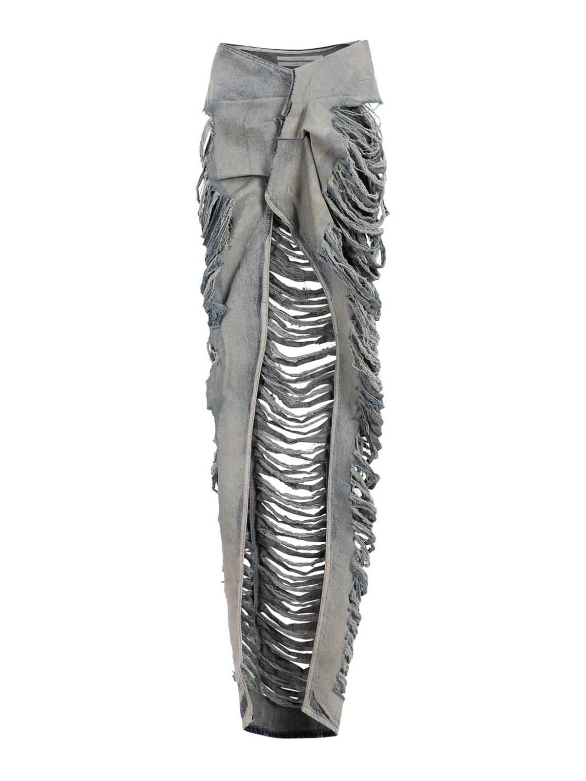 Rick Owens ハスラーブルーシュレッドコットンエッジスカート。ピュアブルーコットンスカート、Vウエスト、フロントファスナー開閉、フロントスリット、全面にカットアウトのディテール、足首までの長さ、アシンメトリーヘム。オーバーユース効果。