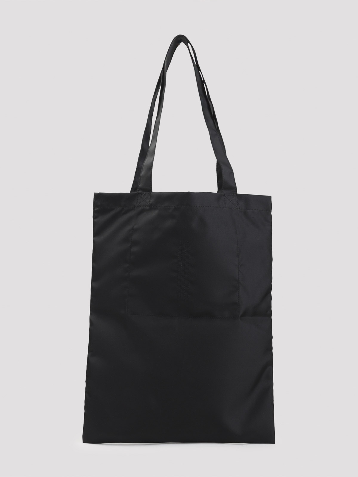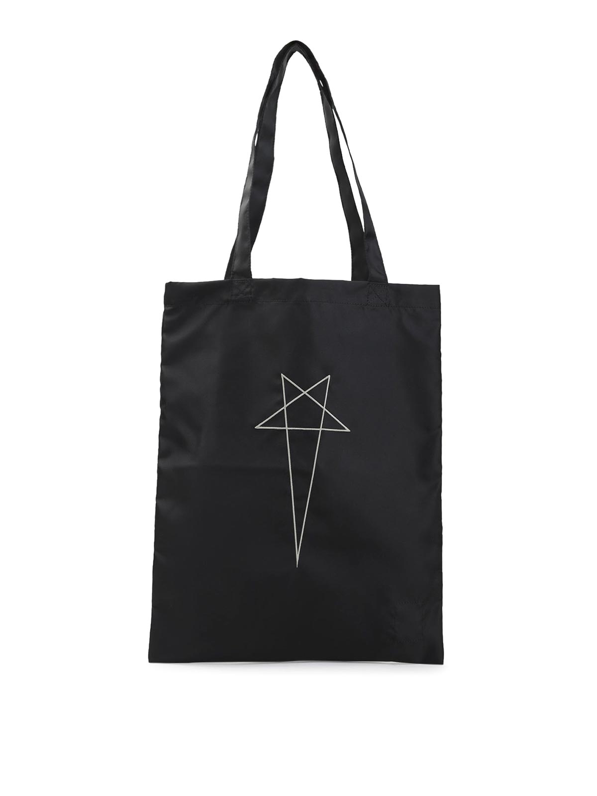 Rick owens drkshdw ブラックナイロントートバッグ。ブラックナイロン製のショッパーバッグ。トップハンドル2本、コントラストの効いた白い五芒星、背面の象徴的な中央のトップステッチが特徴です。