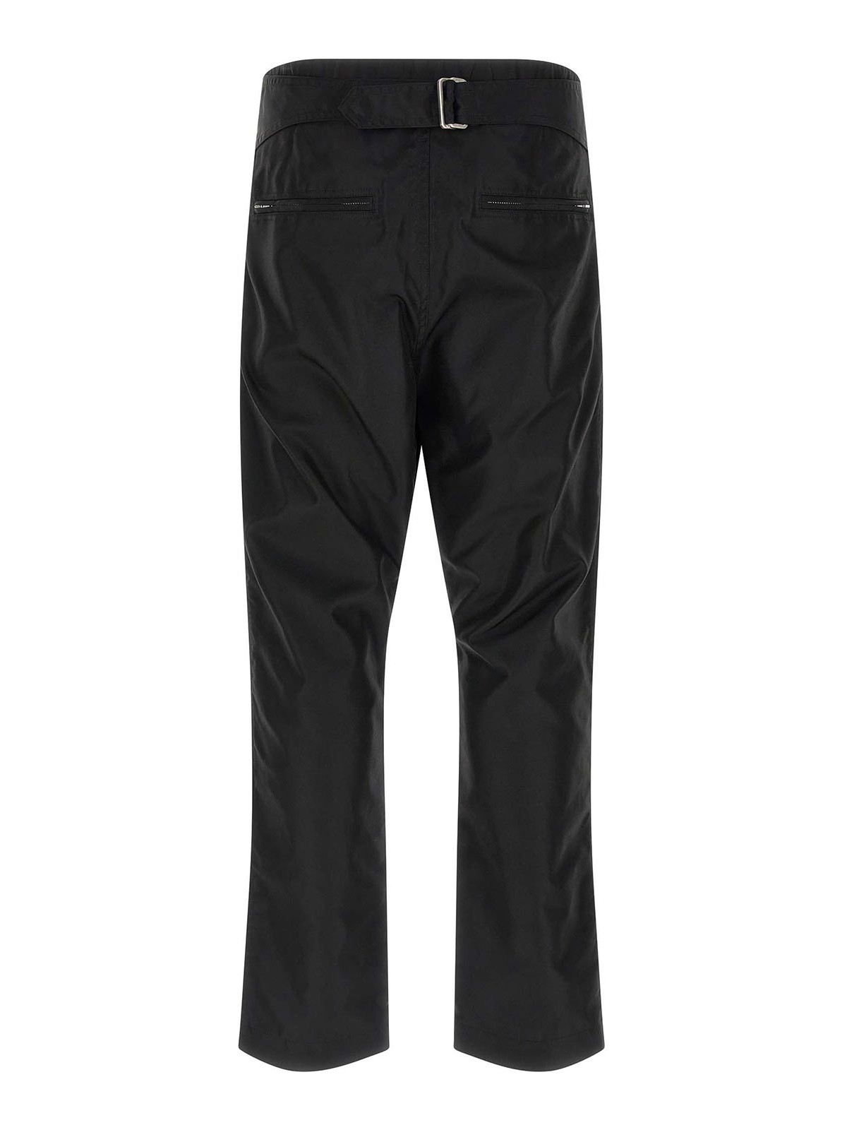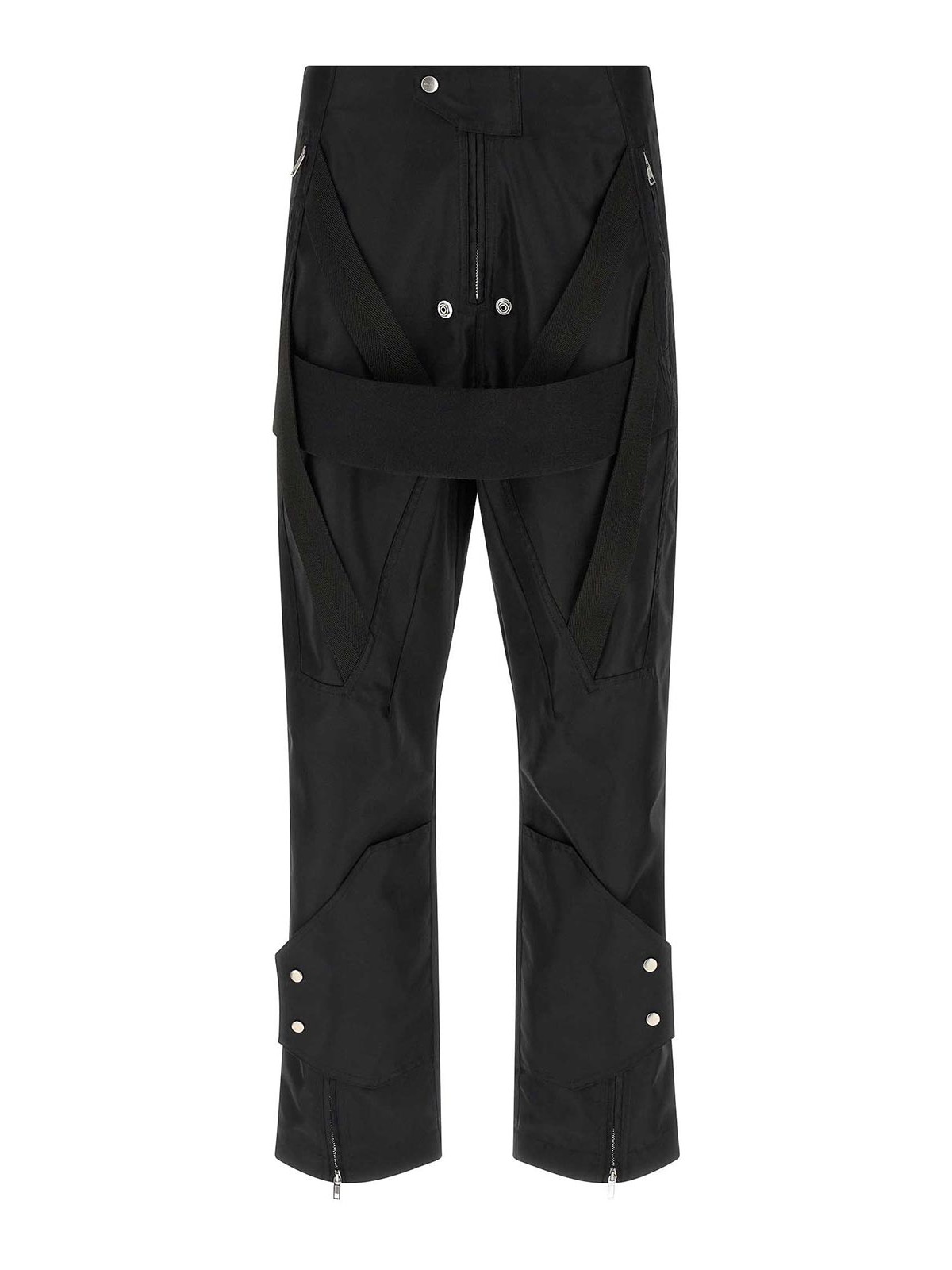 カリカリでコンパクトな質感のナイロンキャンバスの「メガストラップ付きモトパンツ」パンツ。ハイウエスト、テーパードレッグ、各太ももに2本のストラップ、股下のすぐ下で太ももをつなぐ幅広のストラップ、フロントジッパーとスナップボタン留め、ポケット、伸縮性のあるウエストバンド、後ろに調節可能なストラップ、脚の底にスナップボタン付きのジッパーとフラップ。