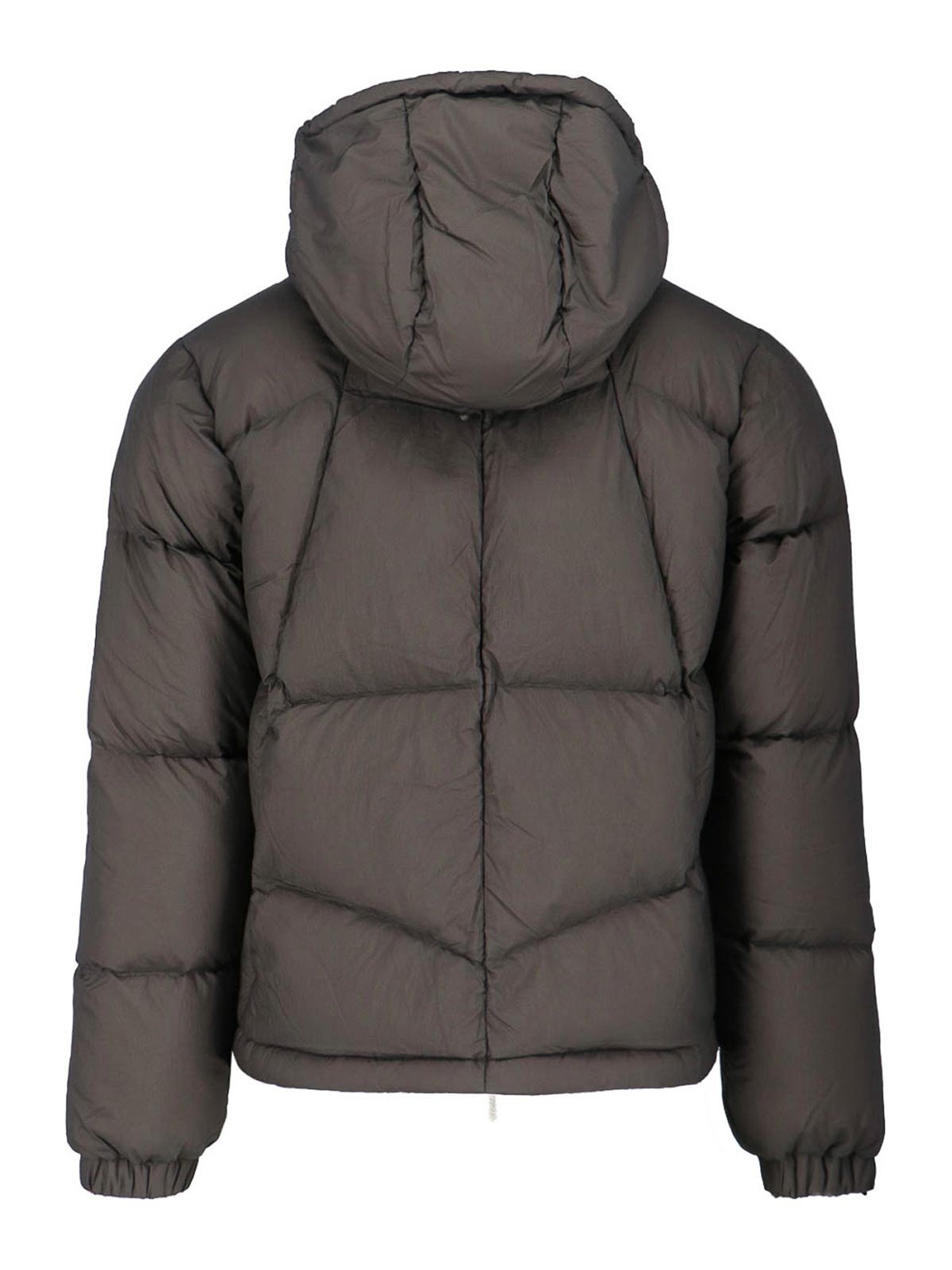 Kウェイリップストップダウンジャケット、グレー生地、キルティングとパッド入りデザイン、ドローストリングフード、ダブルジッパー、サイドポケット2つ、伸縮性のある袖口、裾にドローストリング、ストレートヘム。