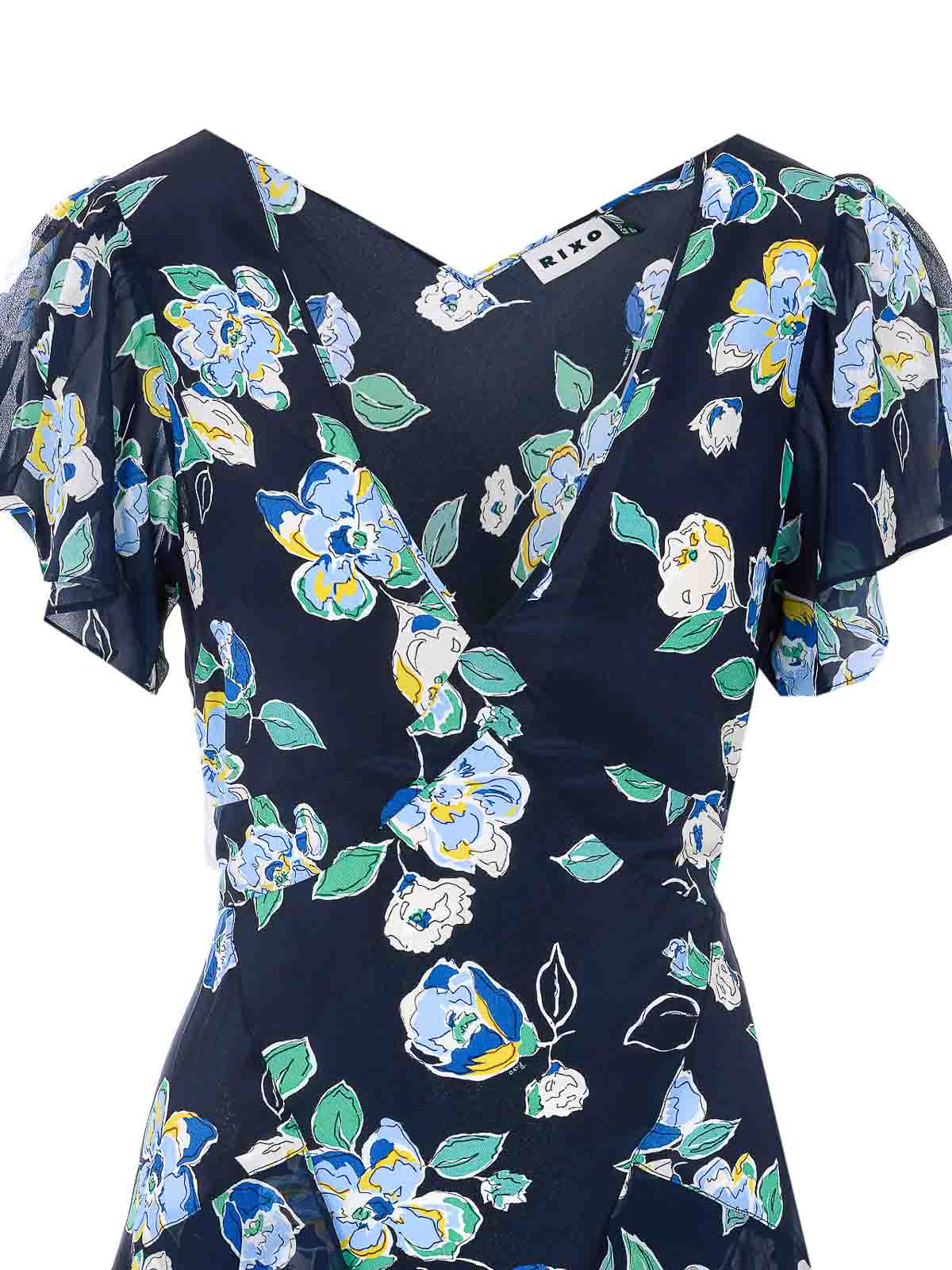 Rixo ブラックイーヴィードレス、Vネック、ショートスリーブ、花柄、レースクロージャー、ルーシュディテール