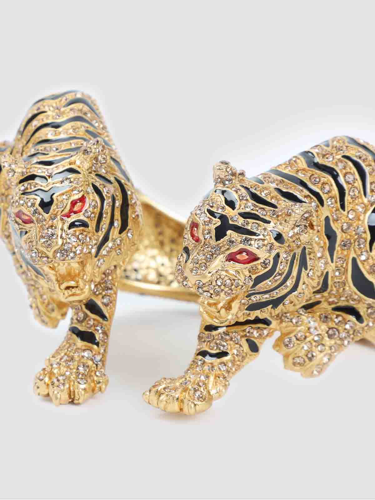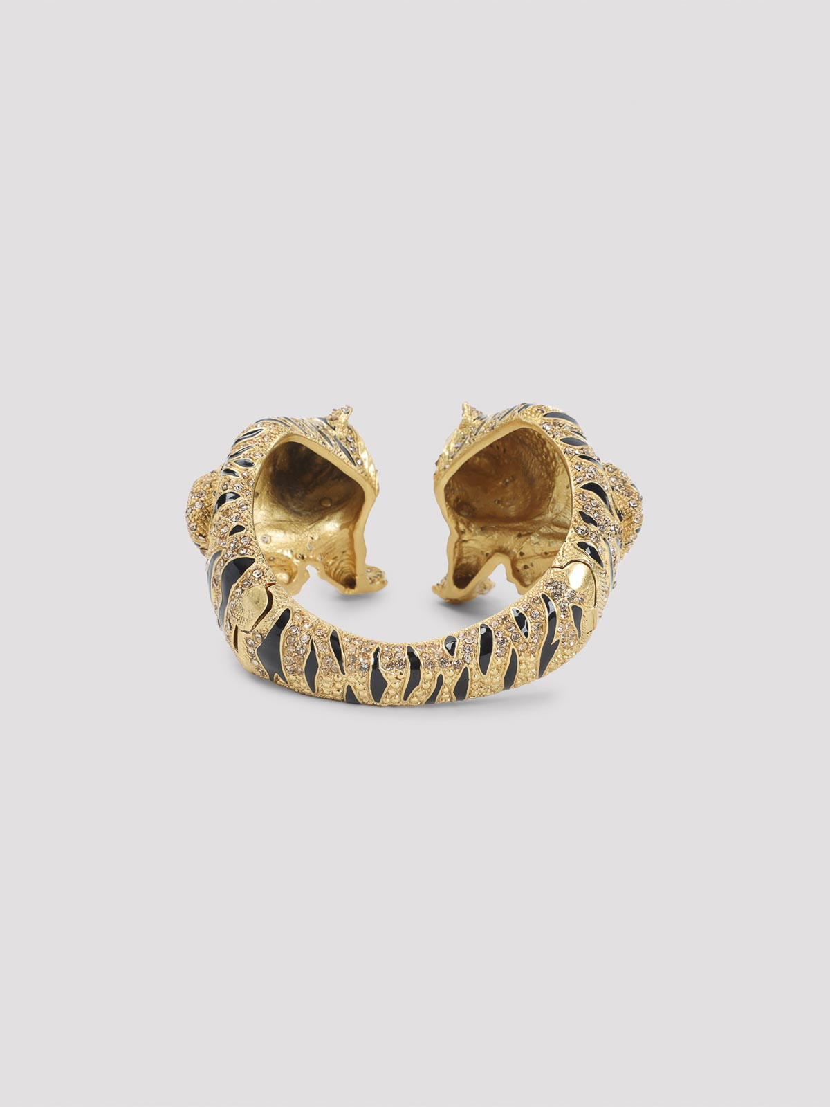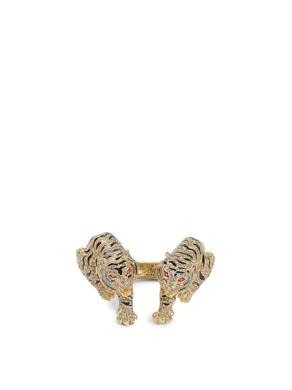 Roberto Cavalliゴールドメタリックブレスレット。ゴールドメッキブレスレット、オープンデザイン、フロント3D装飾タイガースディテール、ブラックエナメルディテール、クリスタルディテール。
