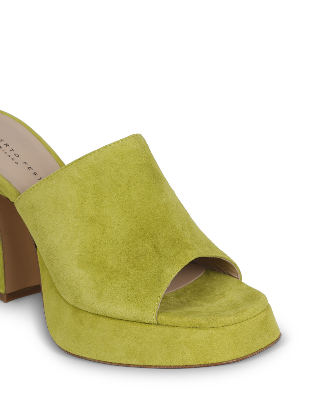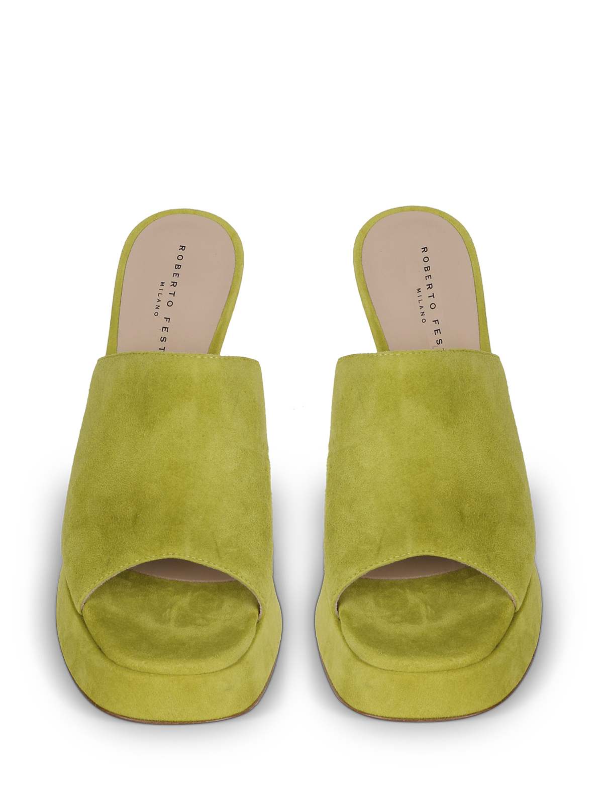 ロベルト・フェスタのスリッポンデザインのスエードミュール。オープントウ、ワイドヒール。