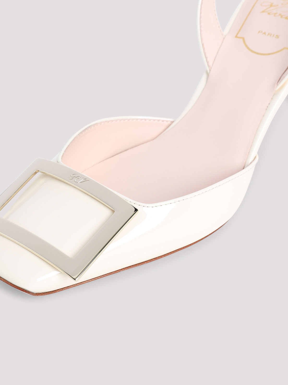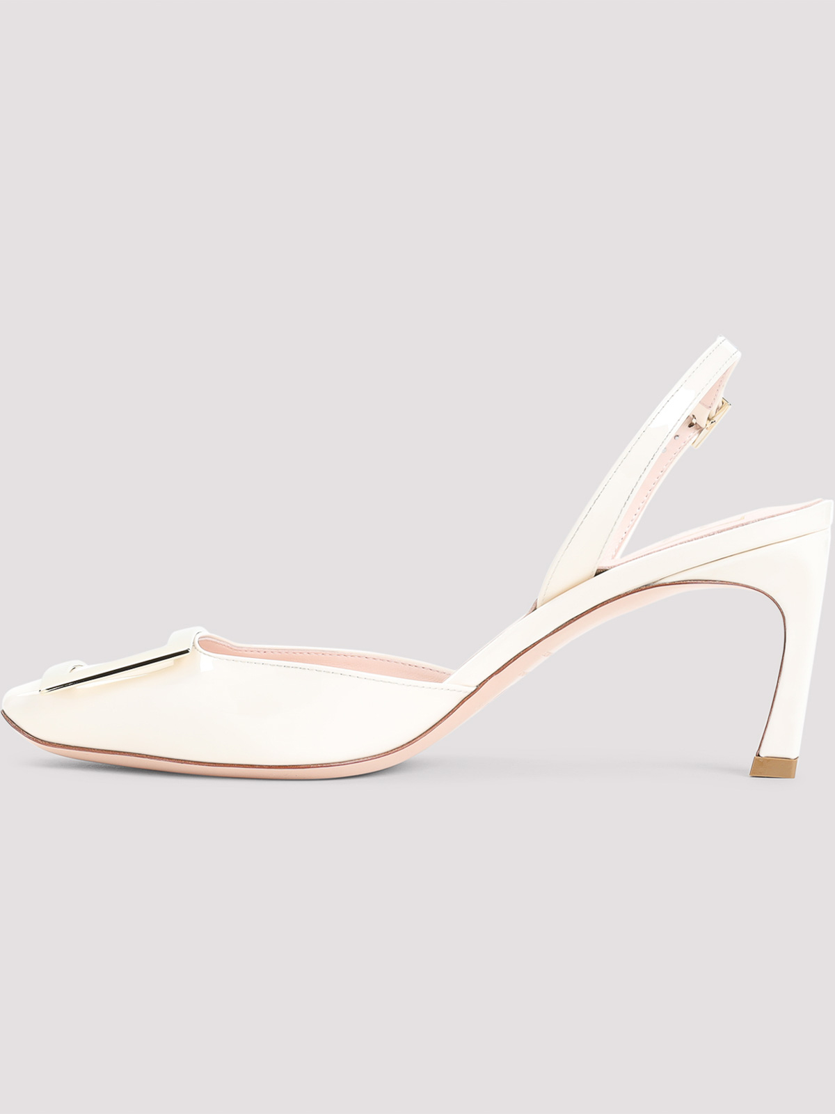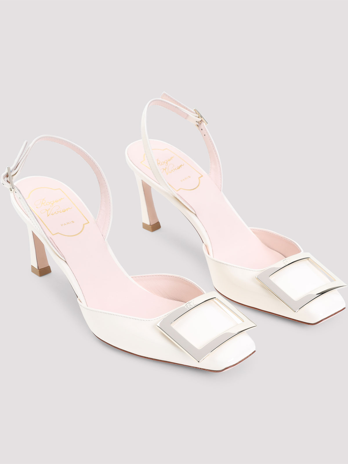 ロジェヴィヴィエトランペットメタルホワイトカーフレザーパンプス。ホワイトのパテントカーフレザー製、スリングバックデザイン、スクエアトゥ、トップにシルバートーンのメタルプラーク。背面にバックル付きの調節可能なストラップ、傾斜したヒール。レザーインソールとアウトソール。